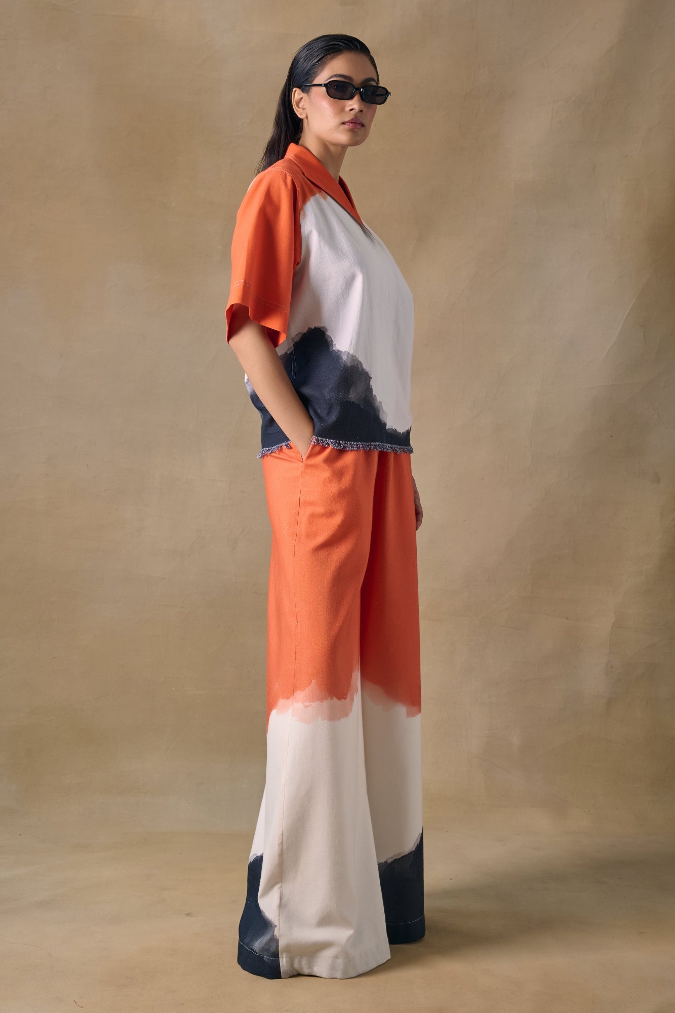 Hand drawn orange washed print, relaxed fit kaftan top with lapel collar, short sleeves and fringed hem paired with palazzo pants with elasticated waist band for a flexible fit.