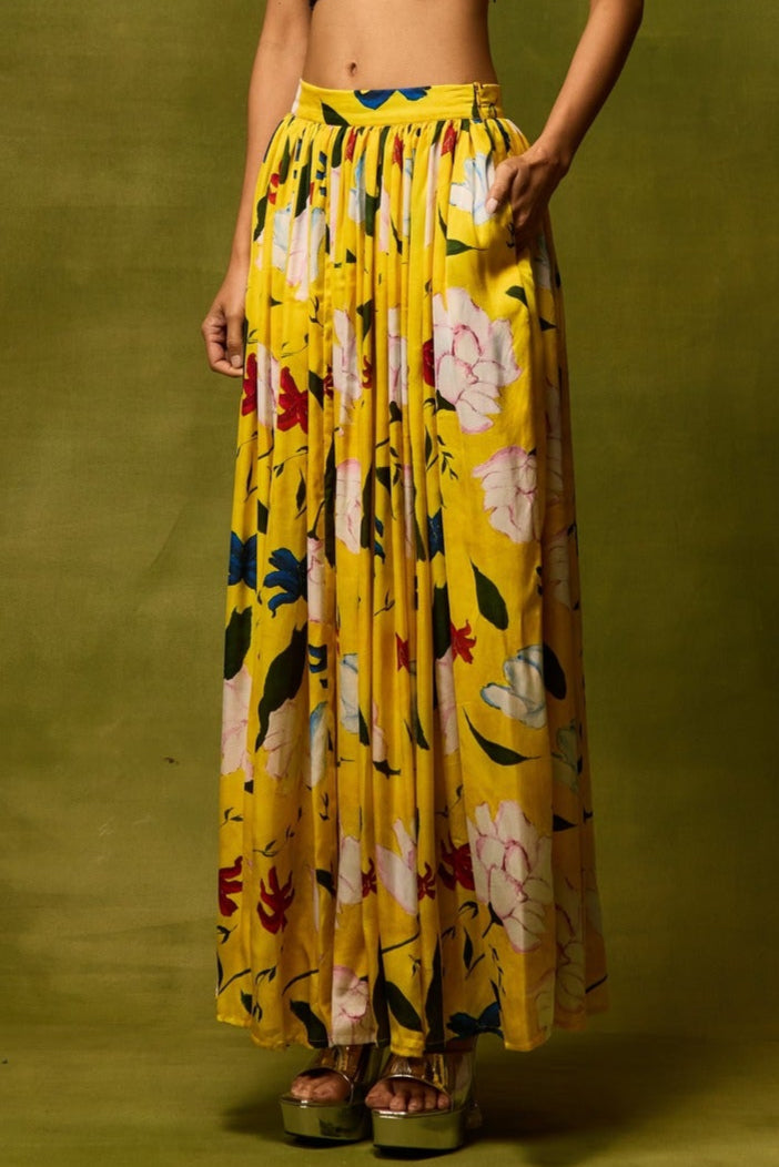 A flowy maxi skirt crafted in a bold yellow hand-drawn floral print. Designed with soft gathers at the waist for graceful volume and movement, this skirt is a versatile statement piece perfect for both day-to-evening styling.