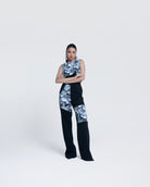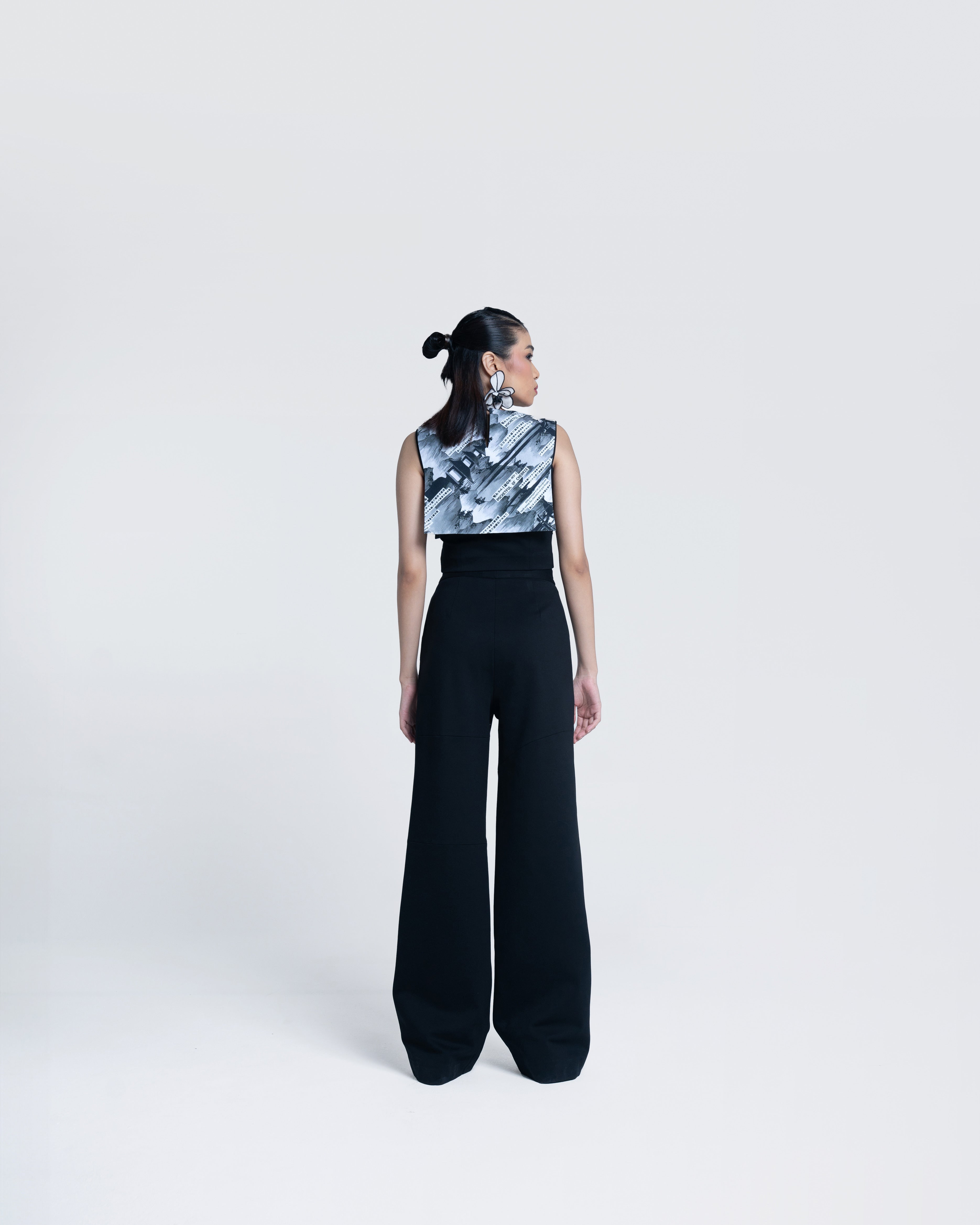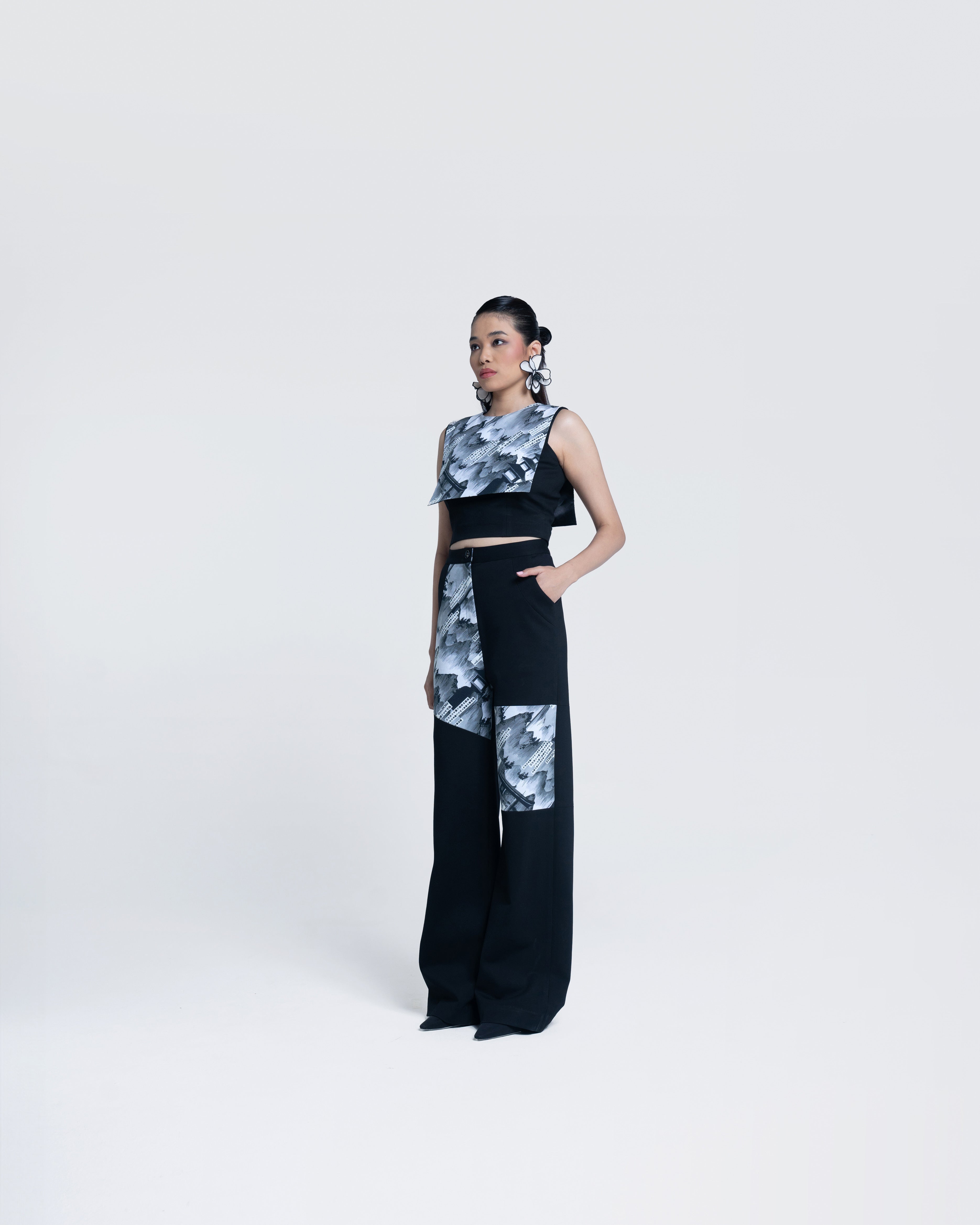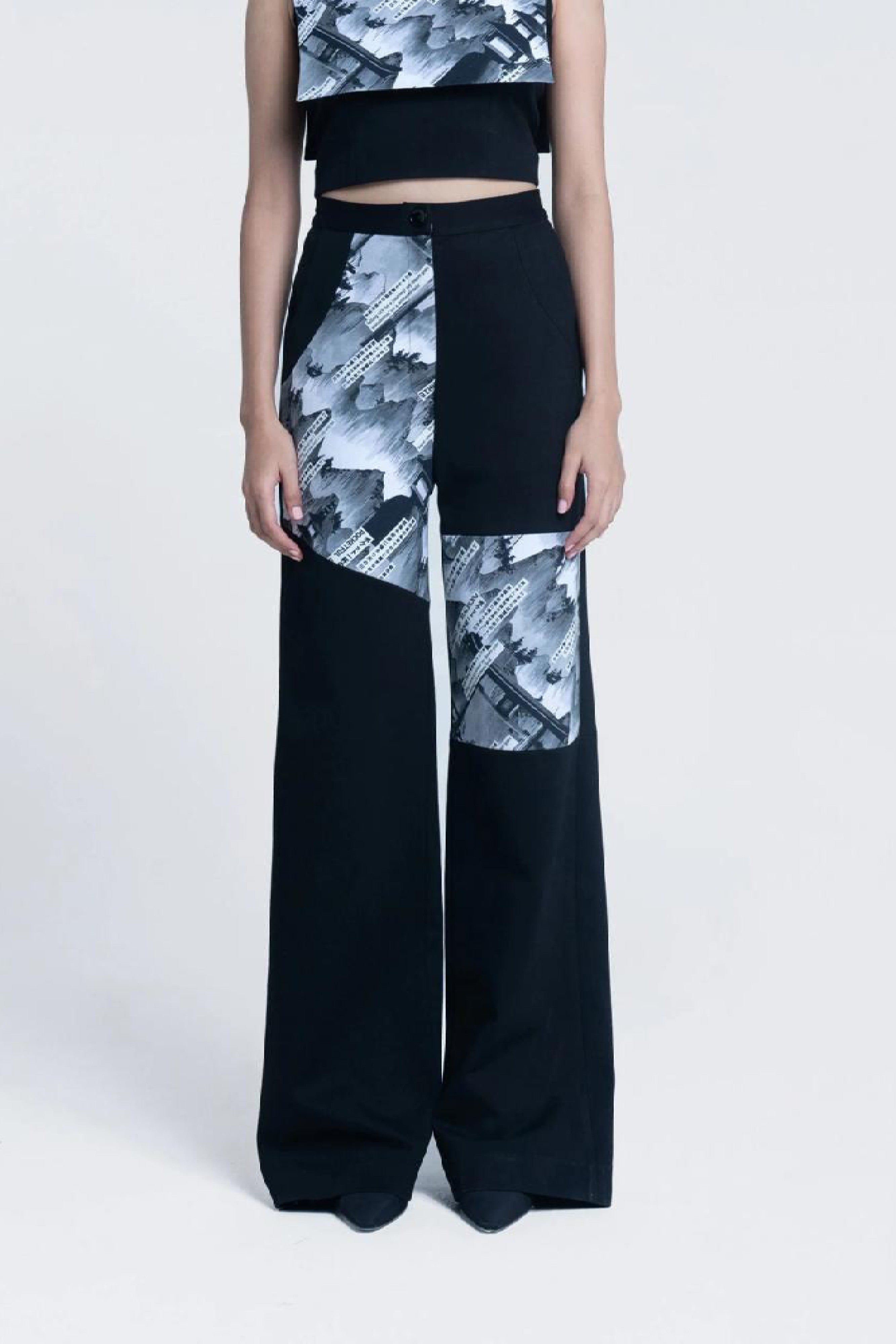Black block pants with button and fly zip closure featuring newspaper print and side pockets.