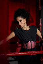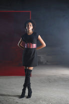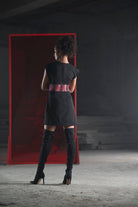 A drop-shoulder fitted dress with boat neckline, under bust PVC corset panel and deep side seam pockets. It is carefully hand embroidered with thread work showcasing the real love letters of lovers from the 20th century.