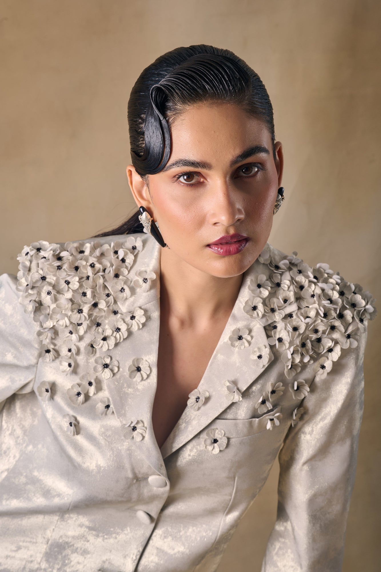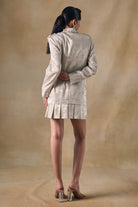 Gold foil single breasted mini blazerdress with notched collar, intricate 3D floral embroidery along the neckline and pleated hemline with snap button for multiurpose styling.