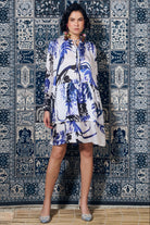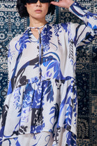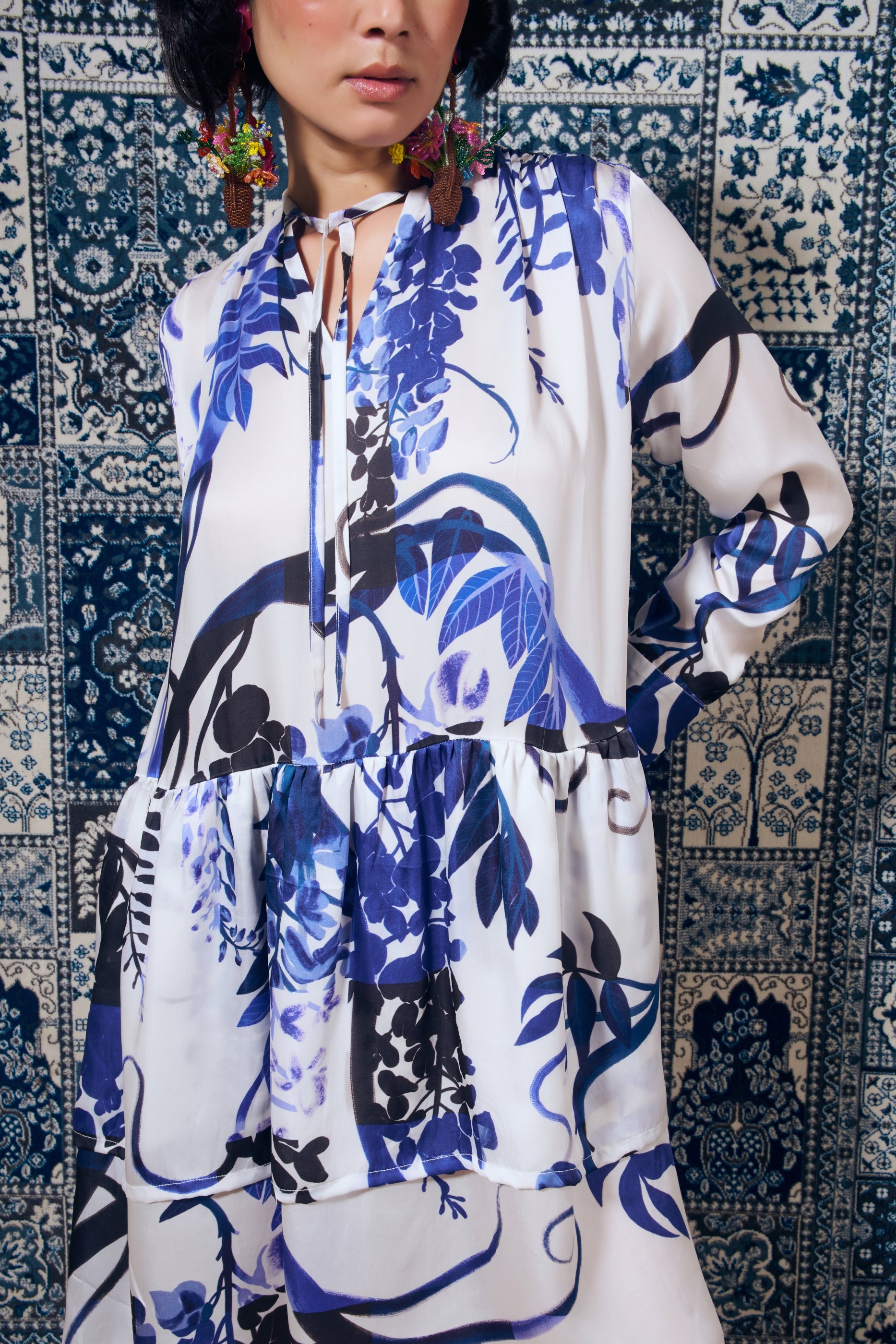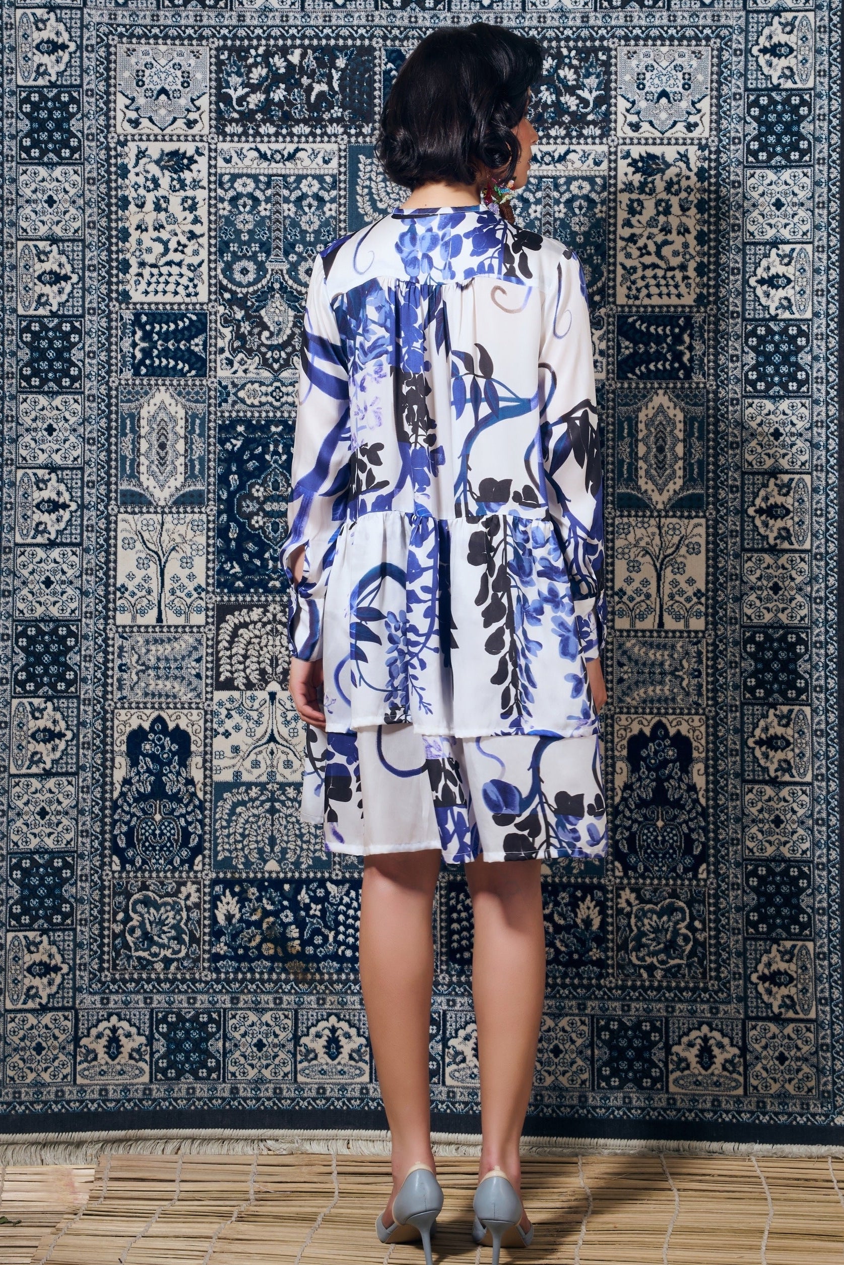 Hand drawn floral print white mini tiered dress with tie up neckline.