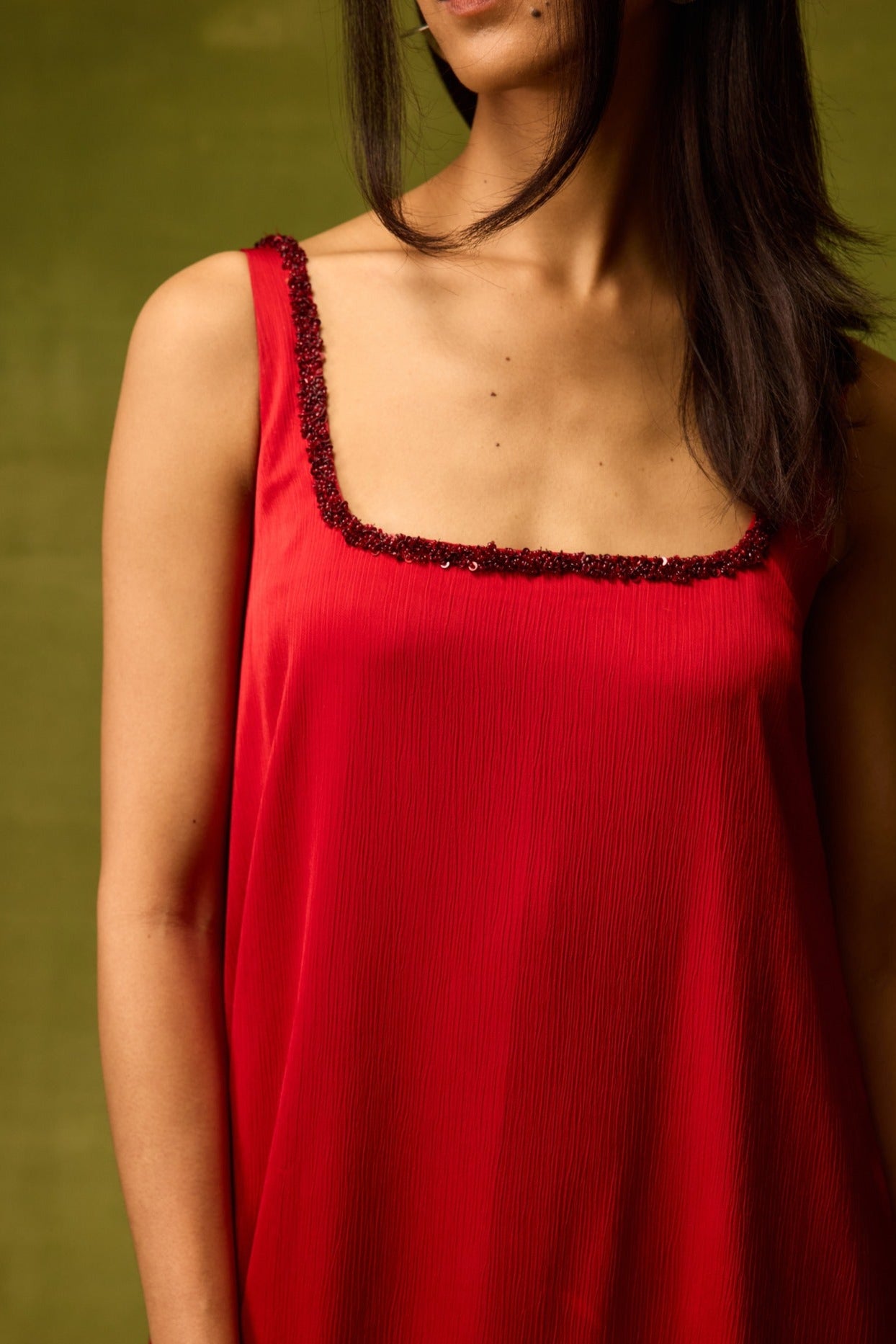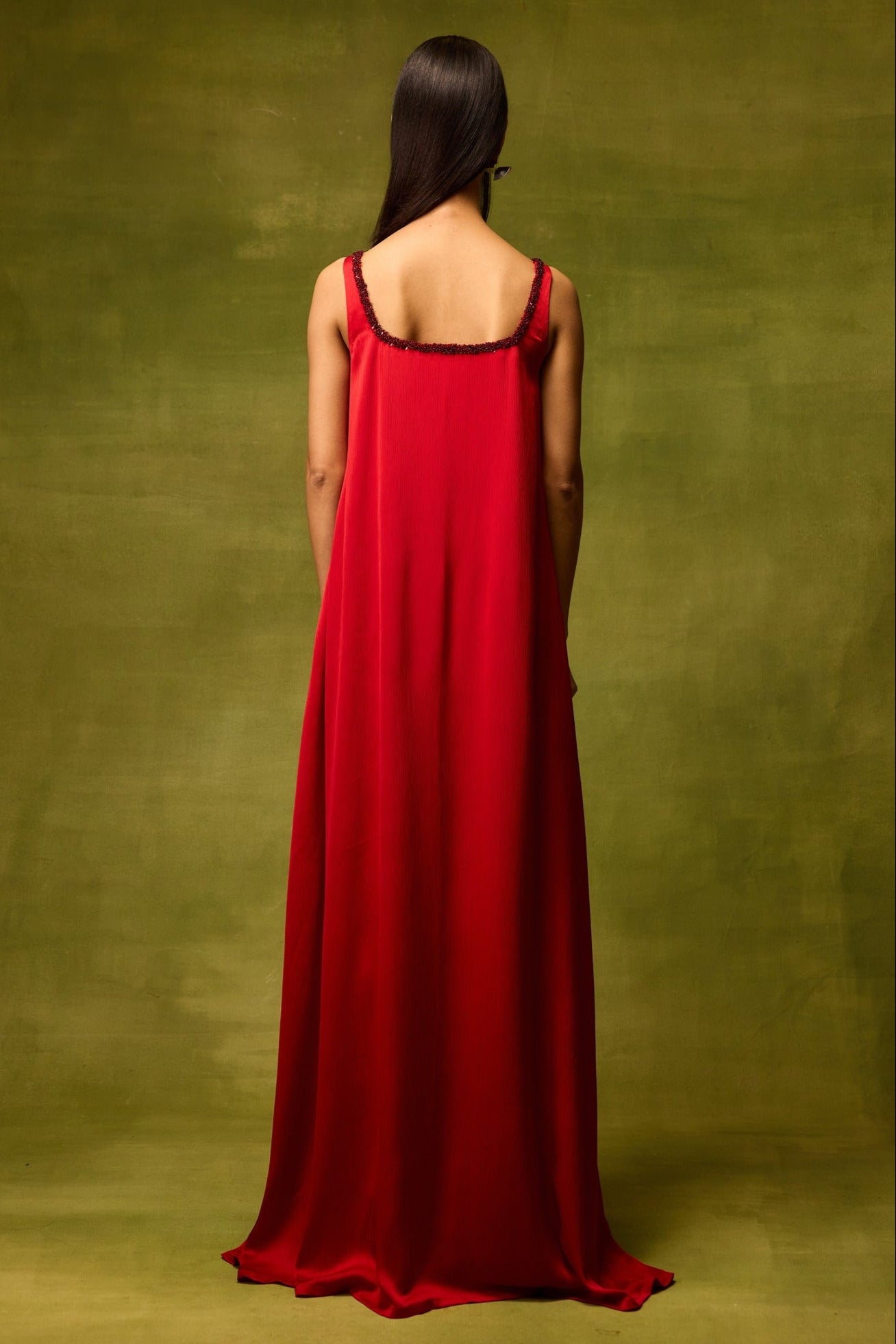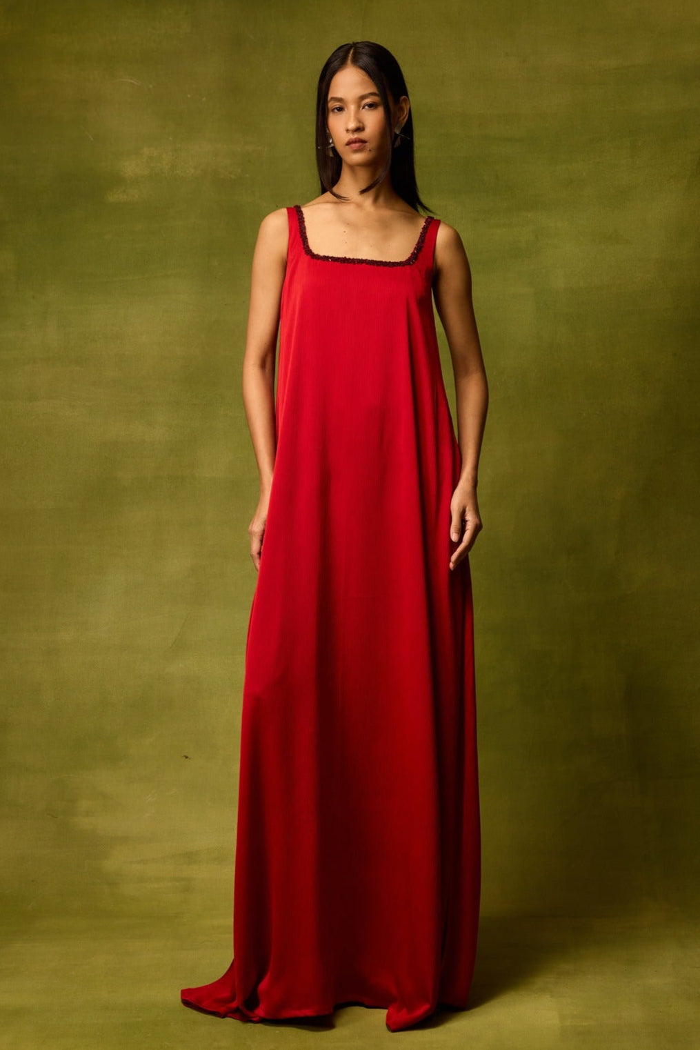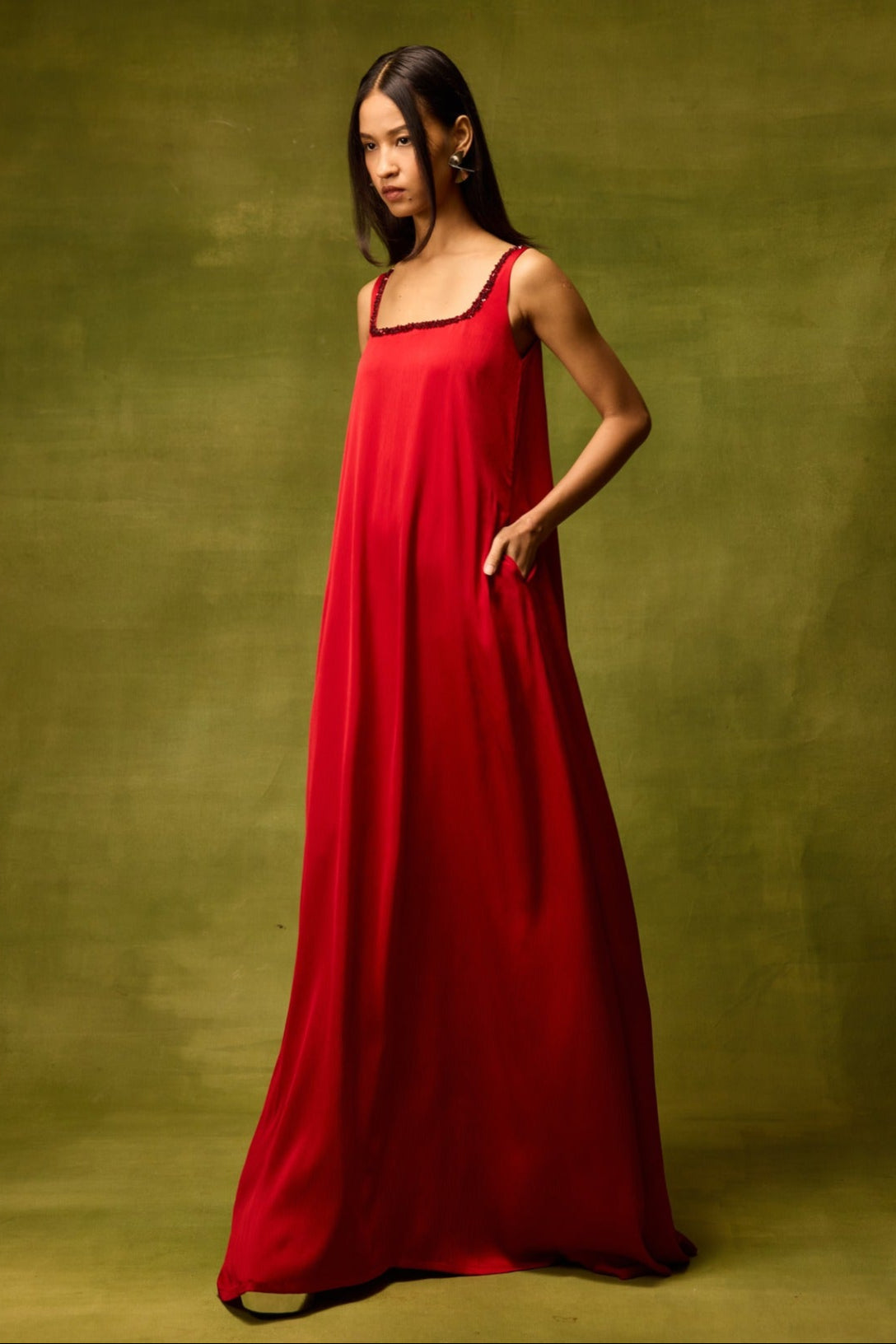 An elegant embroidered square-neck maxi dress crafted in a flowy red fabric. Designed with a relaxed fit and clean lines, it highlights simplicity and ease while offering hidden side pockets for a functional touch.