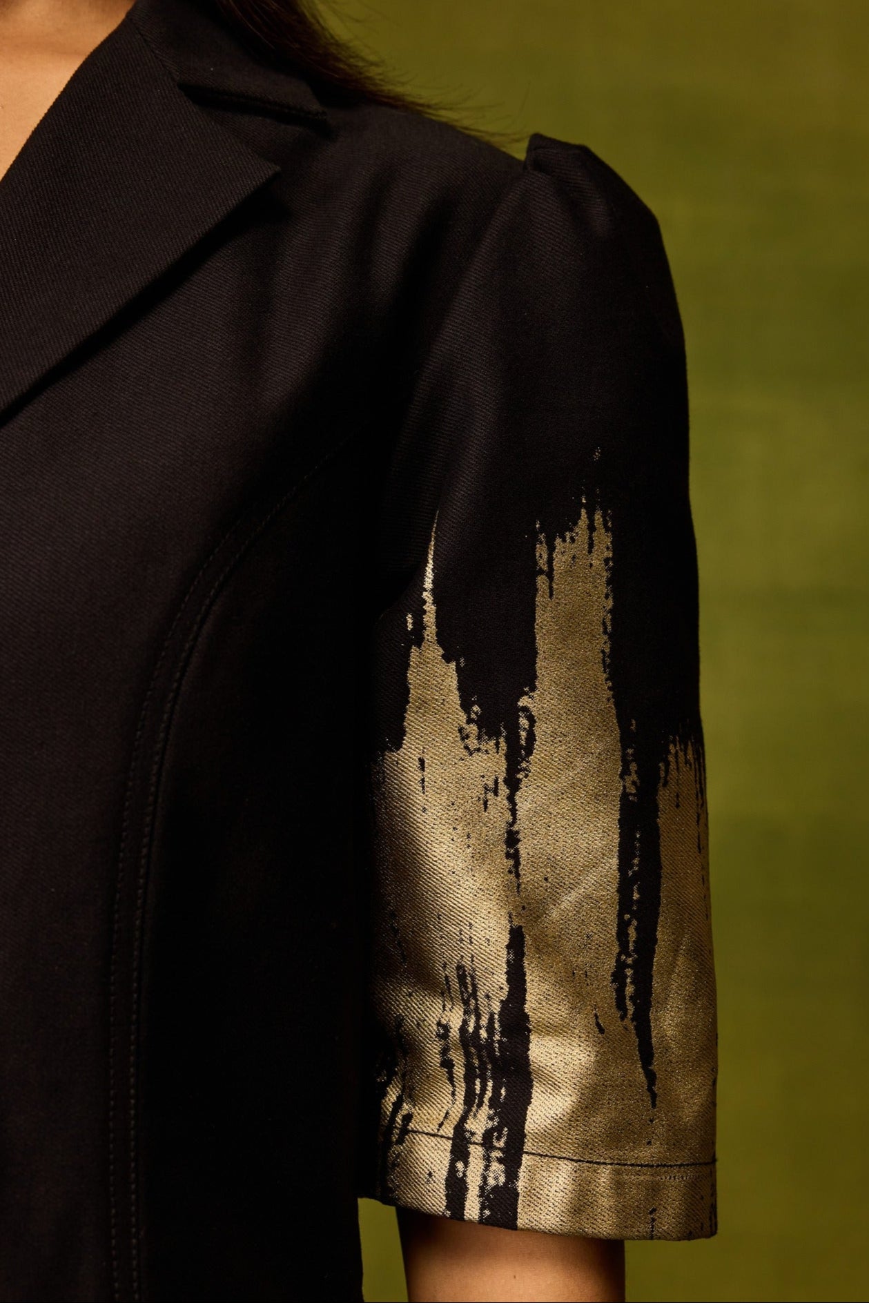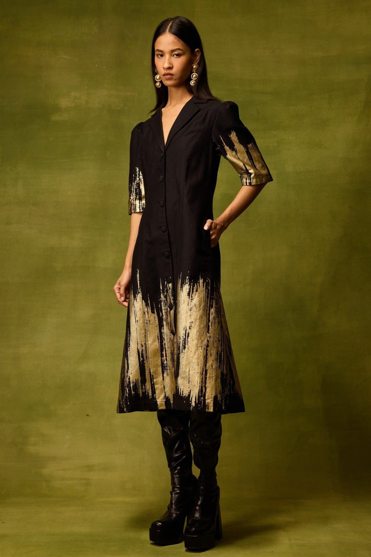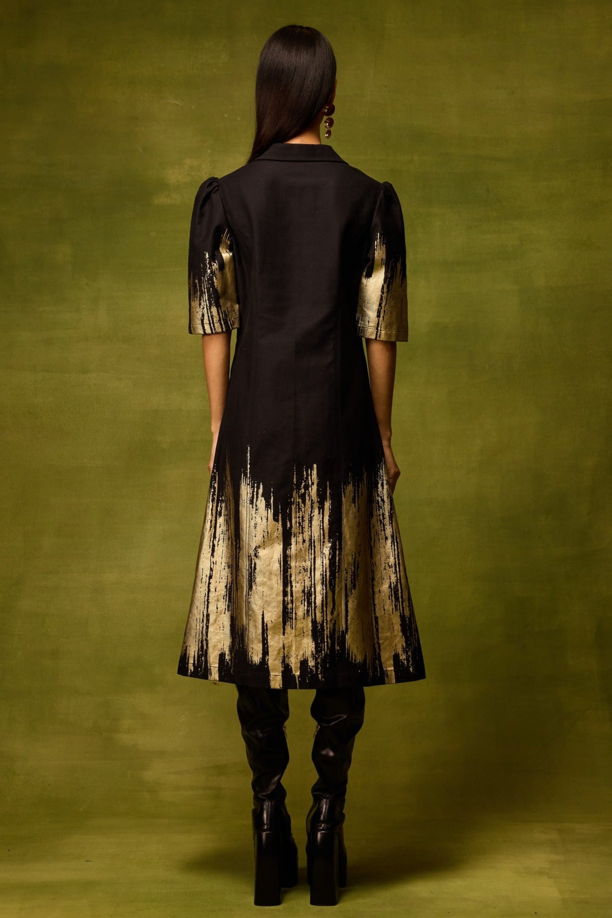 Elegance meets edge in this black midi dress featuring structured half-sleeves, a collared neckline, and a flared silhouette. The painterly gold foil along the hem and sleeves create a striking contrast, making it perfect for both cocktail evenings and contemporary festive occasions.