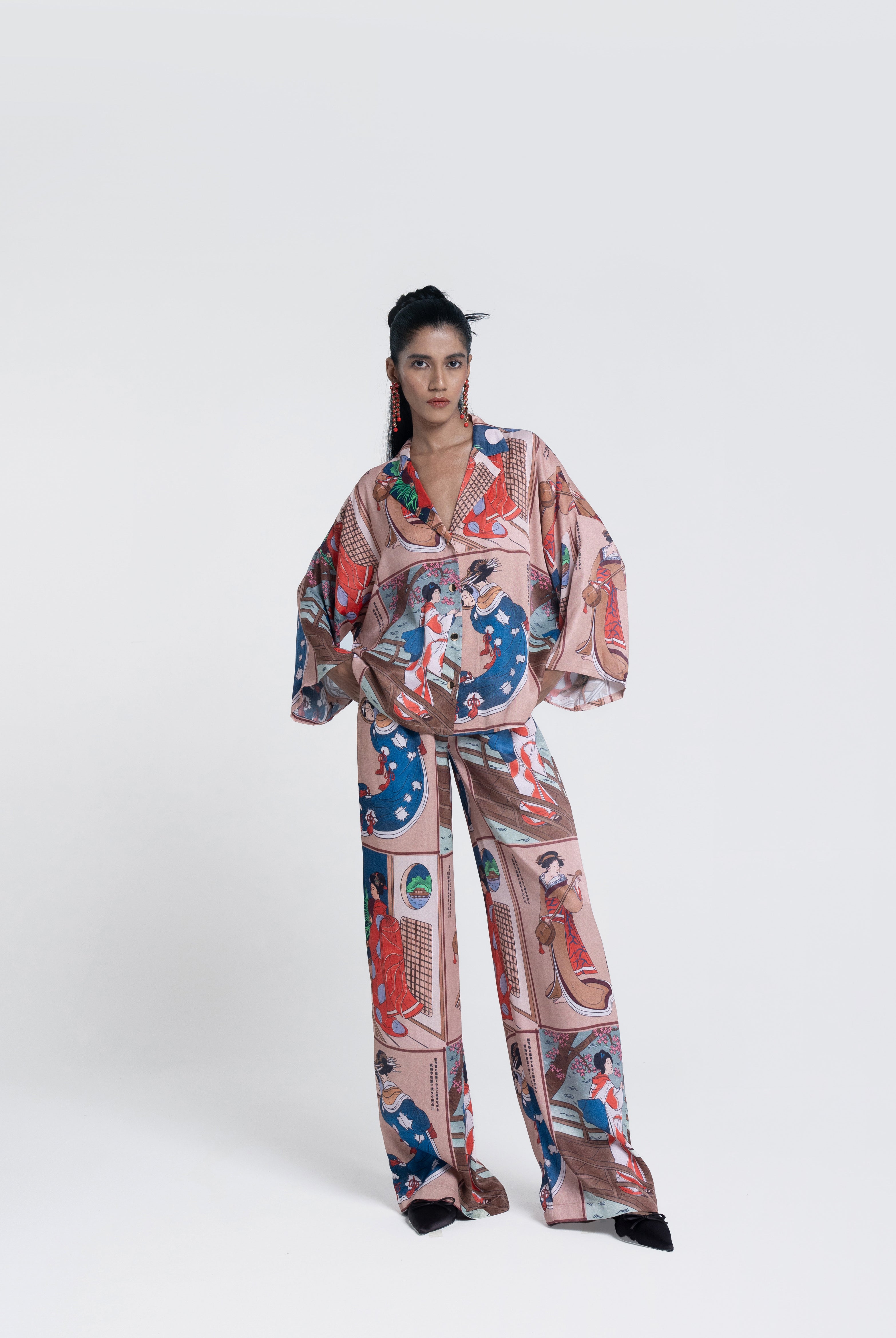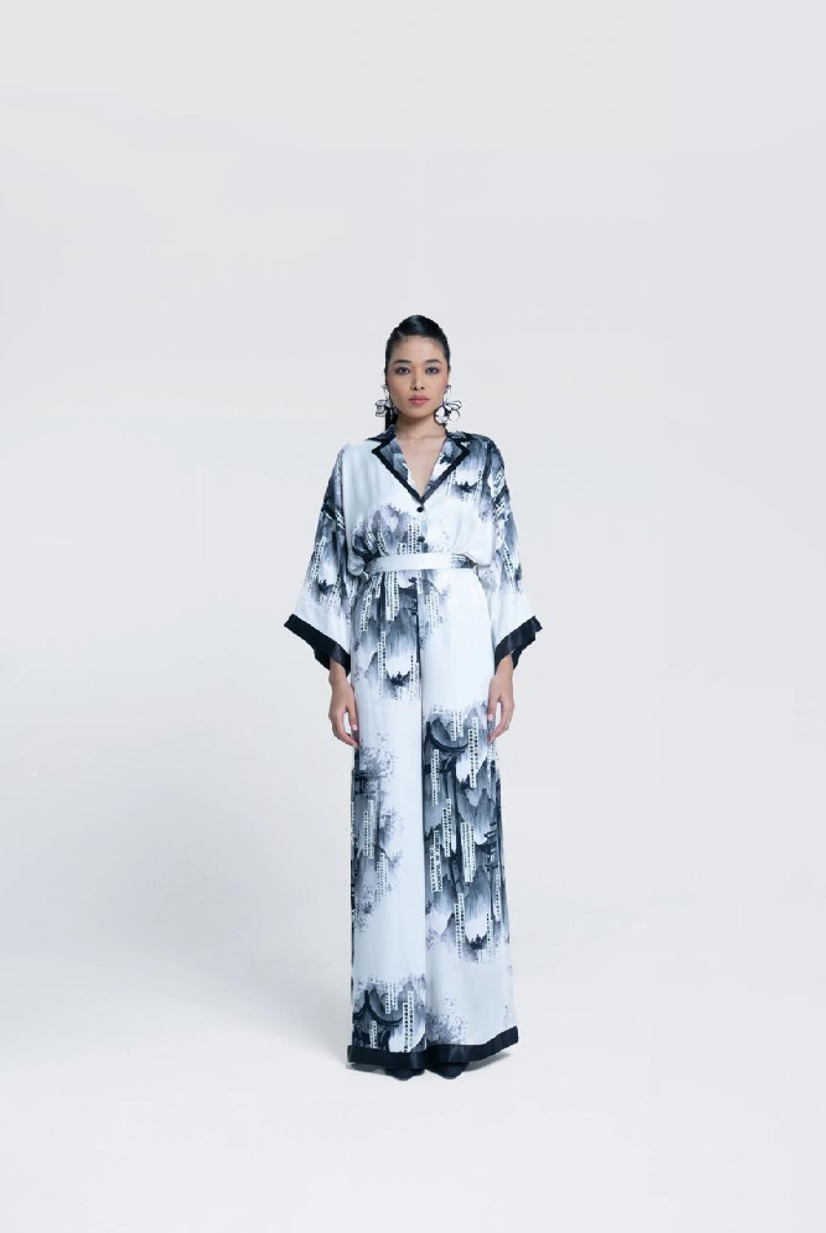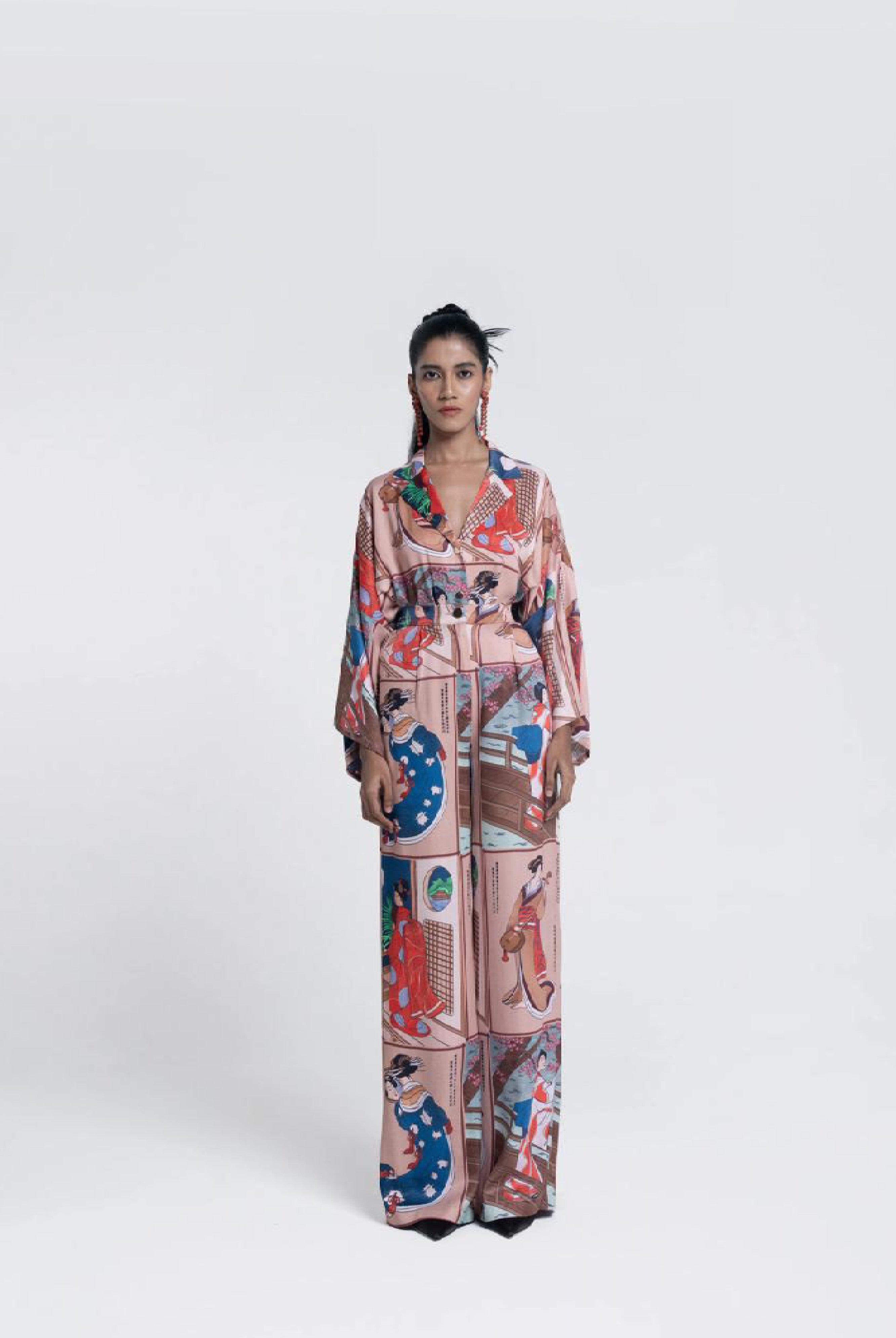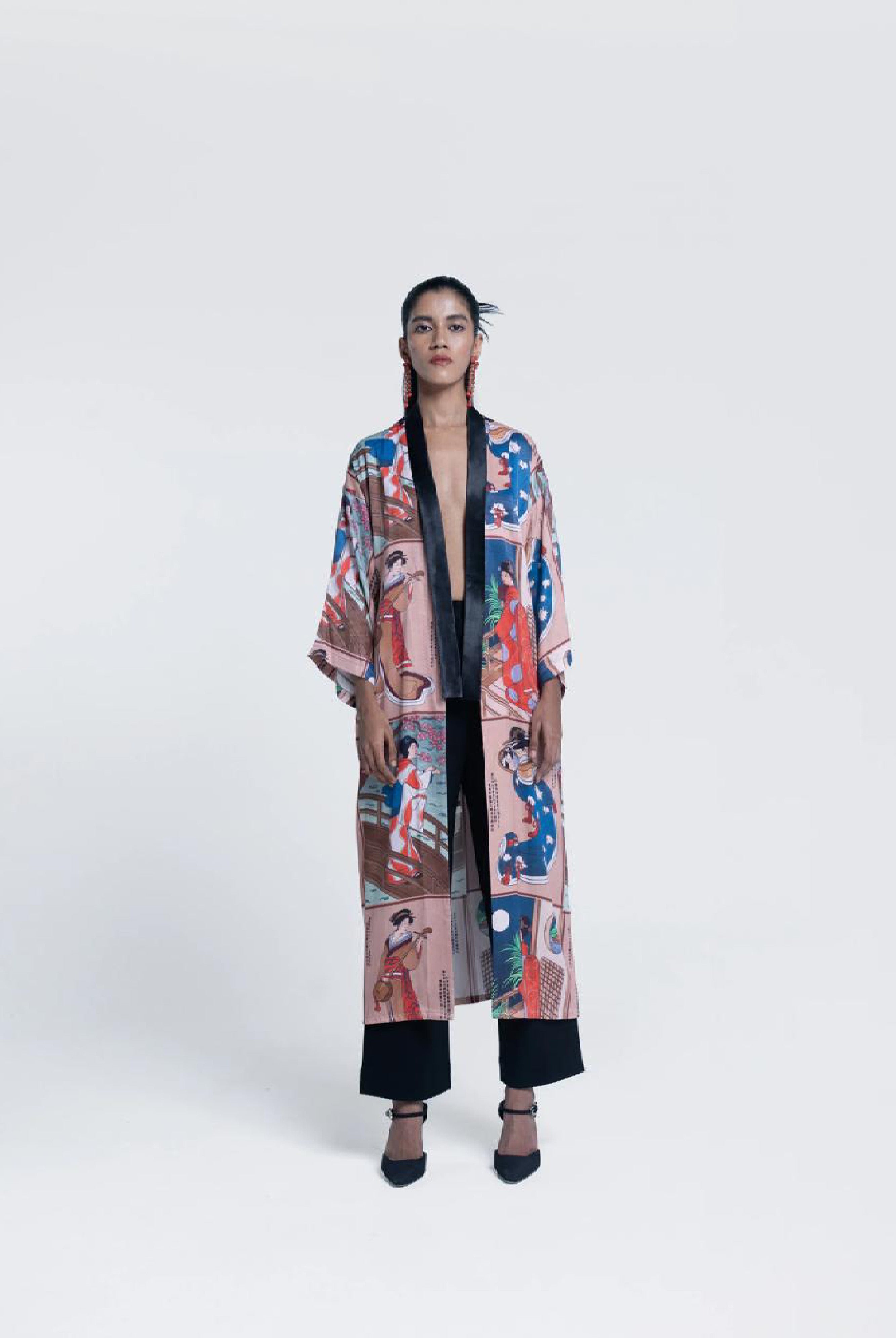 The collection, inspired by Kyoto's timeless beauty and the floating world of Ukiyo, captures the ephemeral elegance of Japanese culture. With prints reflecting Zen gardens, Shinto shrines, and Haiku poetry, it blends simplicity with depth. Mizuhiki-inspired embroidery and modern Kimono silhouettes offer free-flowing designs, embodying calmness and cultural richness.