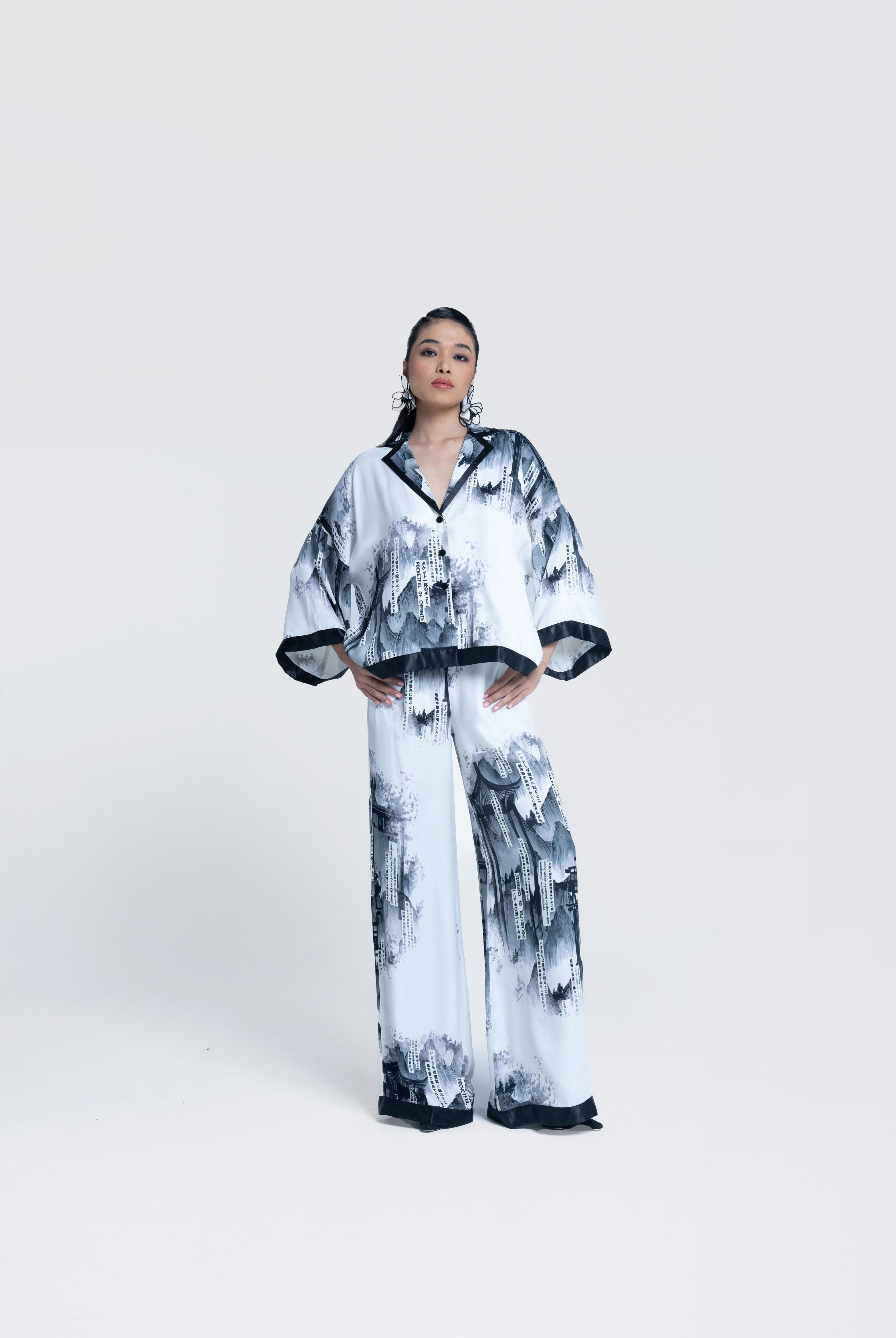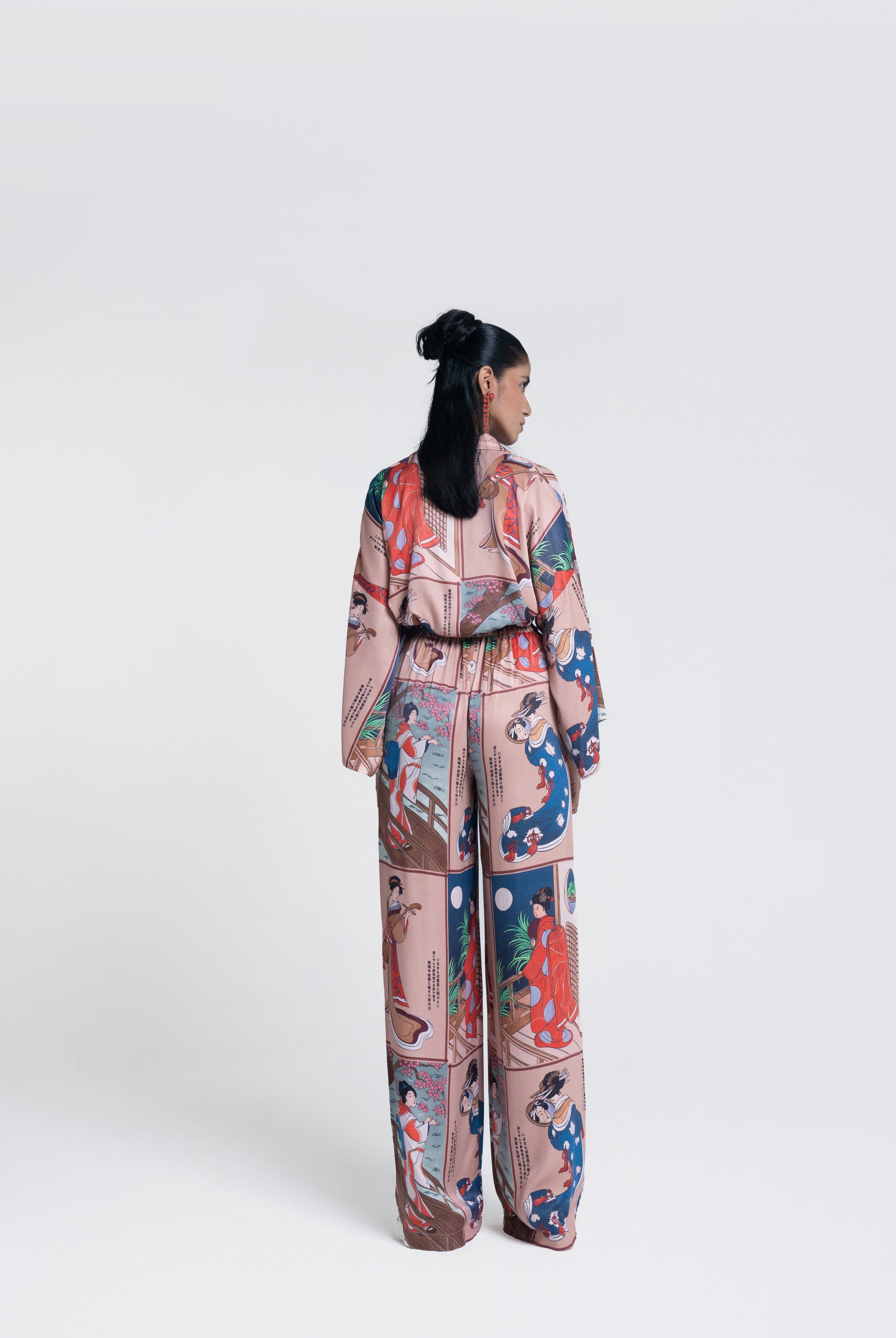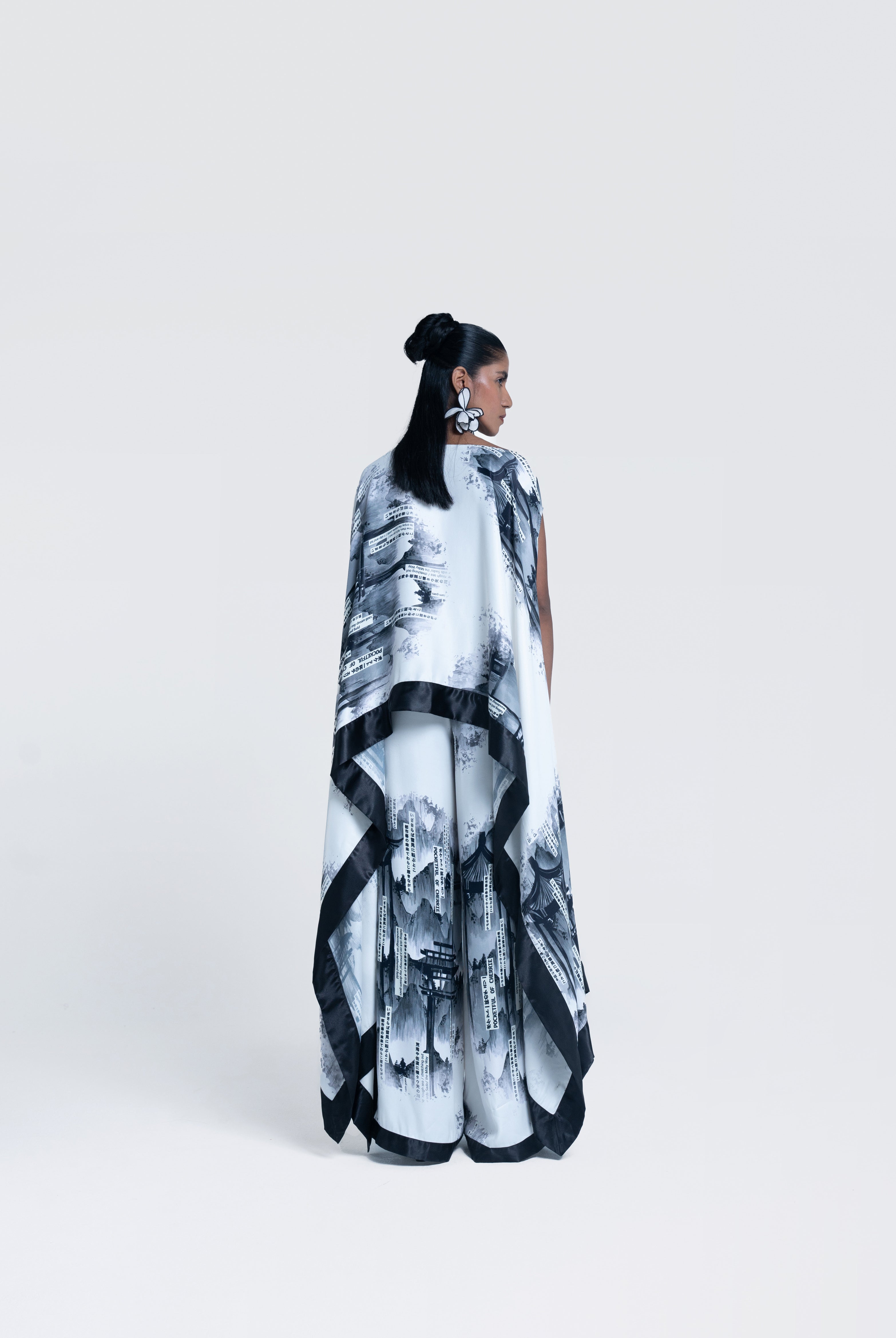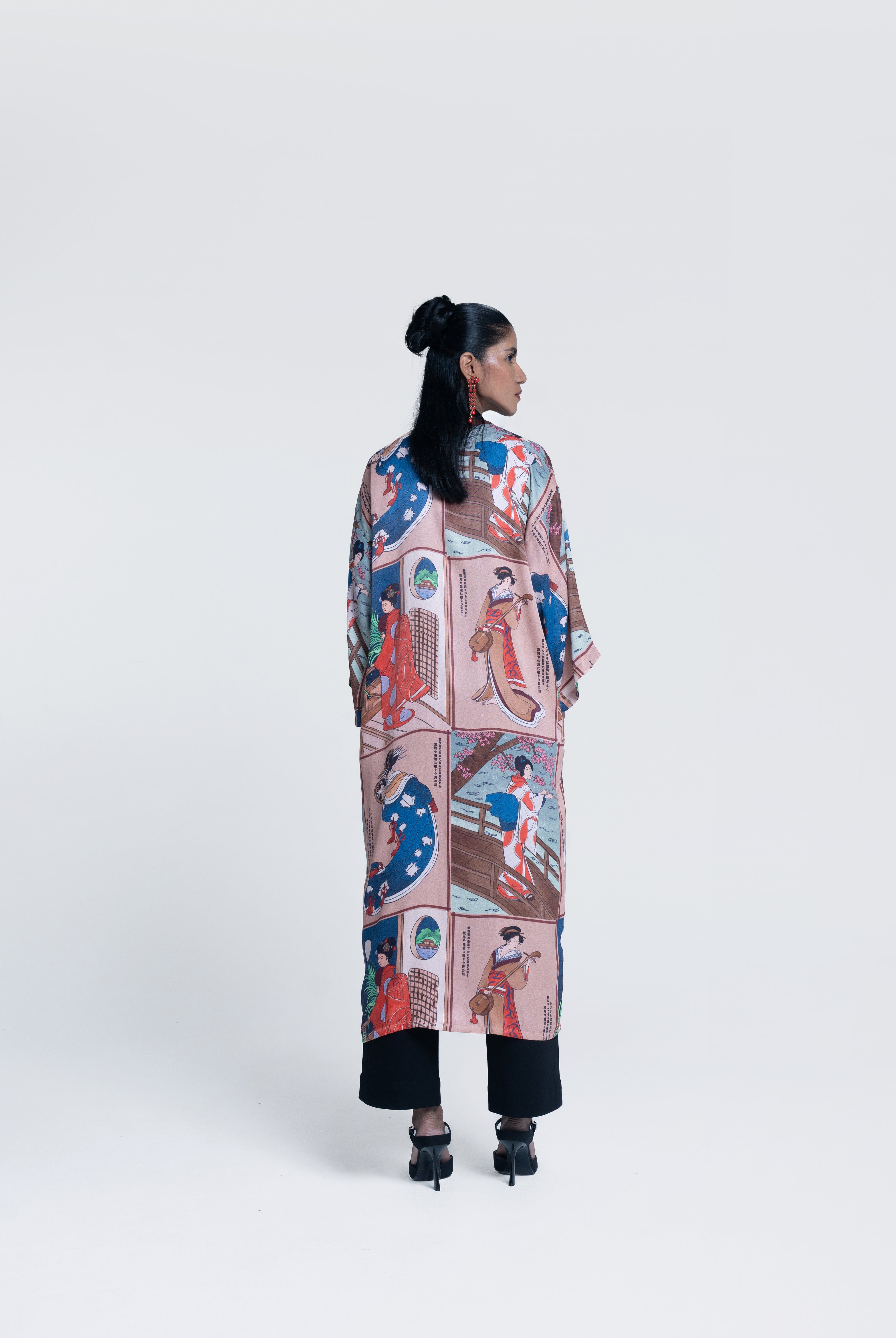 The collection, inspired by Kyoto's timeless beauty and the floating world of Ukiyo, captures the ephemeral elegance of Japanese culture. With prints reflecting Zen gardens, Shinto shrines, and Haiku poetry, it blends simplicity with depth. Mizuhiki-inspired embroidery and modern Kimono silhouettes offer free-flowing designs, embodying calmness and cultural richness.