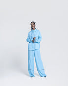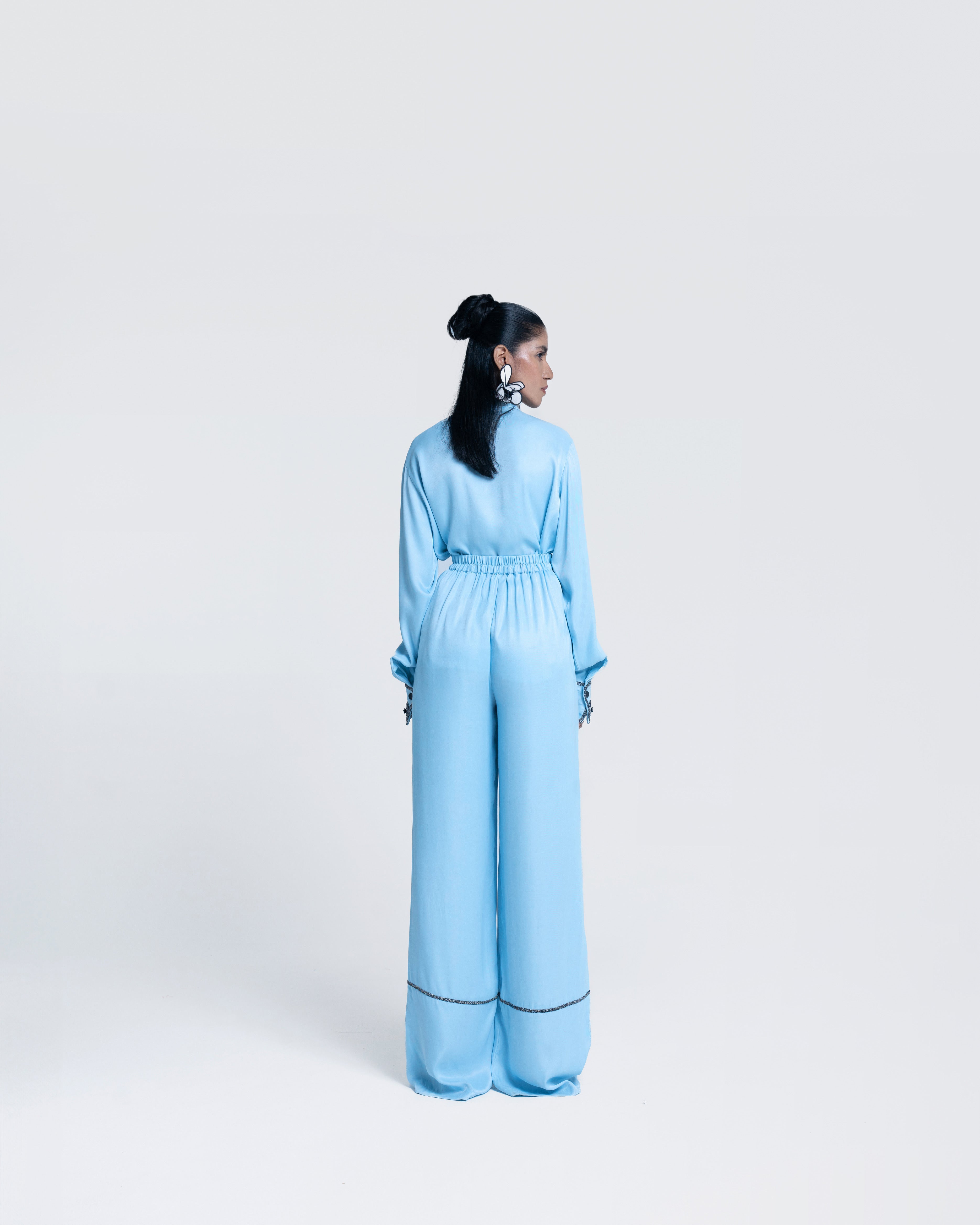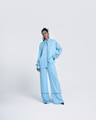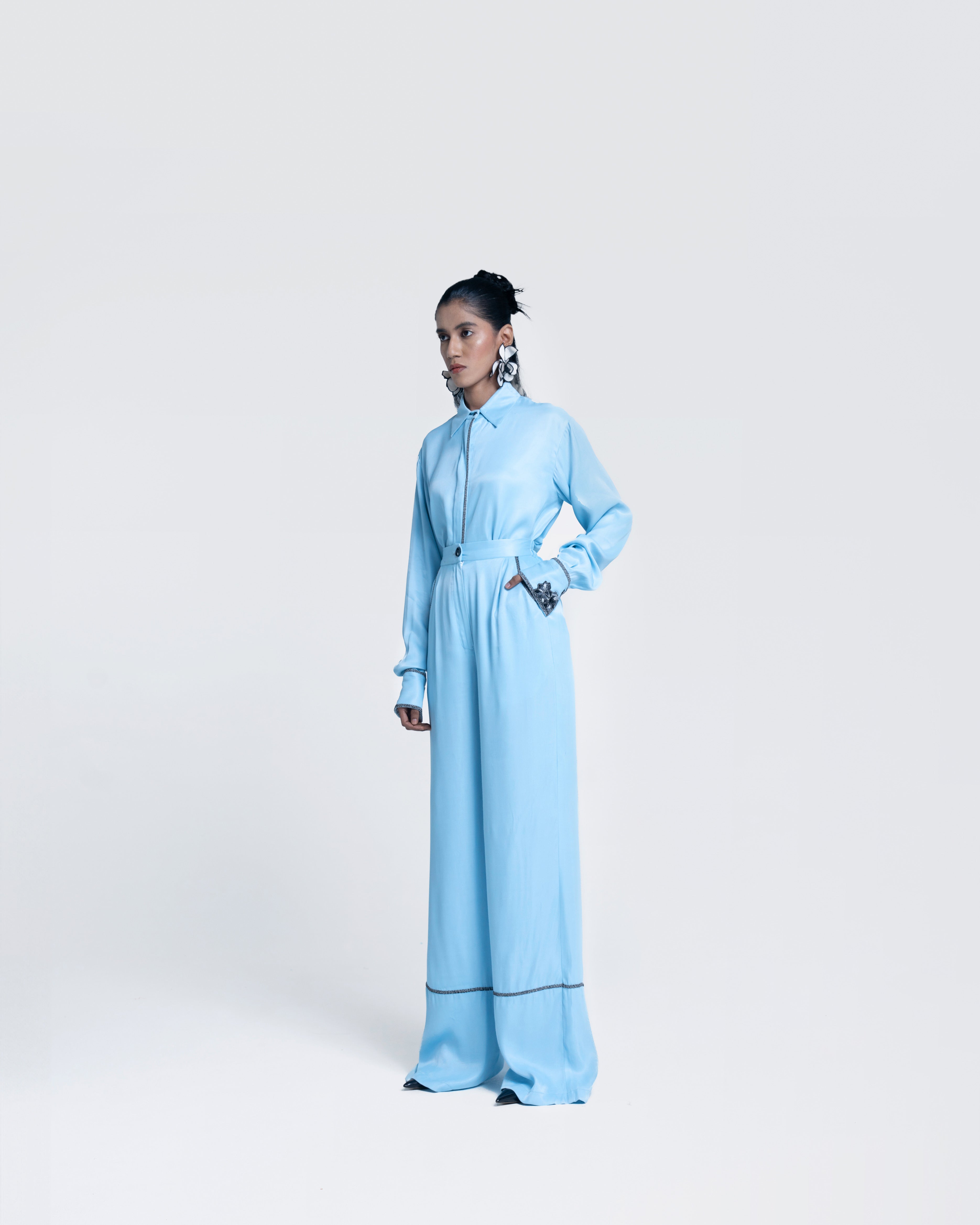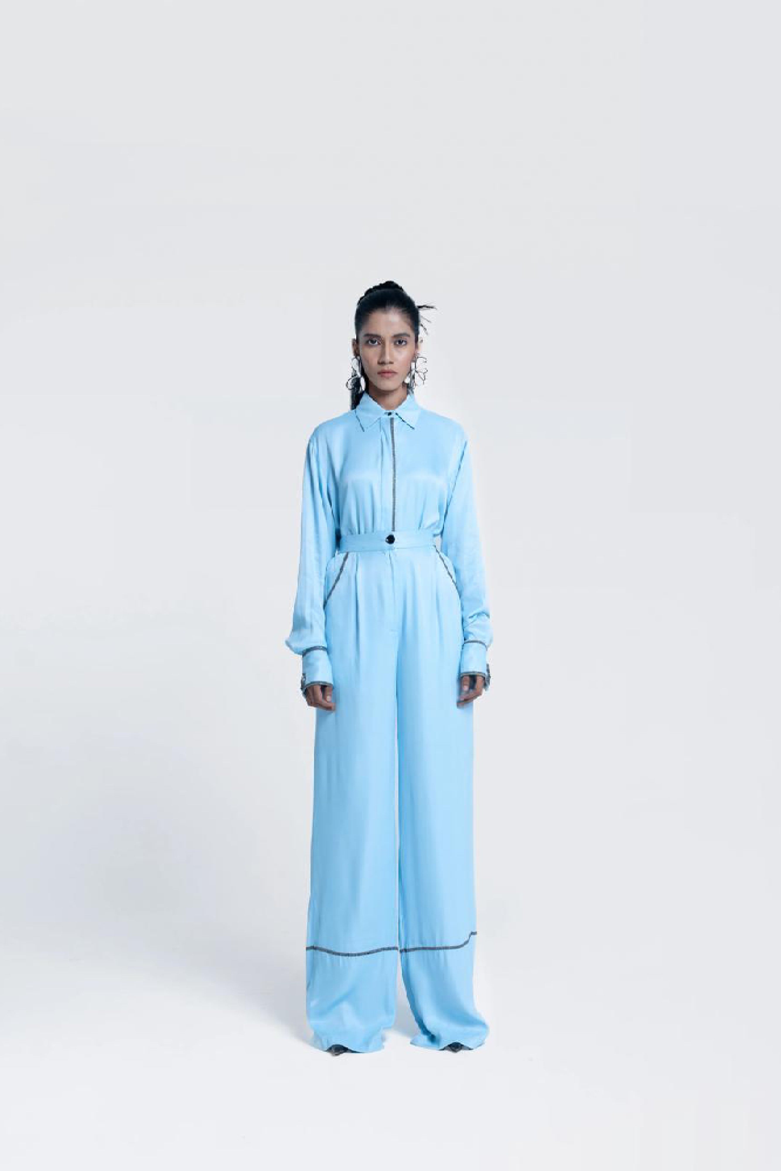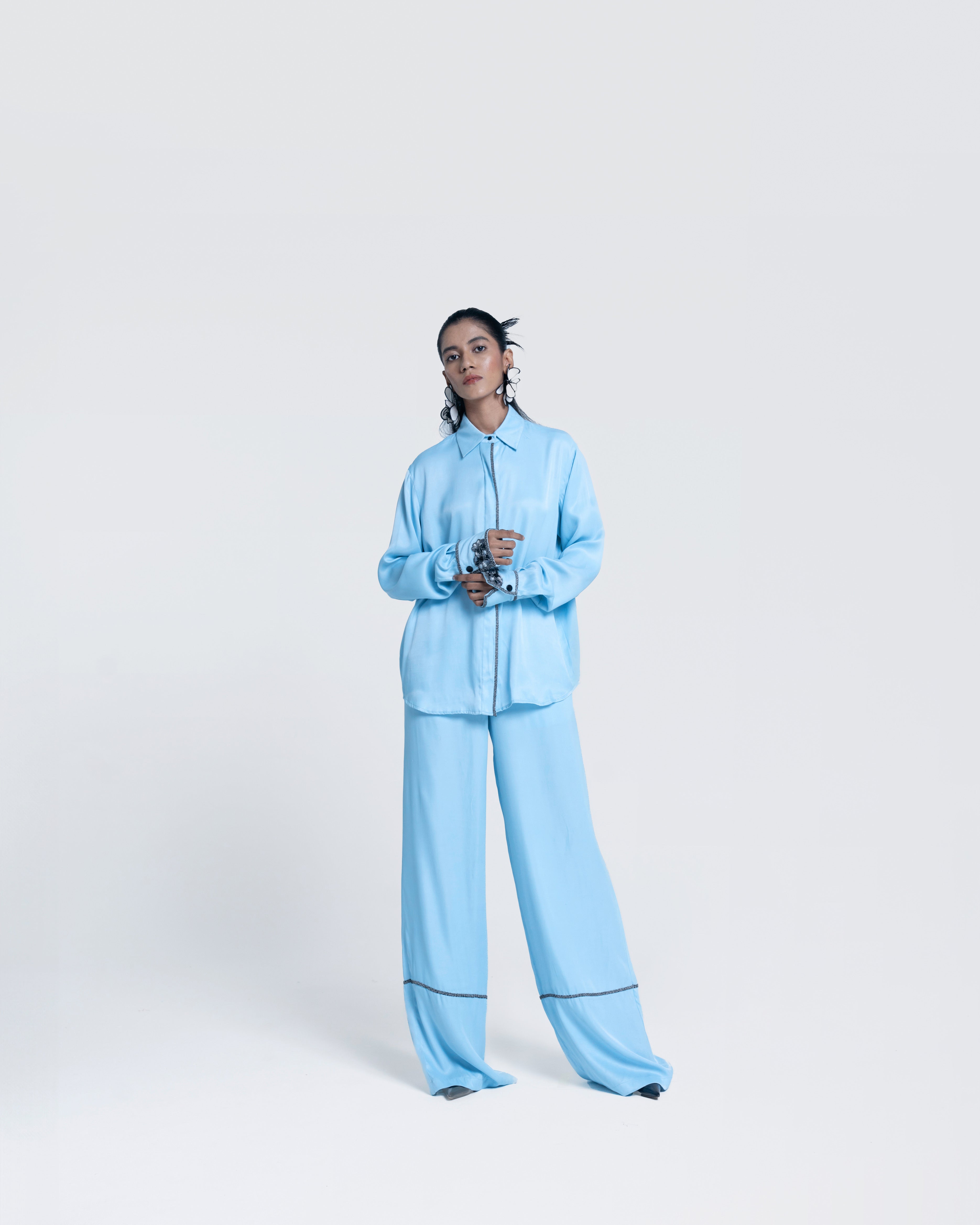 This ice blue set includes a shirt with black and white cord embroidery along the concealed placket and cuffs, accented with floral motifs in detailed thread and beadwork. Paired with high-waisted straight trousers featuring a button and fly zip closure, elasticated waistband, and matching black and white cord embroidery for a cohesive finish.