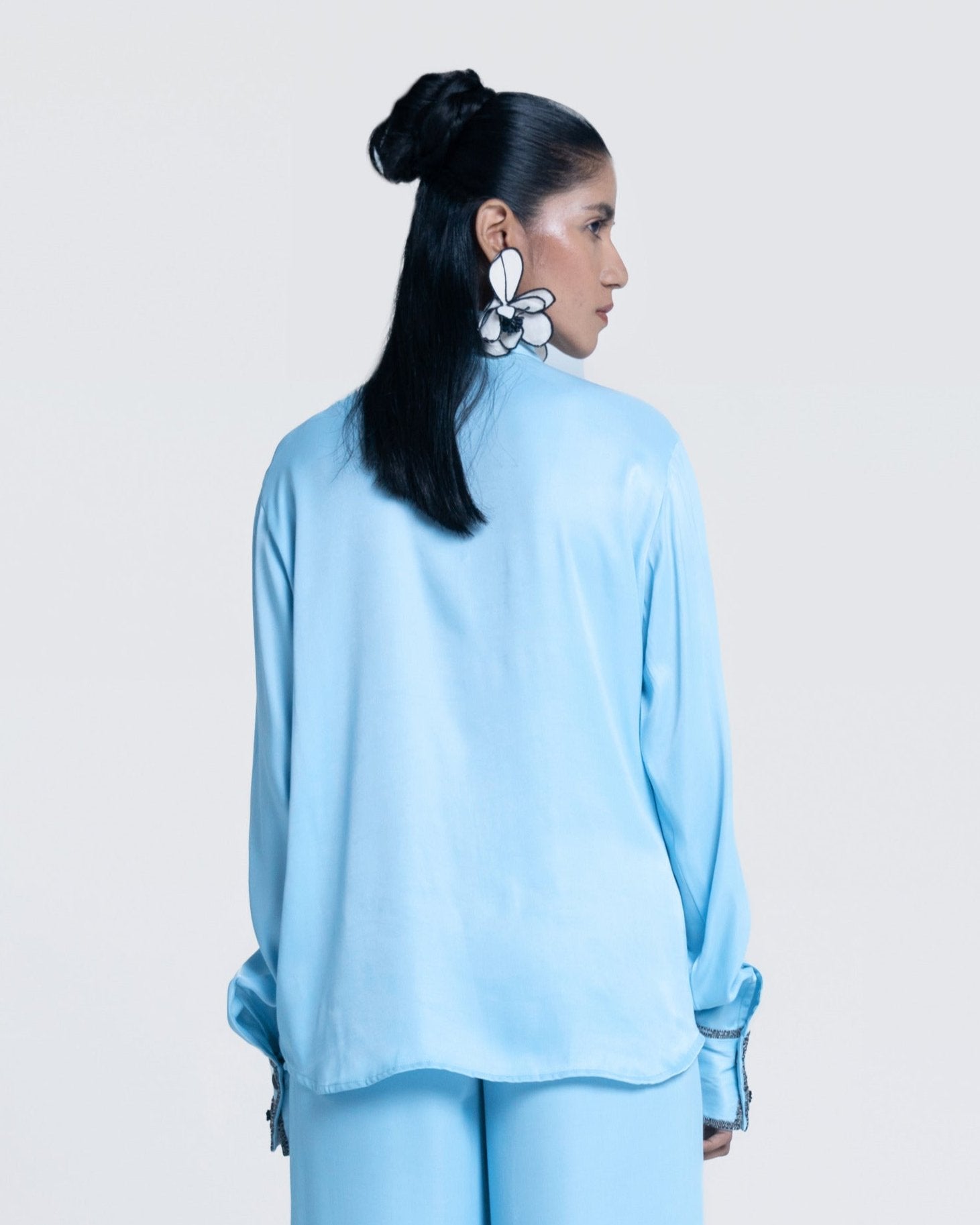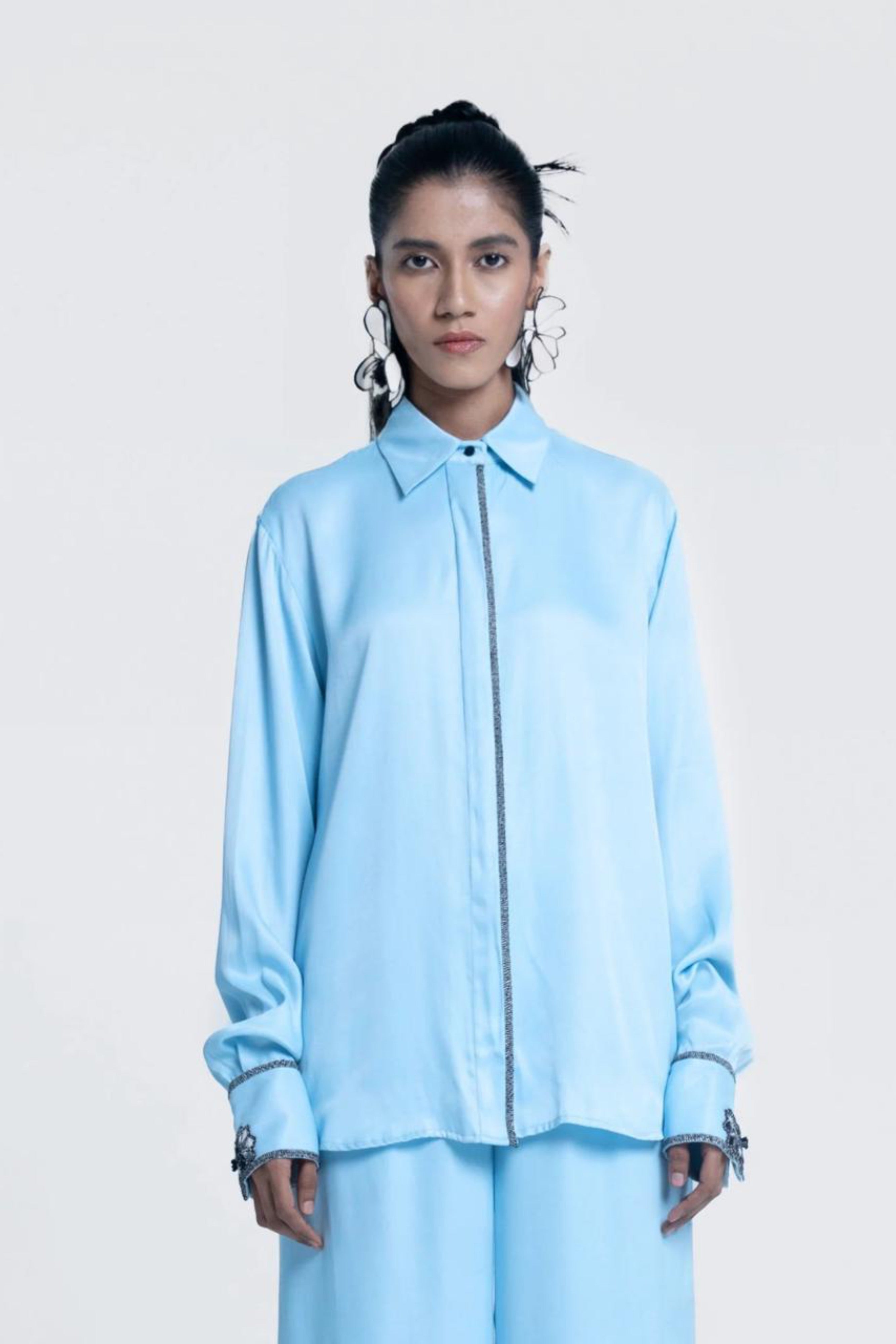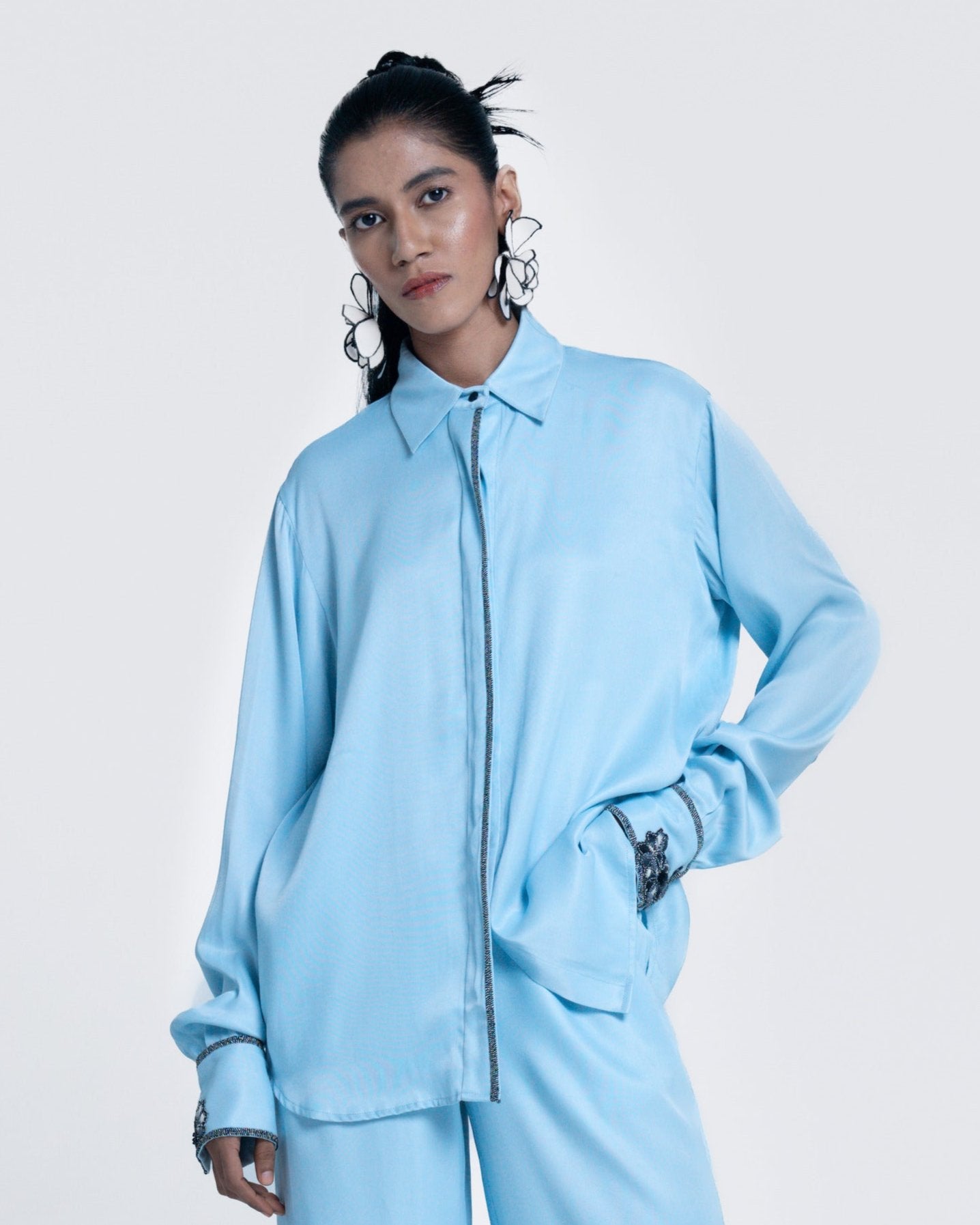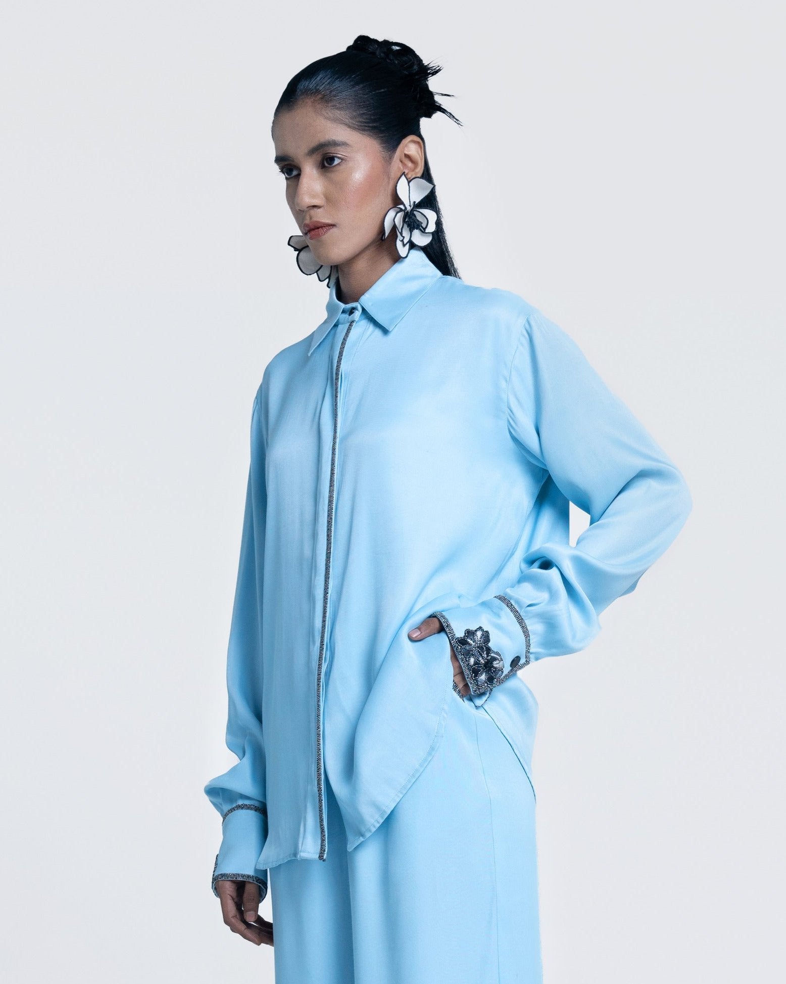 Ice blue shirt featuring black and white cord embroidery on the concealed placket and cuffs, accented with border details and floral motifs in intricate thread and beadwork.