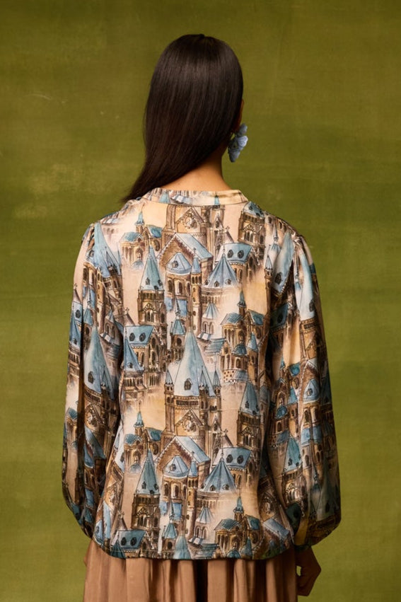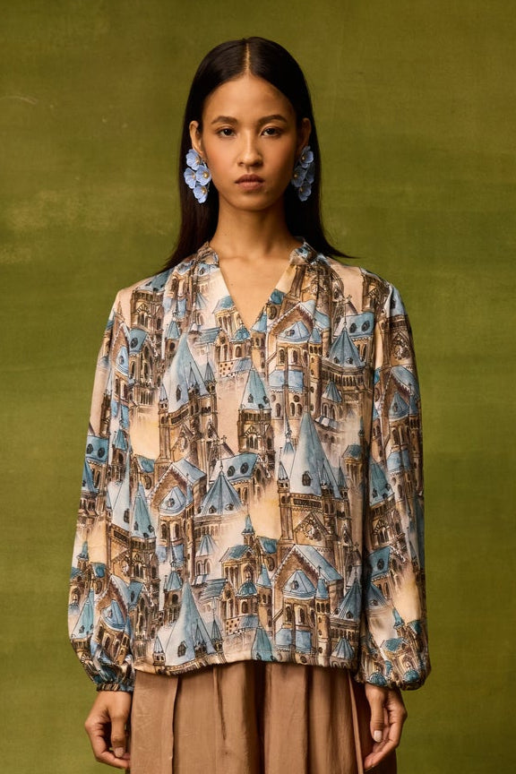This lightweight blouse is adorned with an all-over architectural-inspired hand drawn print in soft blues and neutrals. Designed with a relaxed fit, V-neckline, and billowy sleeves, it’s perfect for adding a touch of artistic flair to your everyday or evening wardrobe.