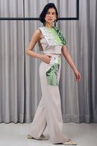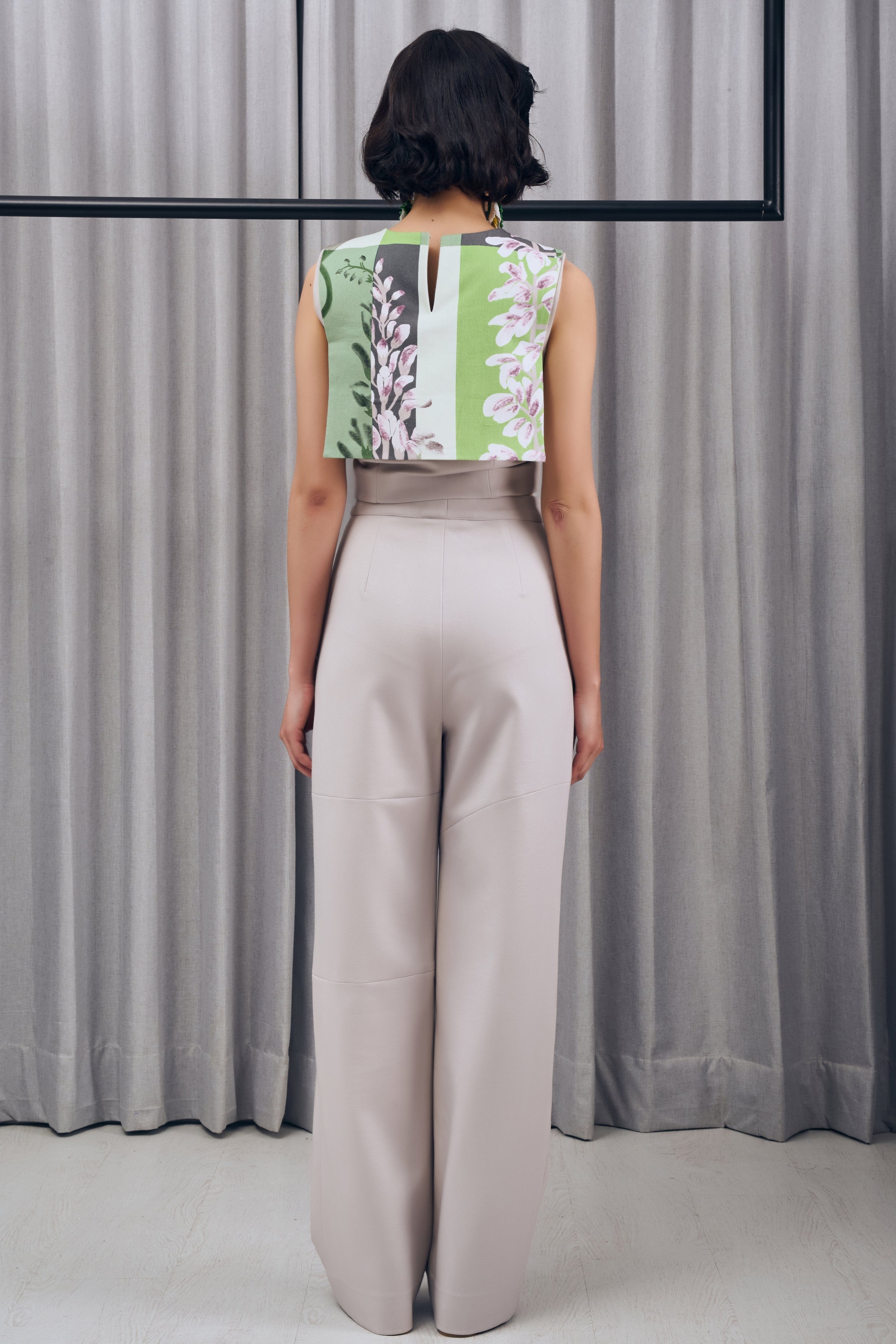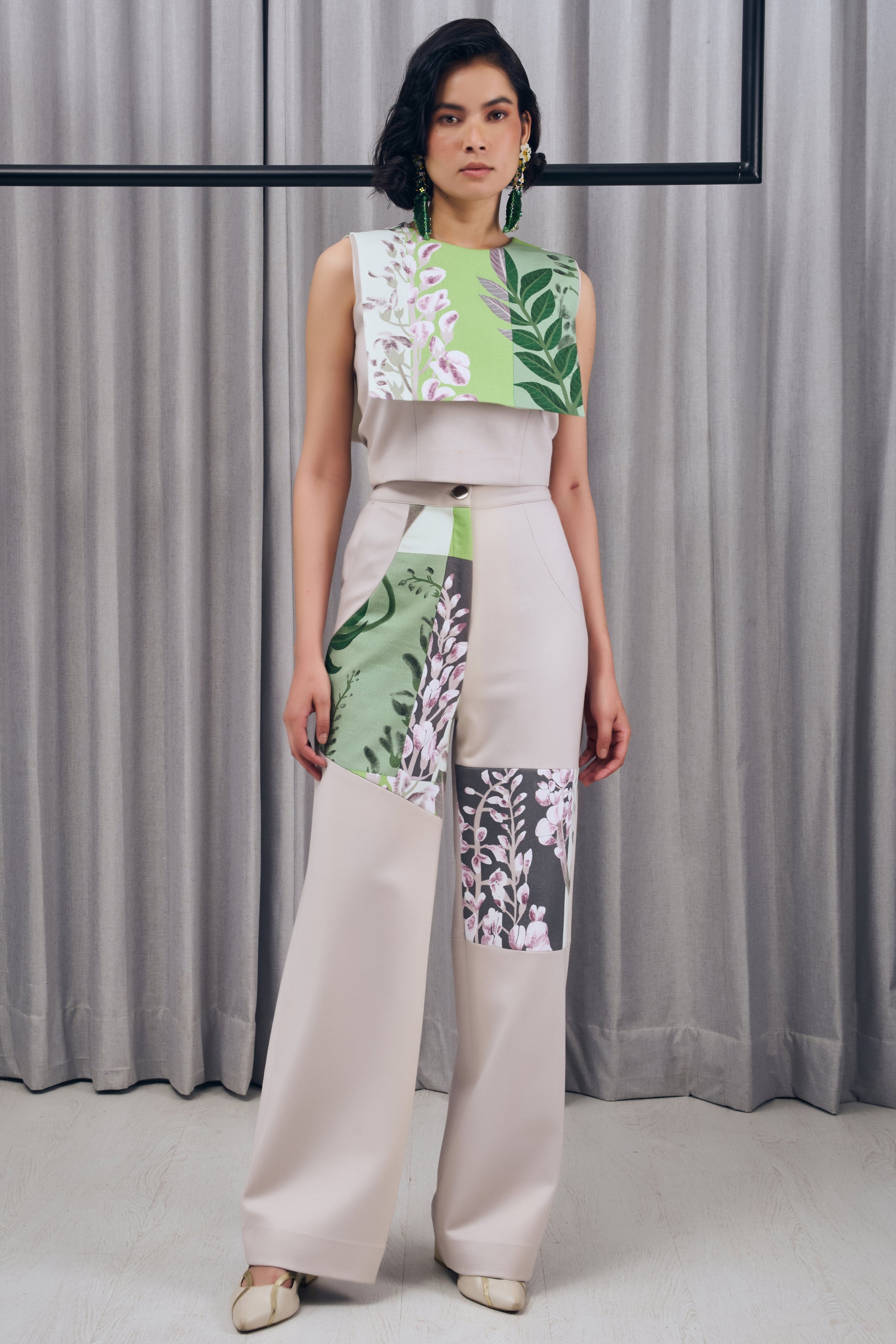Grey overlap crop top with hook and eye closure featuring hand drawn floral print paired with grey block pants with button and fly zip closure featuring hand drawn floral print and side pockets.