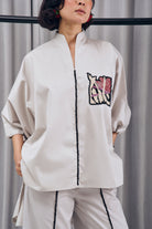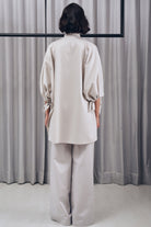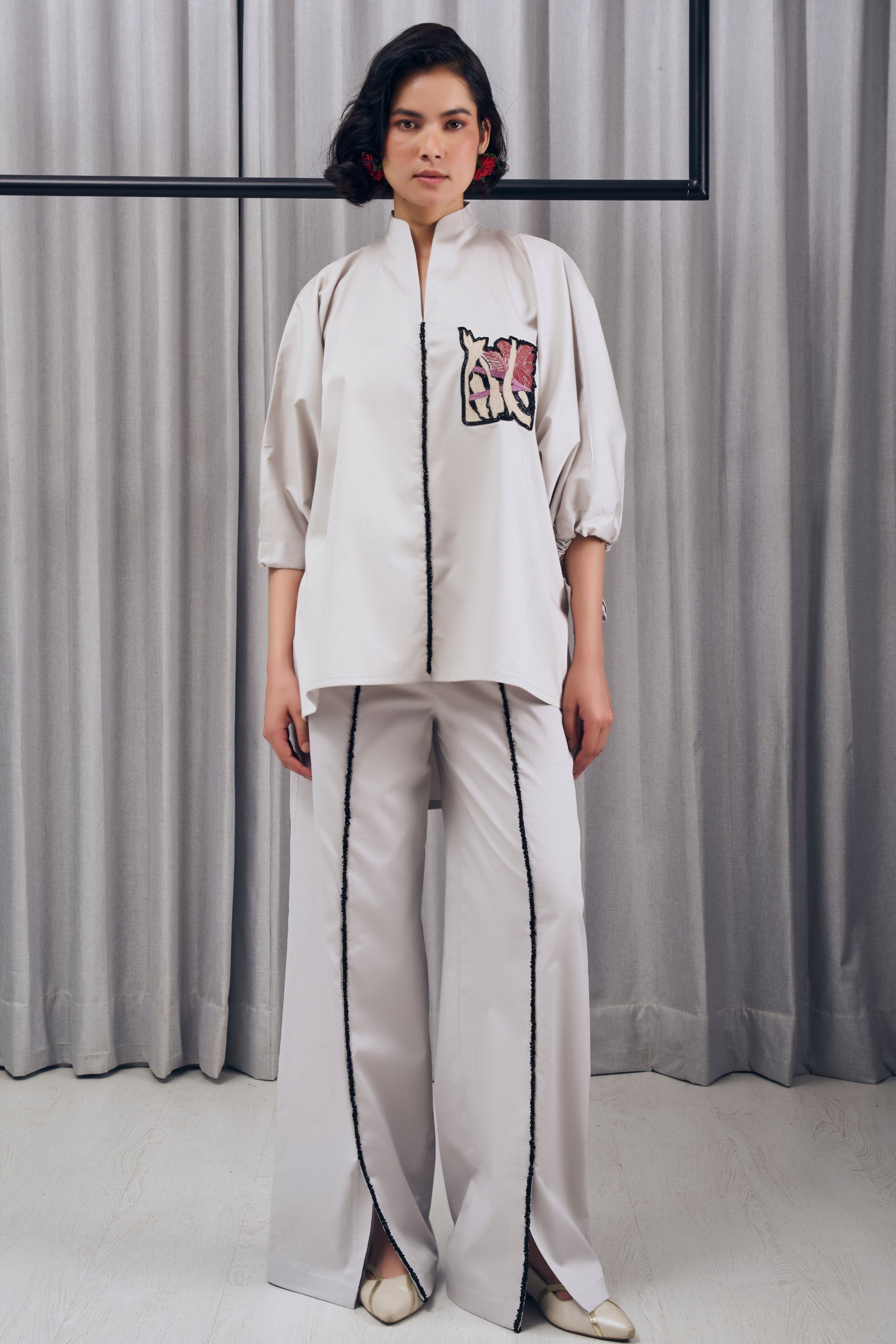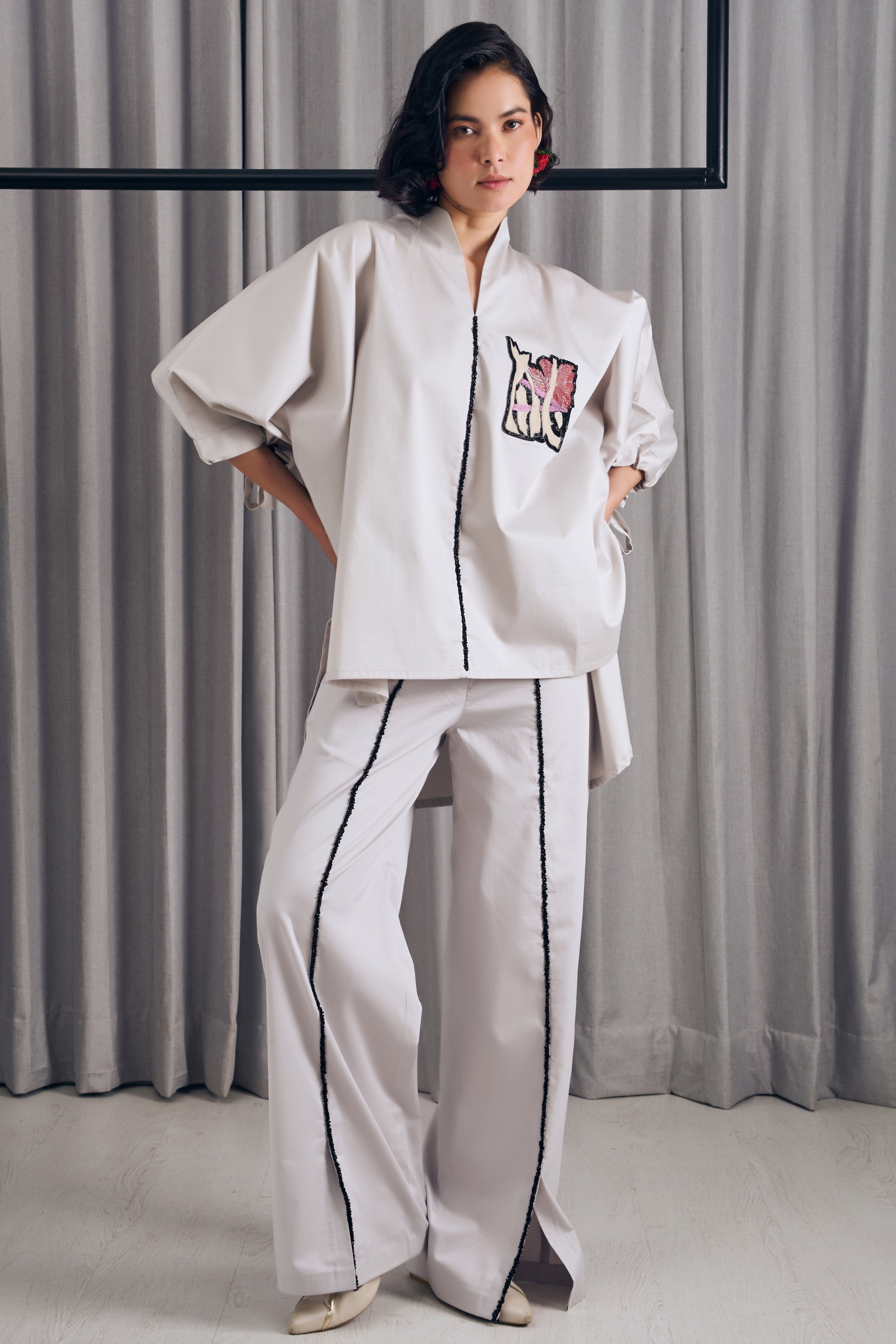 Solid grey batwing shirt, extended 3/4 sleeves with adjustable straps, embroidered front patch pocket and high low hem with black katdana detailing in the front paired with wide-leg trousers with button and fly zip closure, embellished with black katdana with front slit detailing and side pockets.