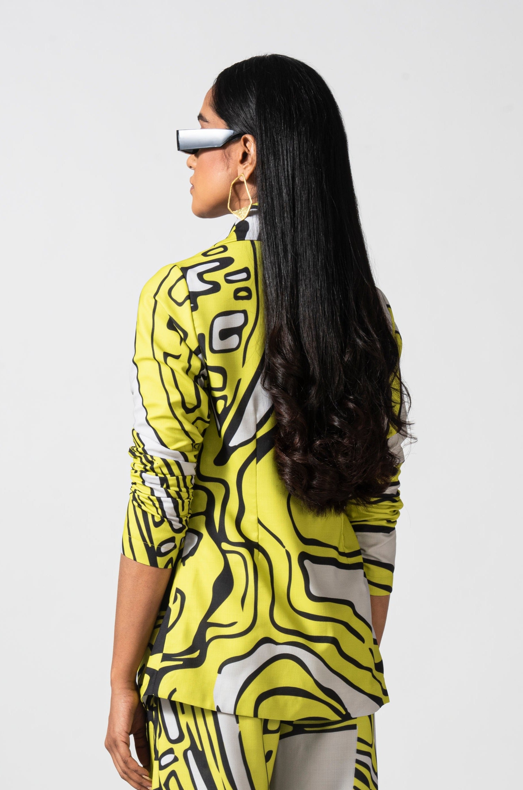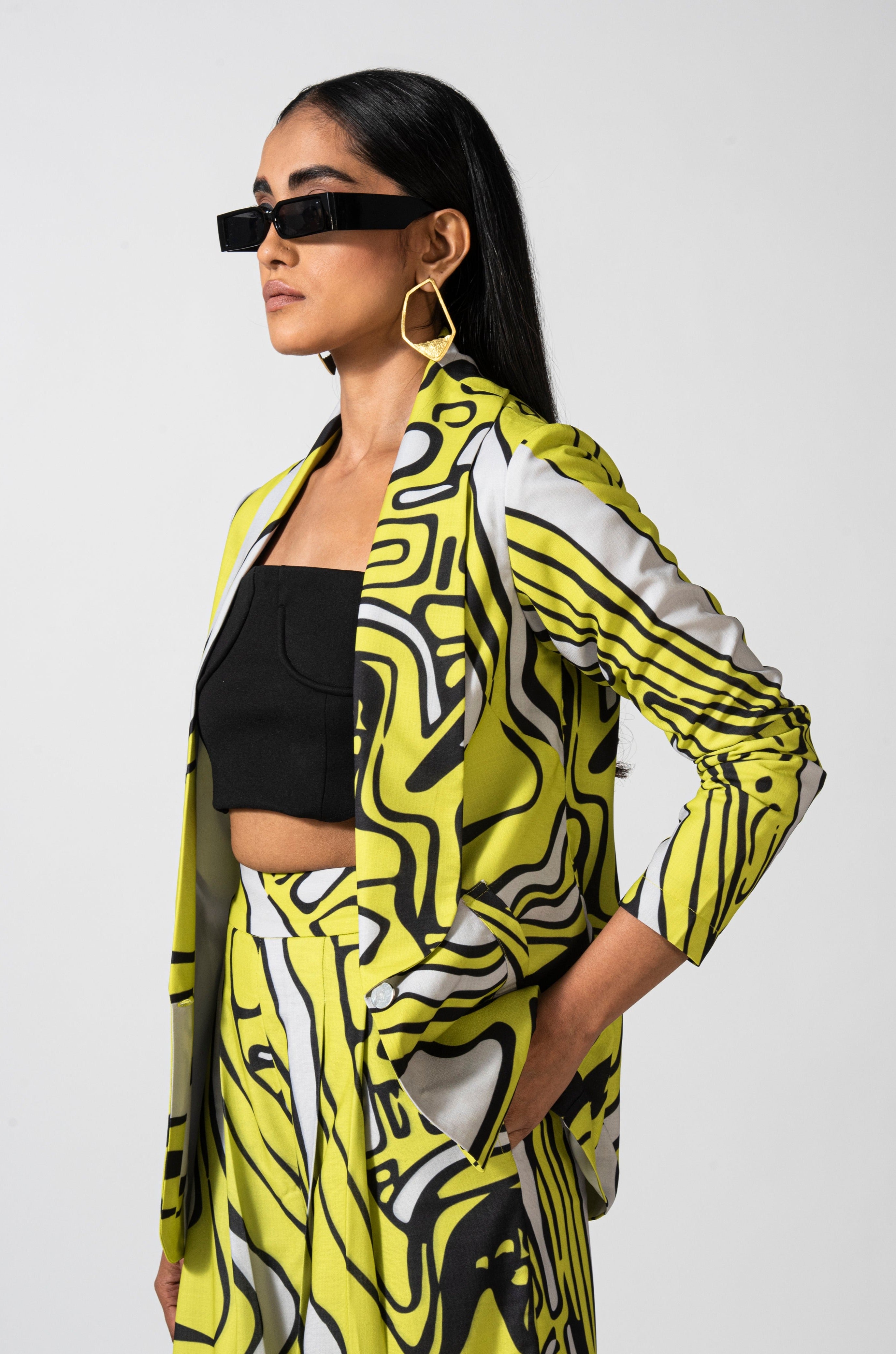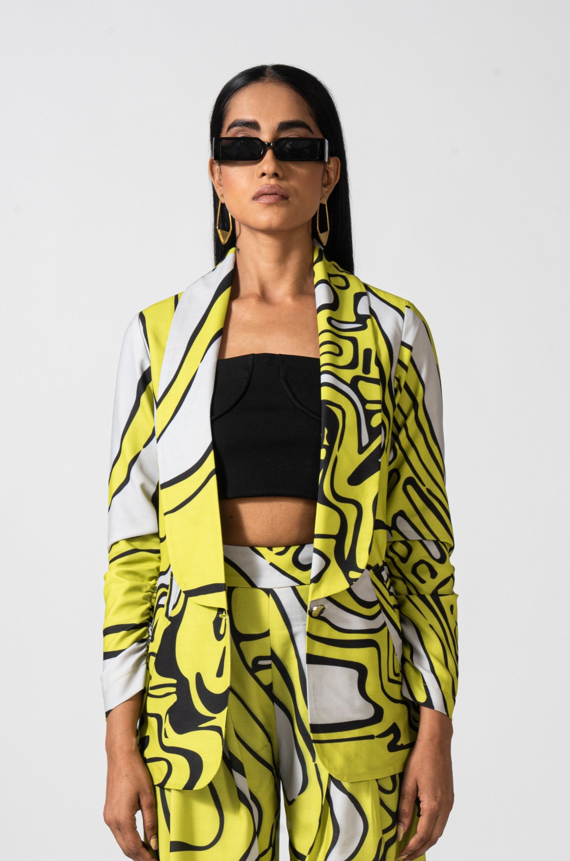 Infuse your wardrobe with whimsy in our open blazer, adorned with playful funny face prints. Embrace effortless charm and quirky style with this statement piece.