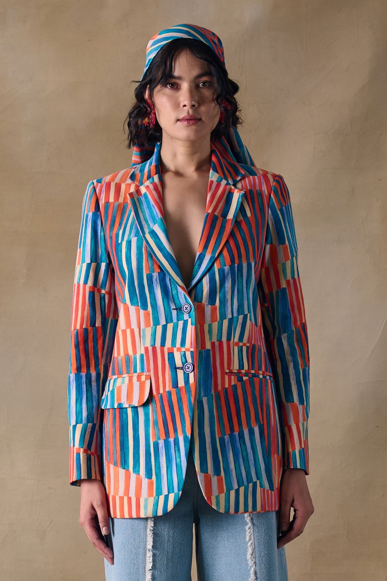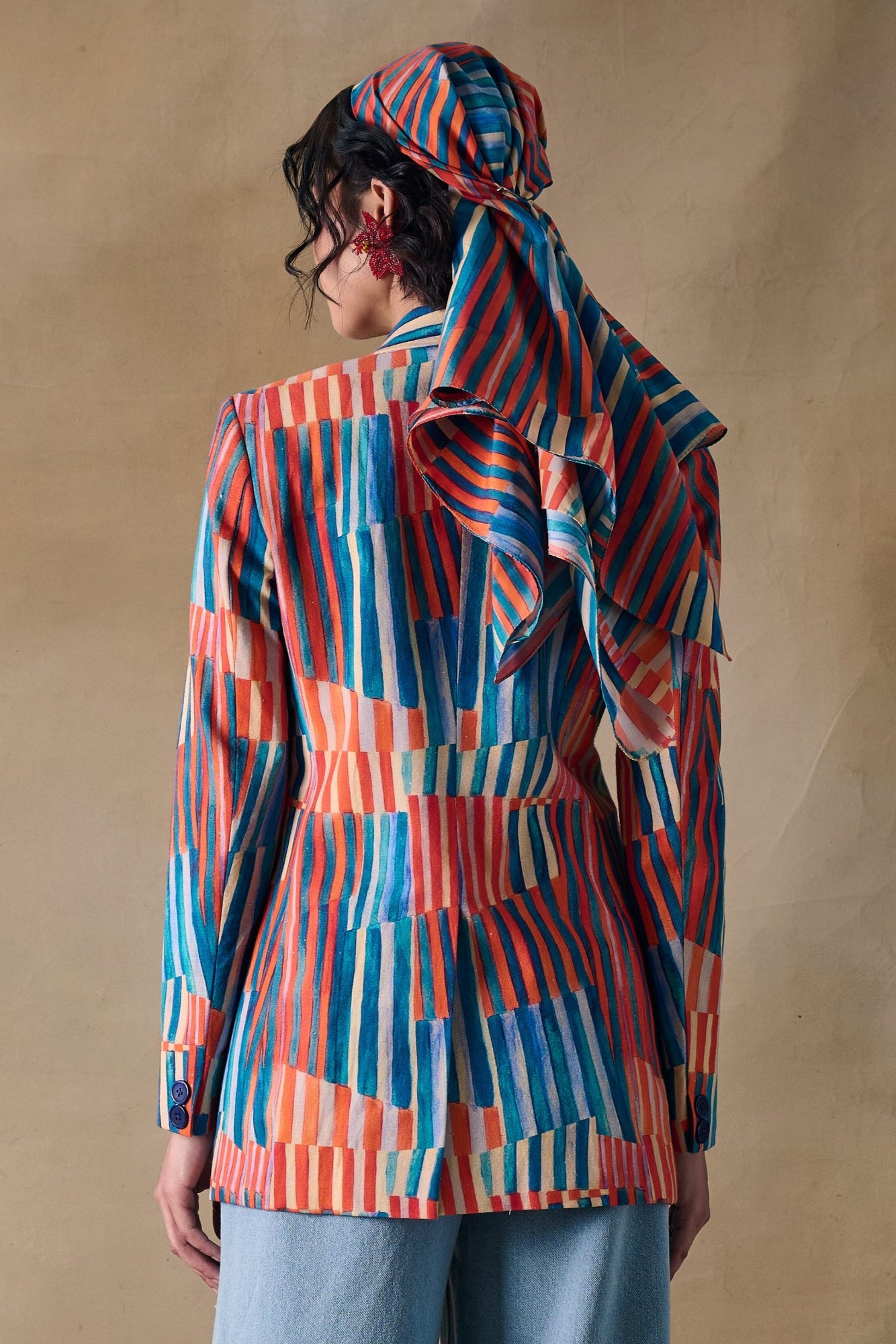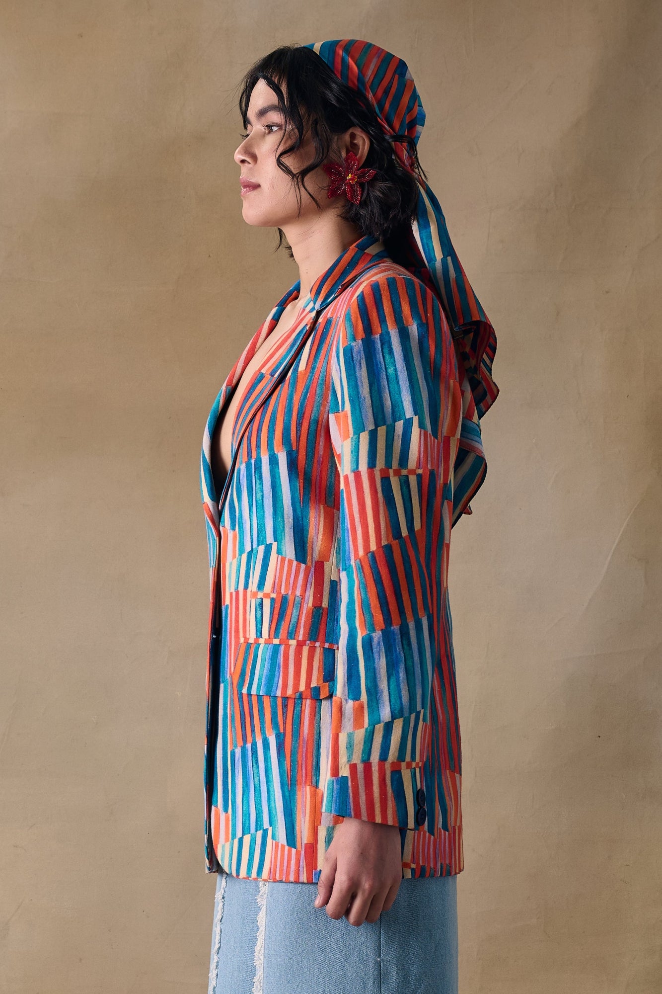 Hand drawn stripe print single-breasted blazer with a notched collar.