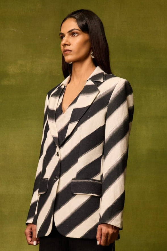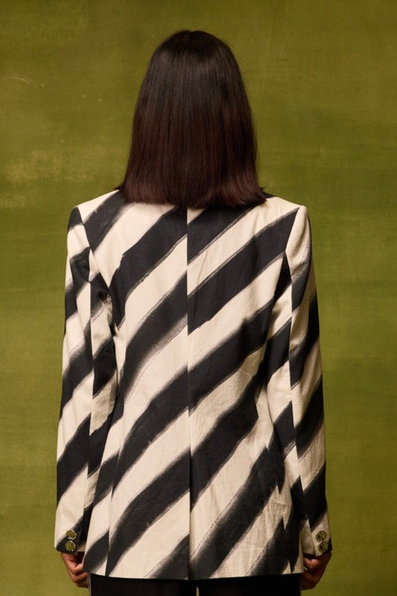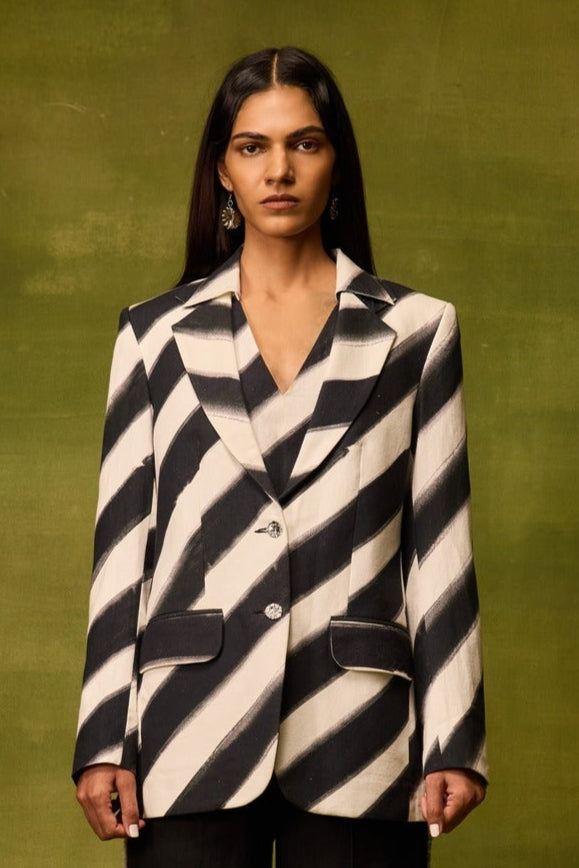 A statement single-breasted blazer featuring a bold hand-drawn diagonal print. Tailored with structured shoulders, notched lapels, and a two-button front closure, it balances bold artistry with sharp tailoring. Finished with flap pockets and full sleeves, it’s a versatile piece that transitions seamlessly from day to evening.