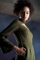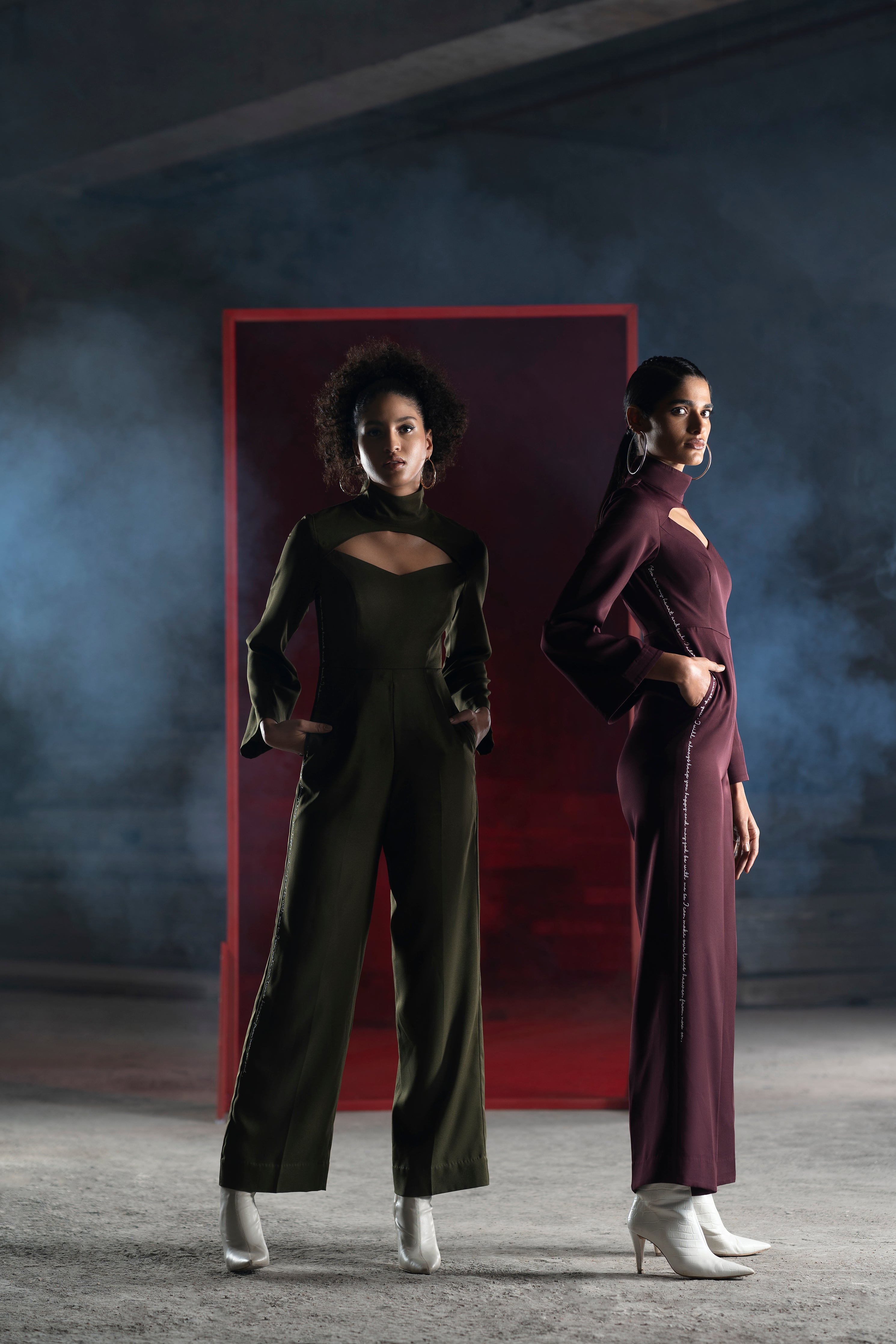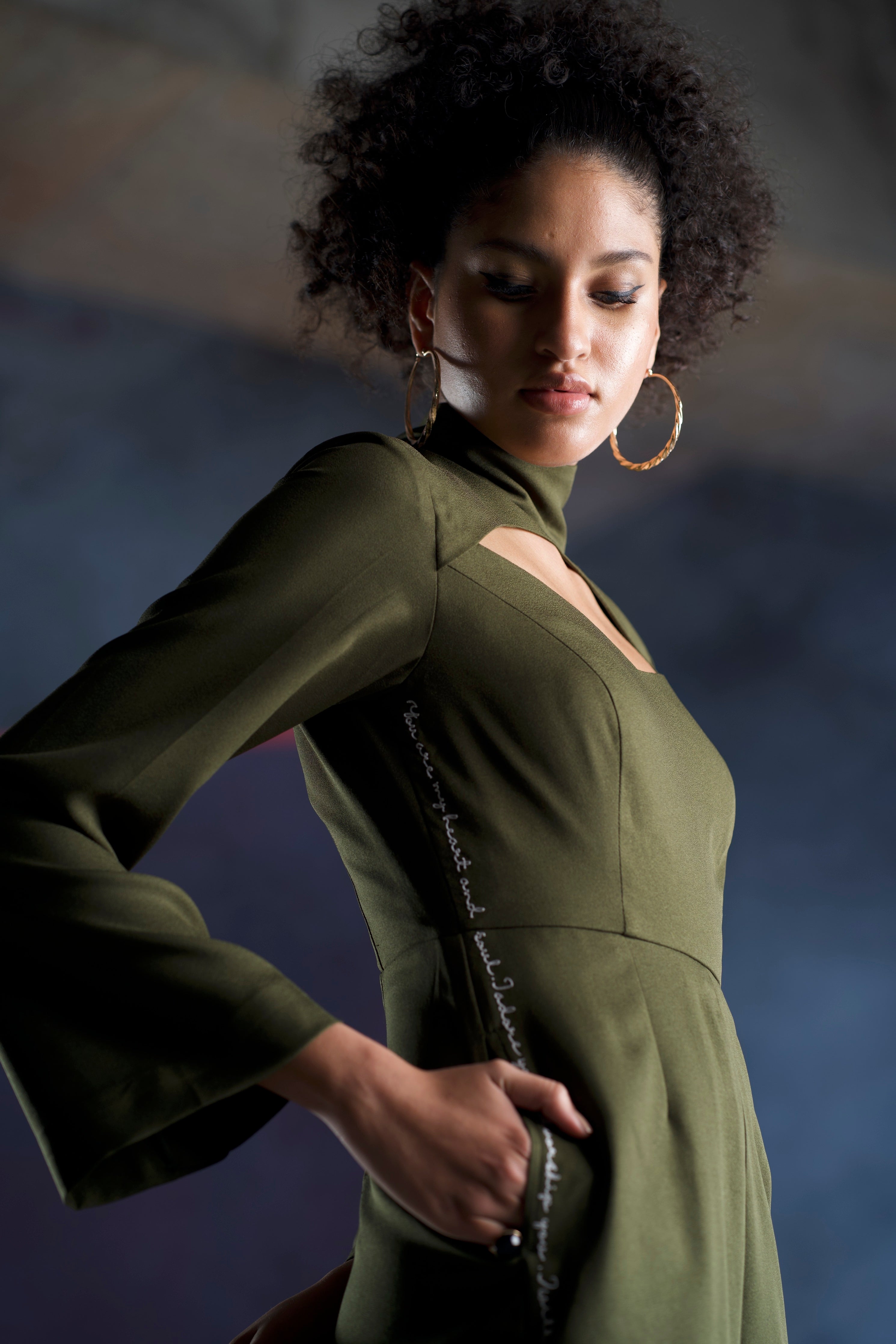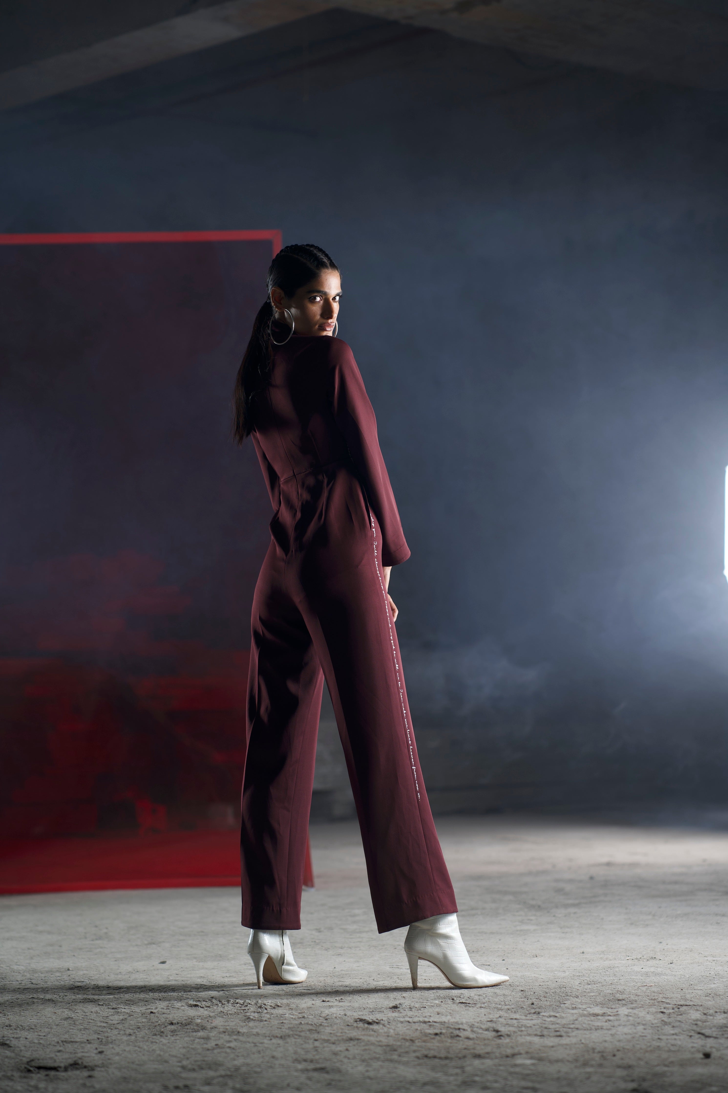 It is a loose fit bottom jumpsuit with a cut-out neck design and side seam pockets. Our signature khat embroidery can be seen on one side and is carefully hand embroidered with thread work showcasing the real love letters of lovers from the 20th century. It has concealed zipper at the back.