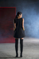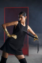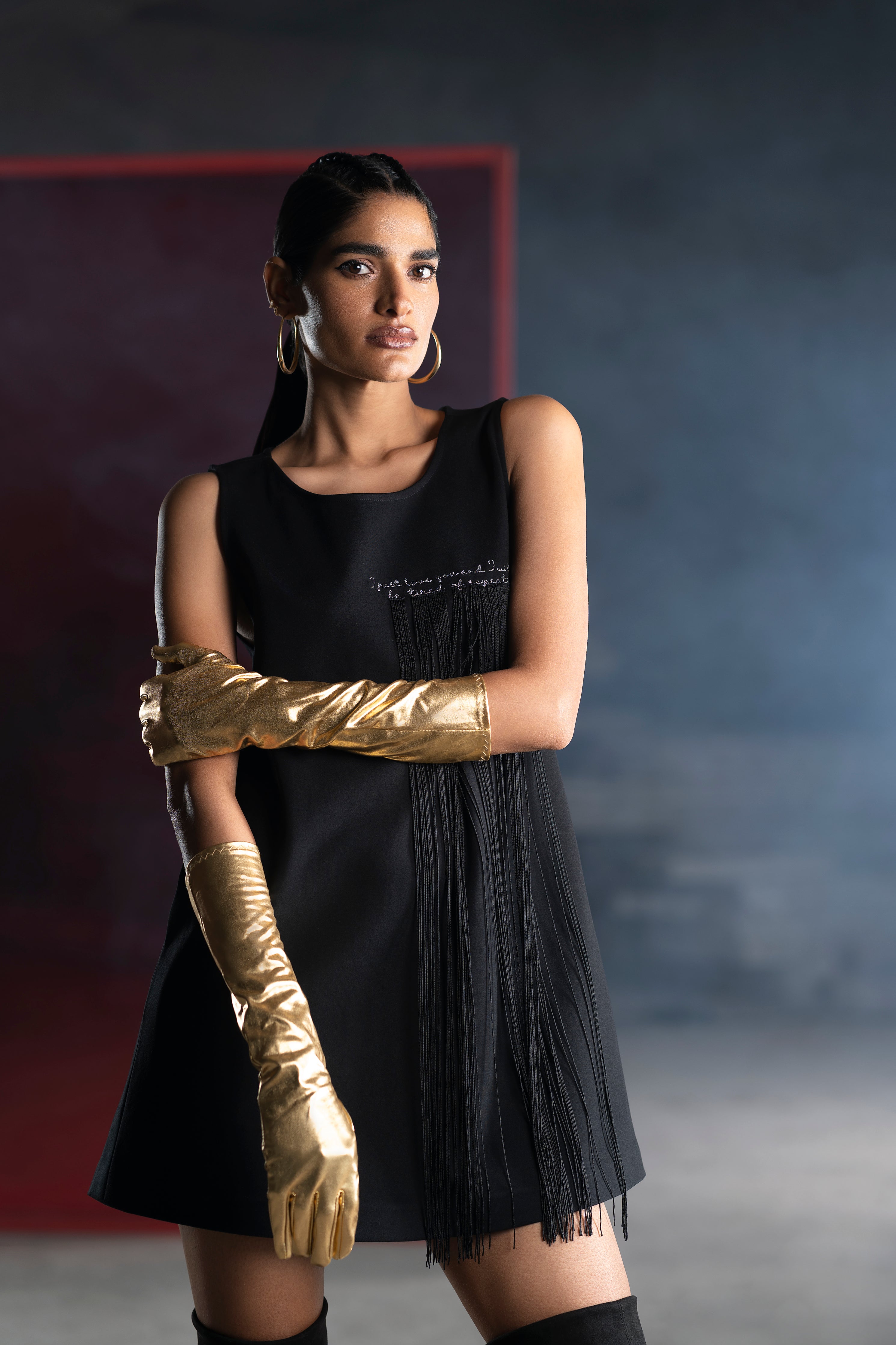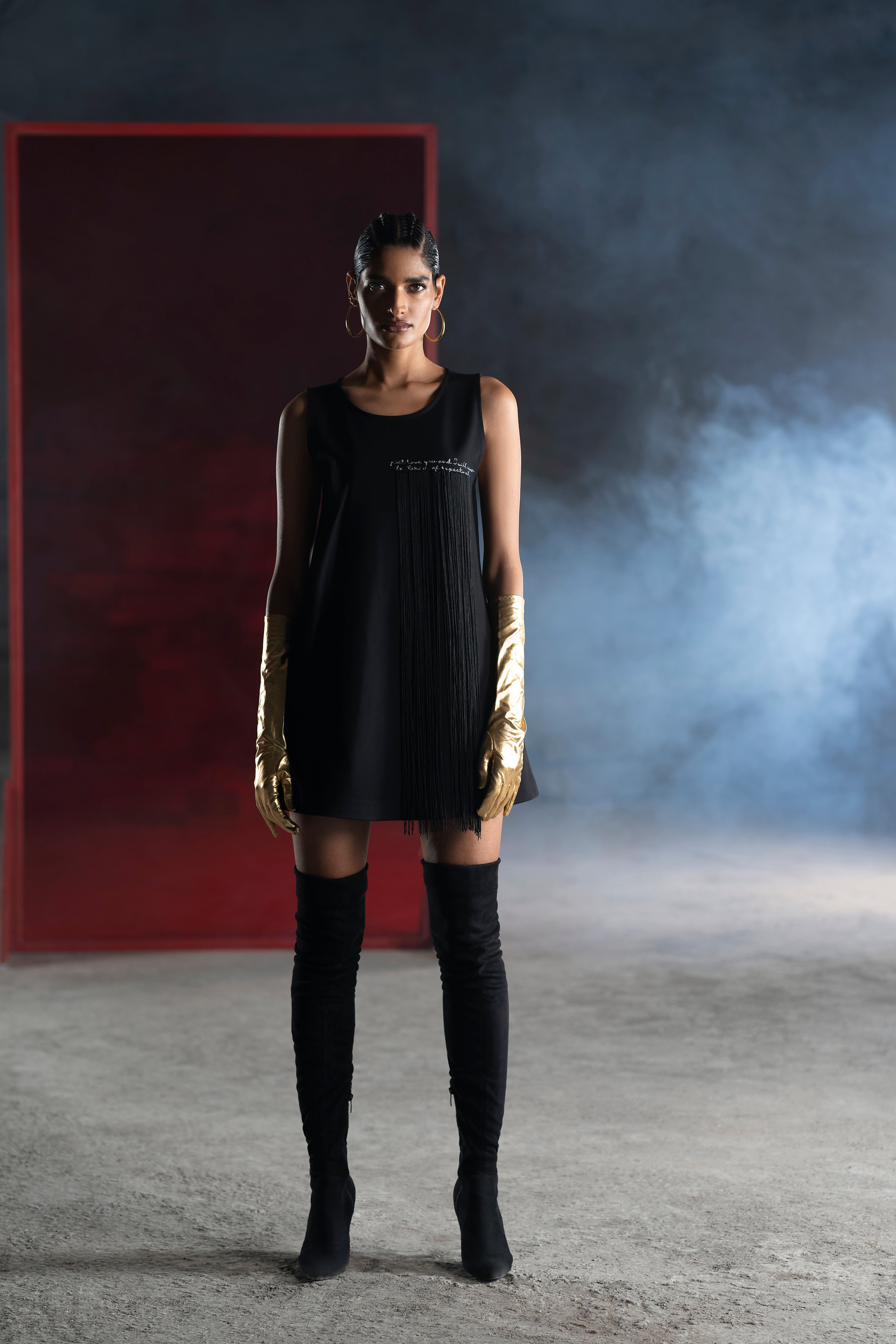 Sleeveless mini dress with a round neckline, has embroidery with long fringes on one side. It is carefully hand embroidered with thread work showcasing the real love letters of lovers from the 20th century.
