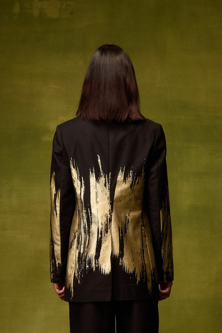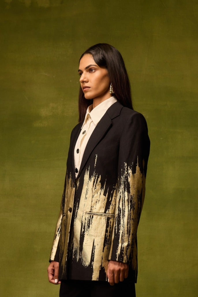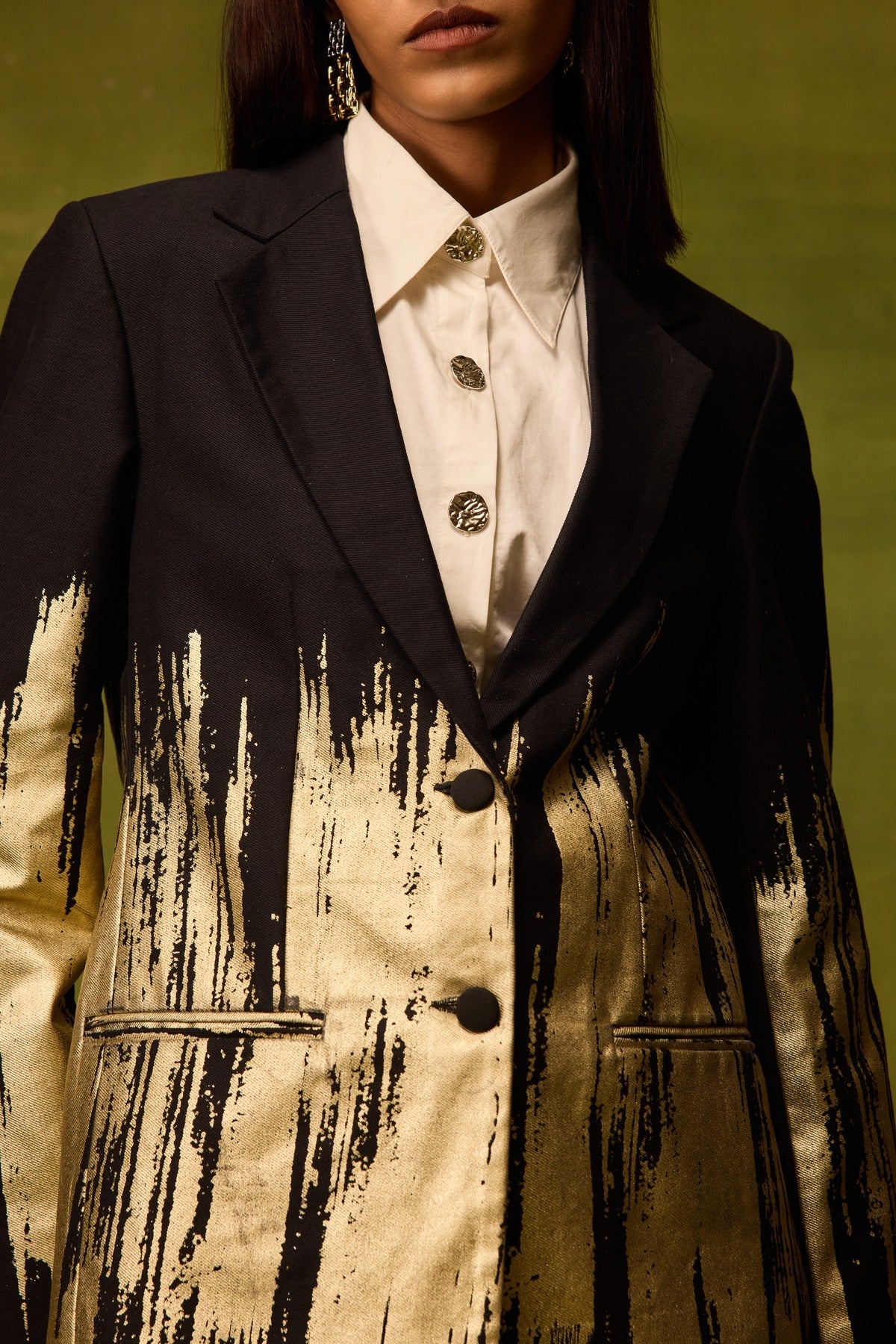 A power-dressing essential with a bold twist. This tailored longline blazer in black denim features dramatic gold foil detailing across the body and sleeves. Designed with a sharp lapel and button fastening, it offers versatility—wear it as a statement jacket or style as a blazer dress for impactful evenings.