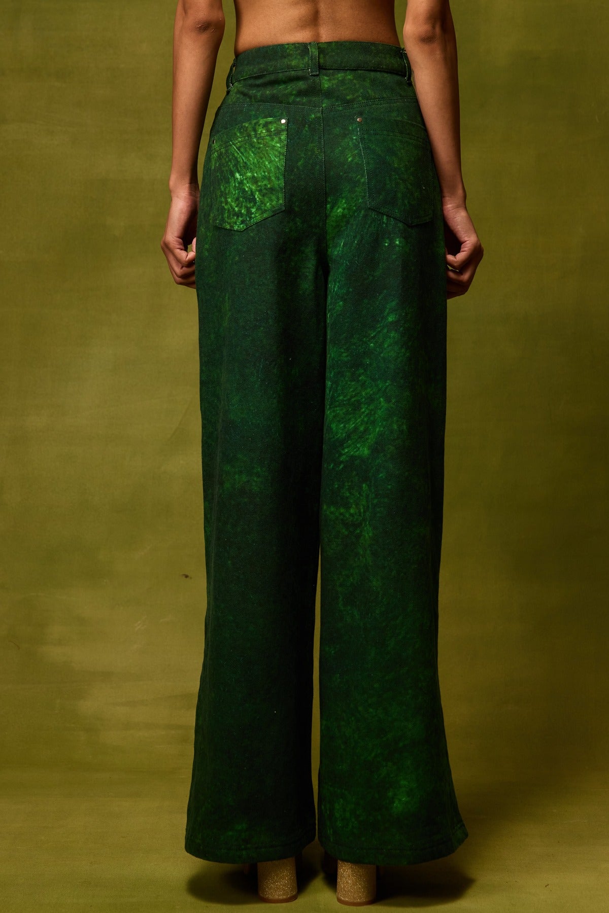 A structured sleeveless top in textured hand-drawn deep green print, detailed with a sleek front zip and subtle floral embroidery paired with straight trousers. Their relaxed silhouette makes them perfect for polished daywear or refined evening occasions.