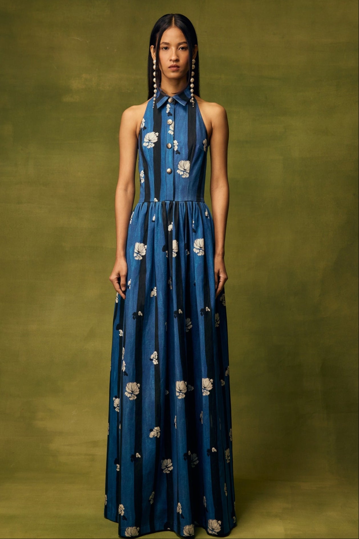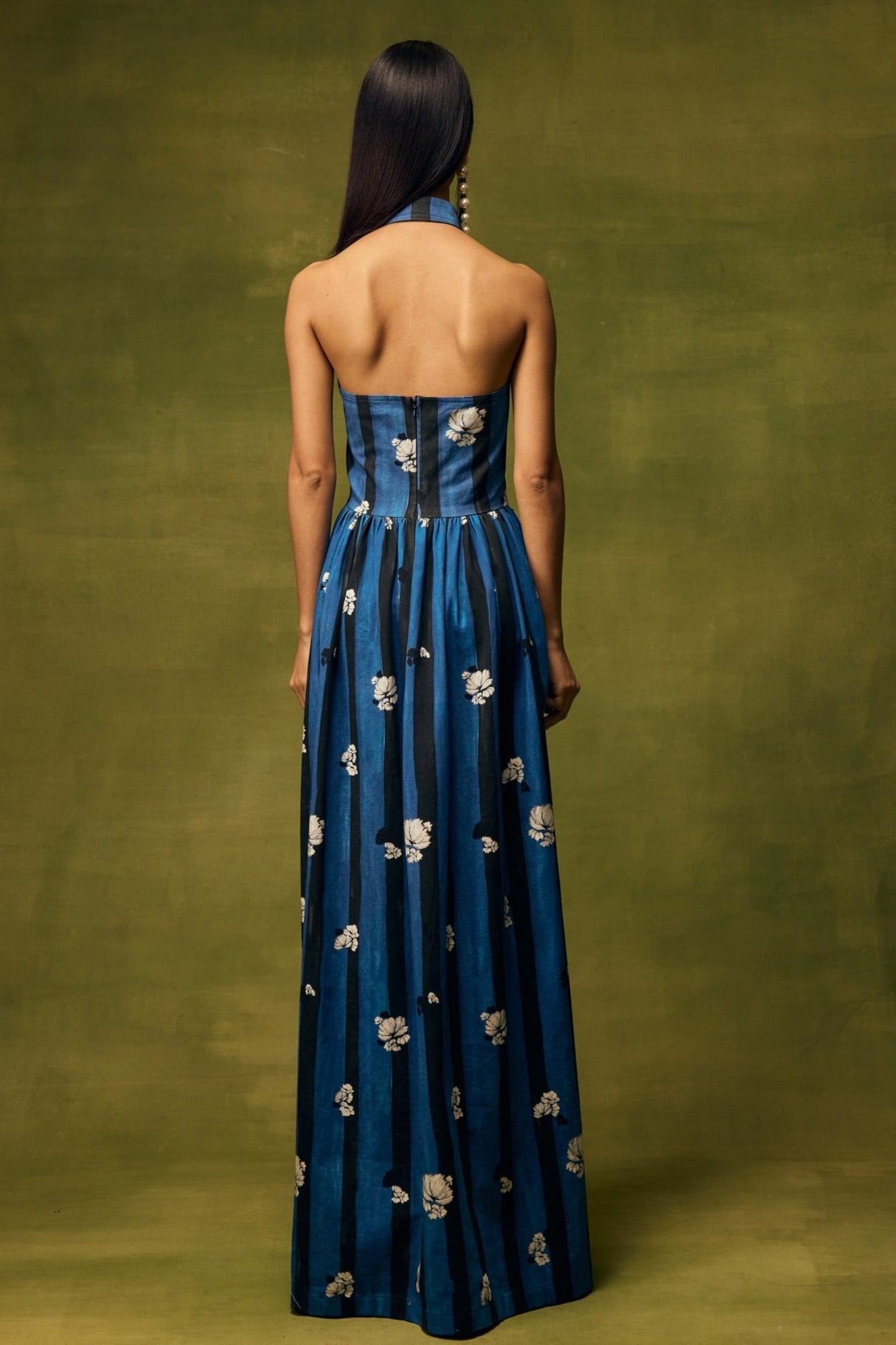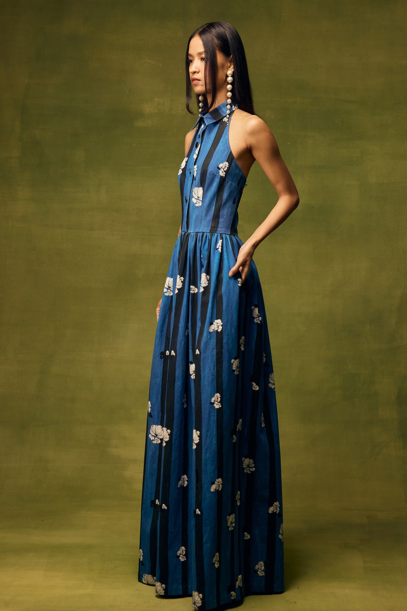A breezy, floor-grazing silhouette designed in hand-drawn blue and black striped print with delicate floral motifs. The halter neckline with buttoned detailing adds a touch of retro charm, while the gathered waistline creates an effortless flow. A perfect pick beach weddings, or resort evenings.