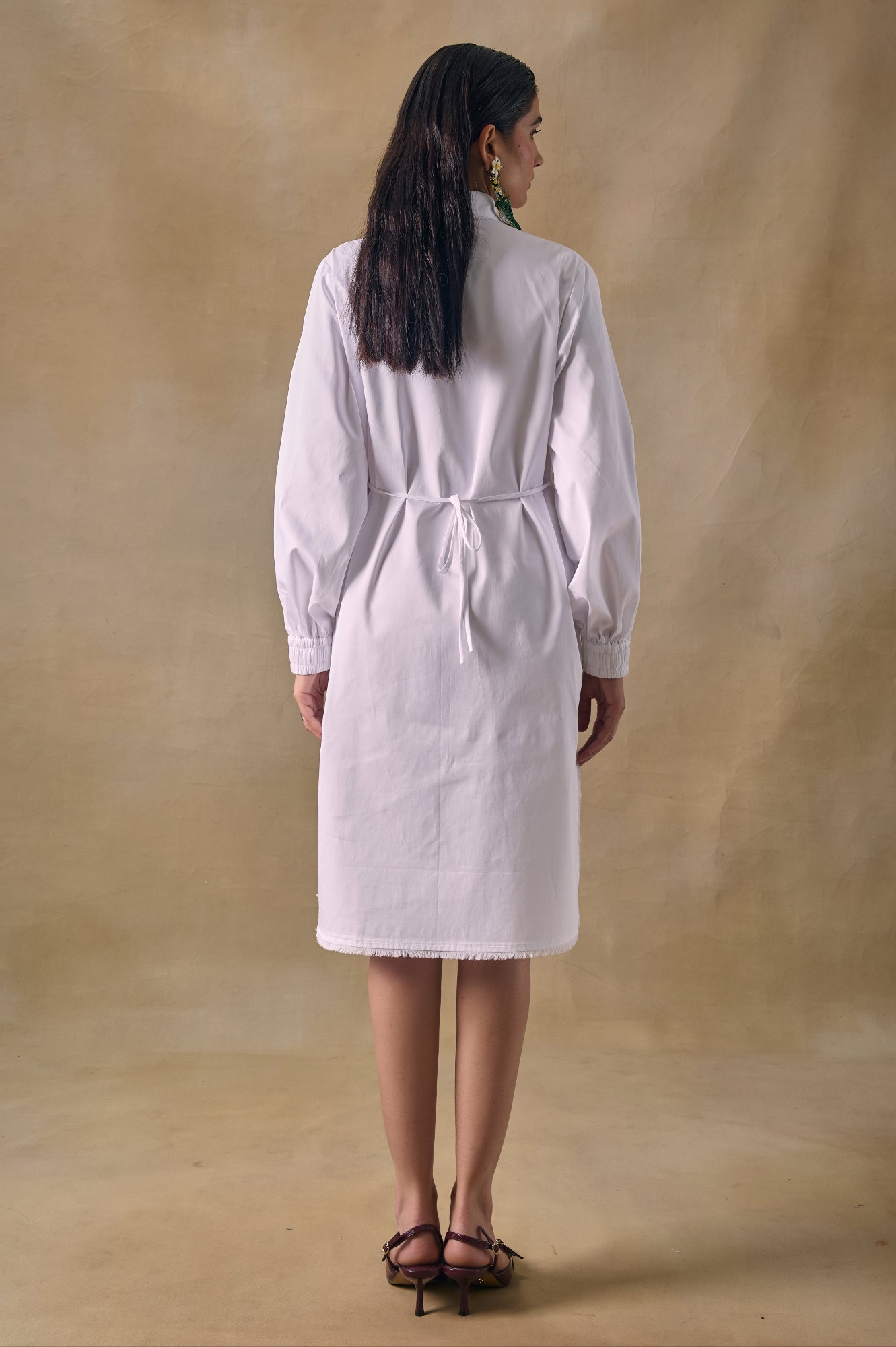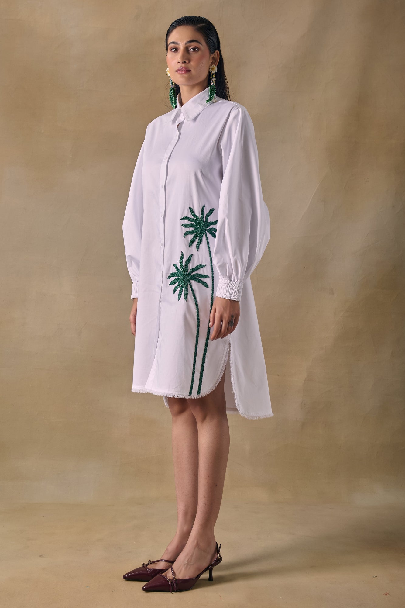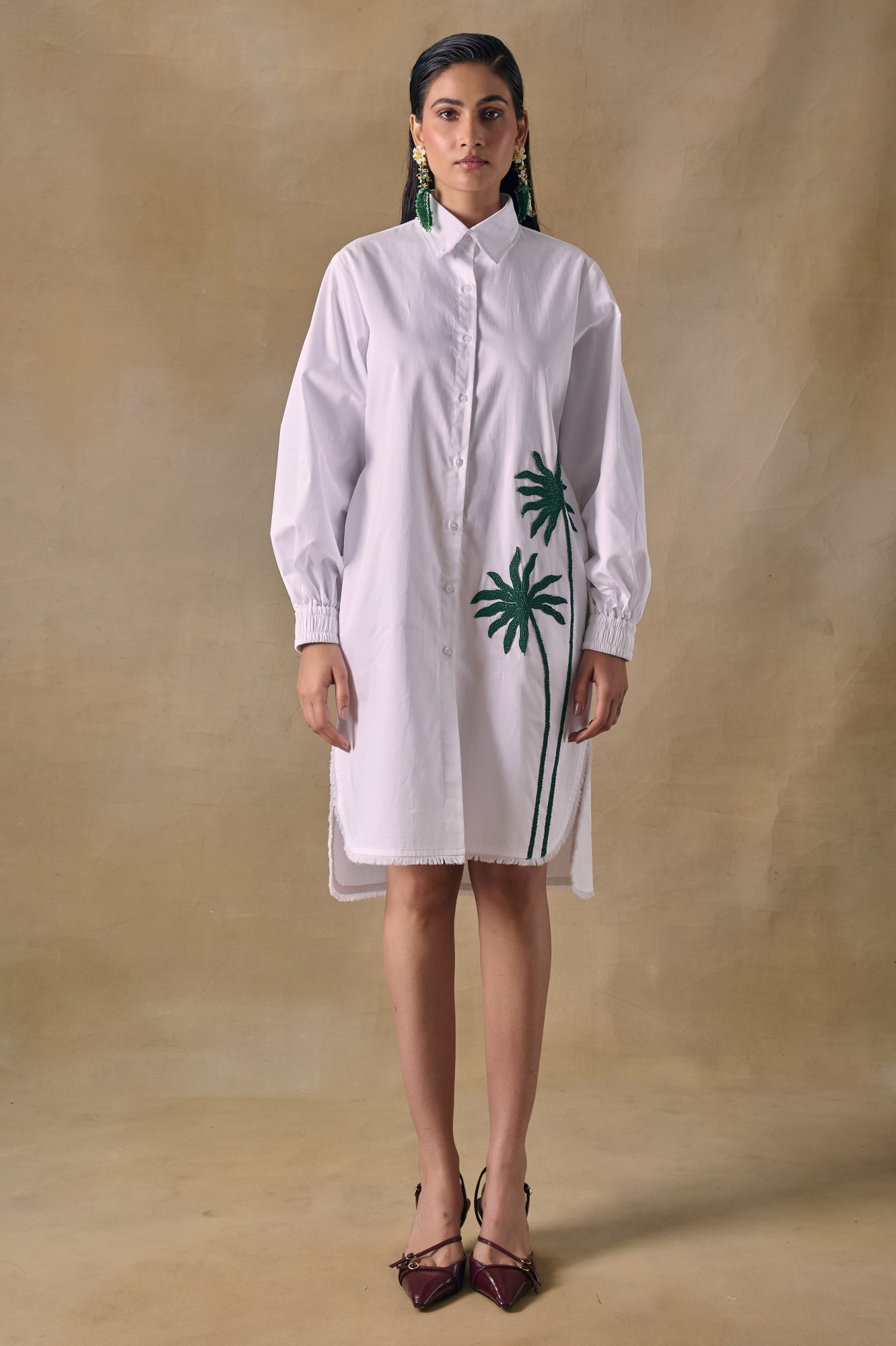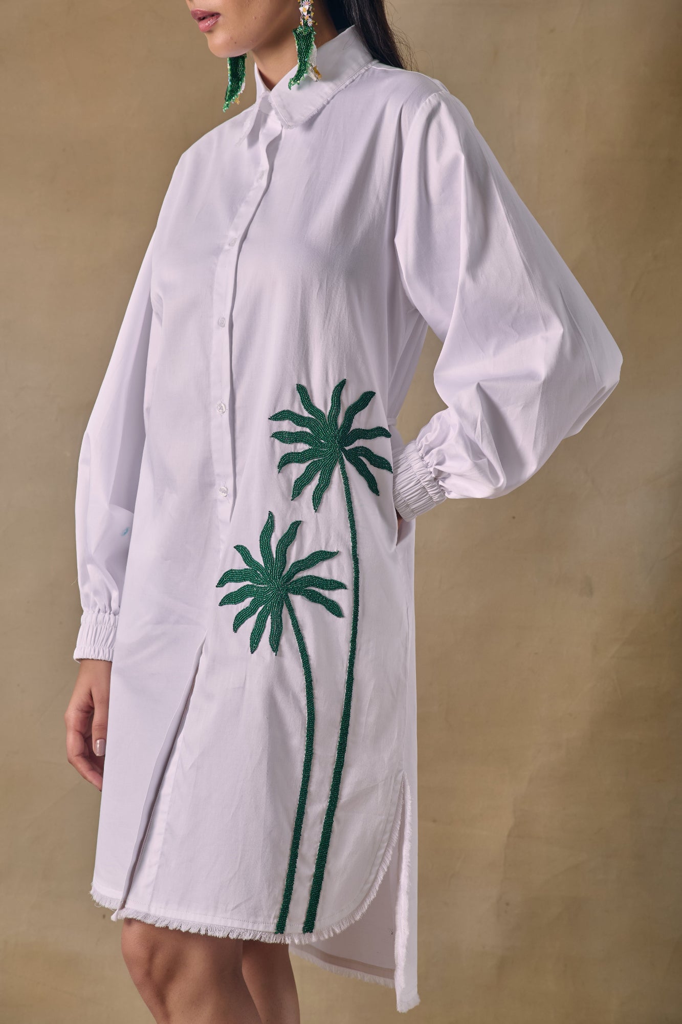 Asilah white button down shirt dress with palm tree threadwork embroidery and high-low hemline.