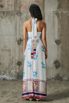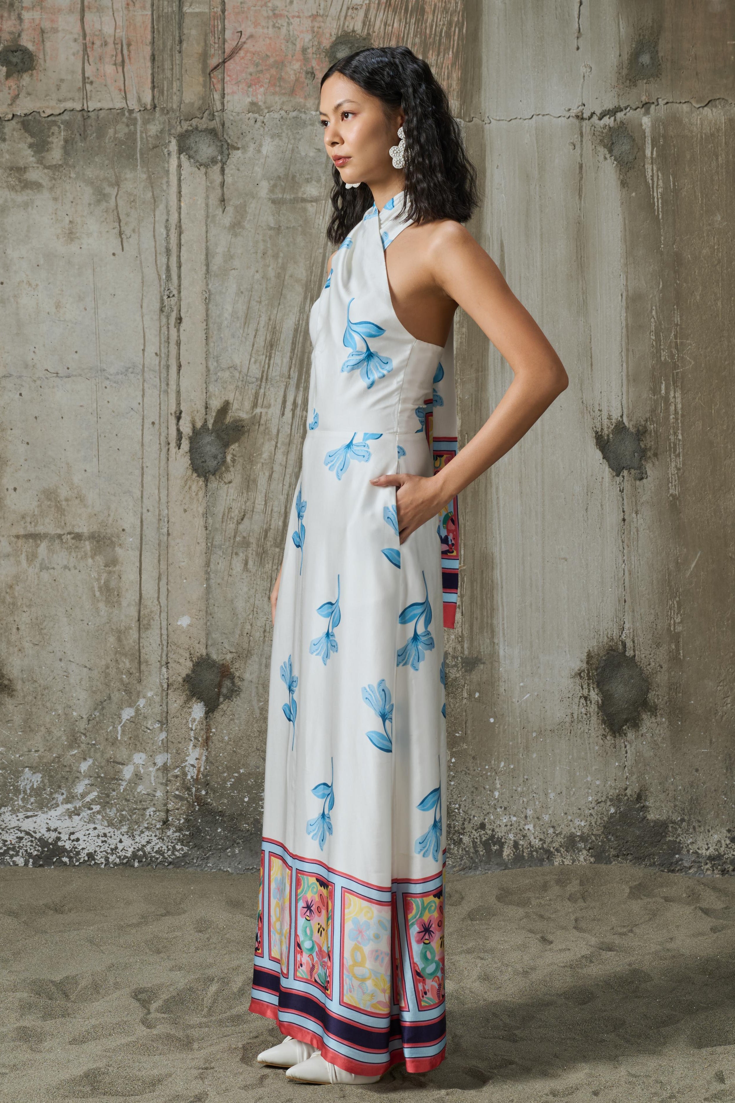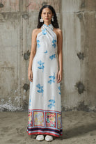 A maxi dress featuring a hand-drawn vibrant floral-frame print, designed with a halter neckline and back slit. The regular fit silhouette flows effortlessly, offering ease and fluid movement, making it the perfect piece for effortless styling.