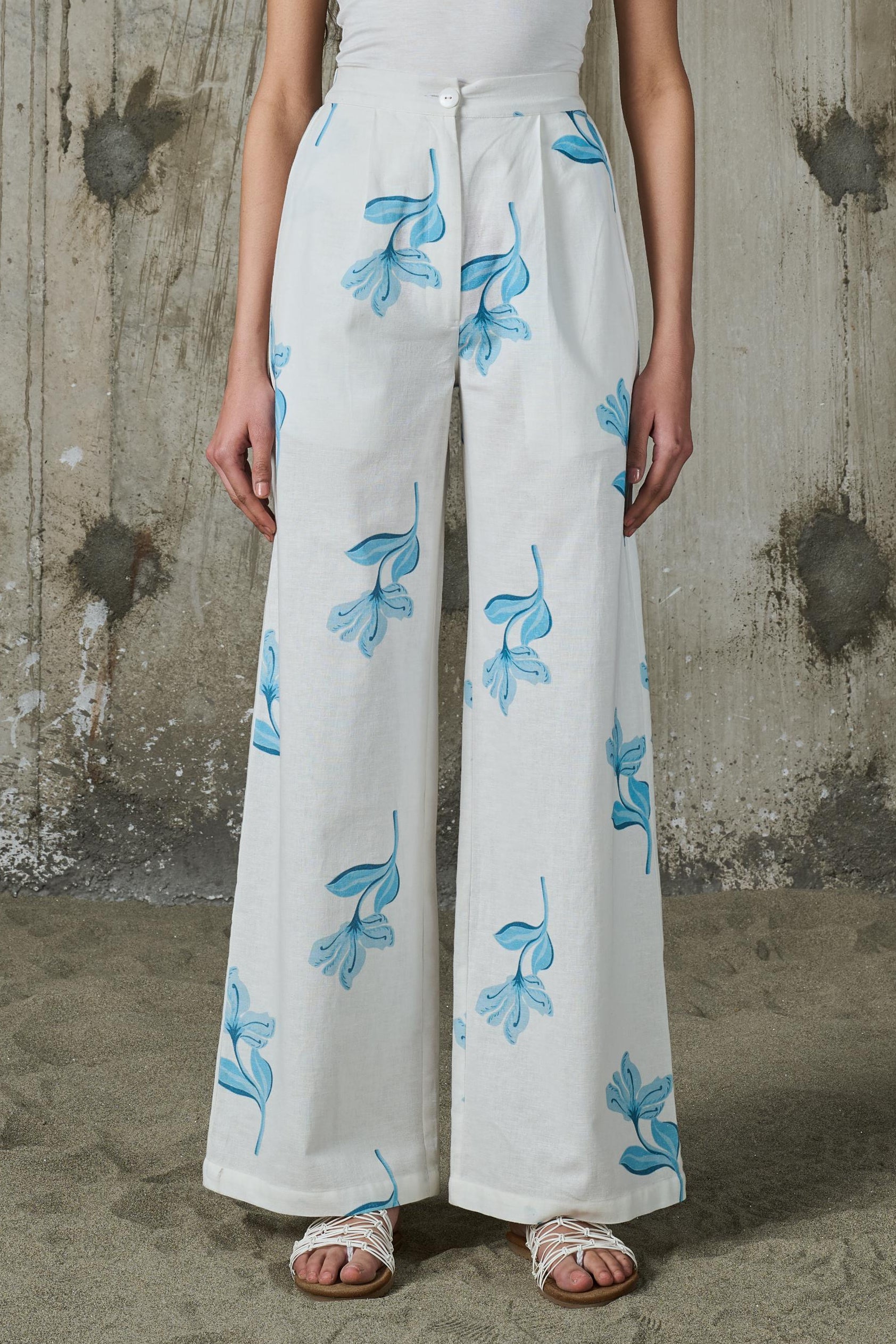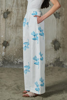 These straight trousers bring a modern twist to tailored dressing. Cut from breathable linen, they feature a hand-drawn vibrant floral print with cool blue blooms set against a cool white background. The high-rise fit and fluid leg offer a flattering silhouette, while clean waistband keep the look polished.