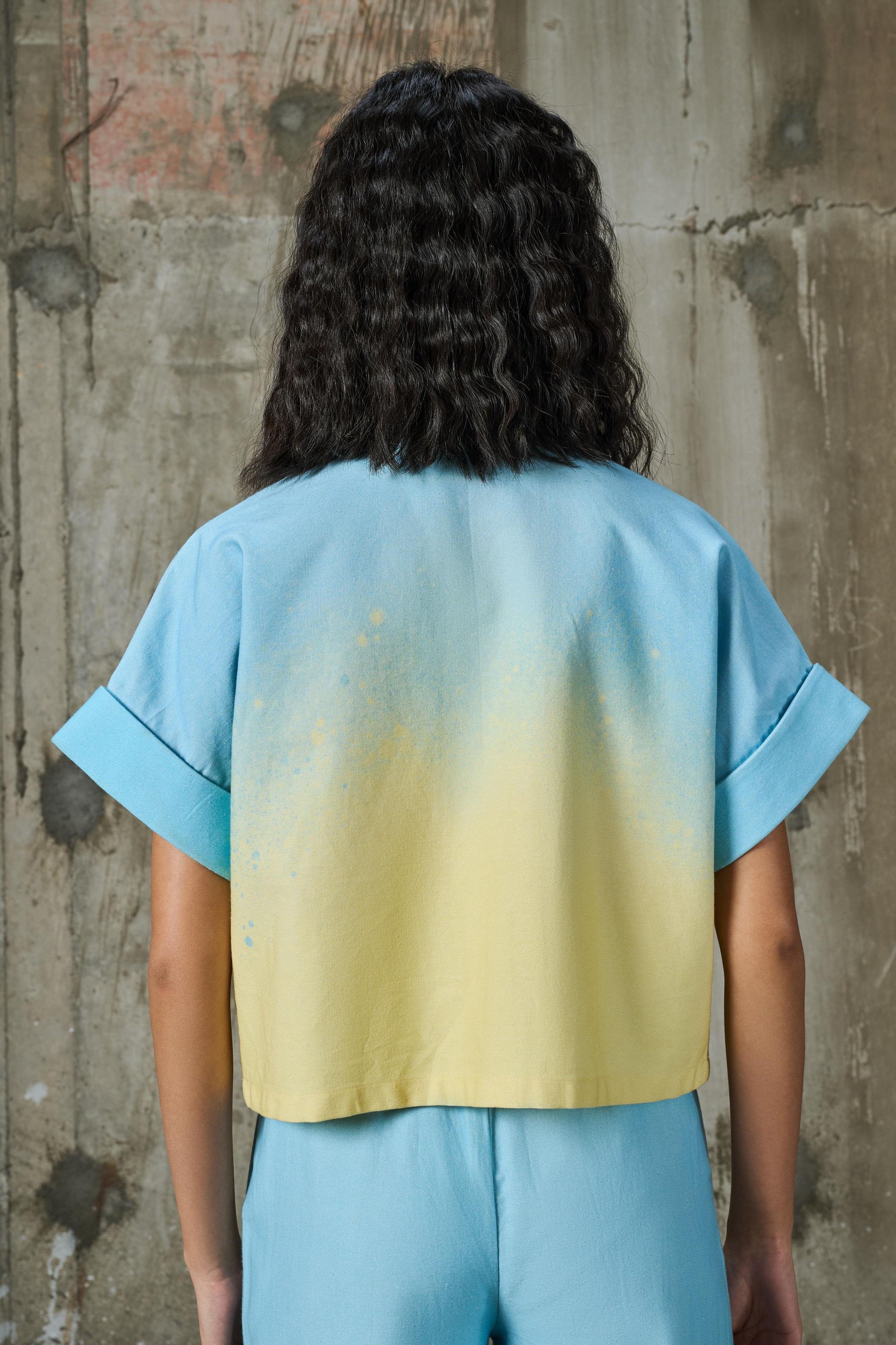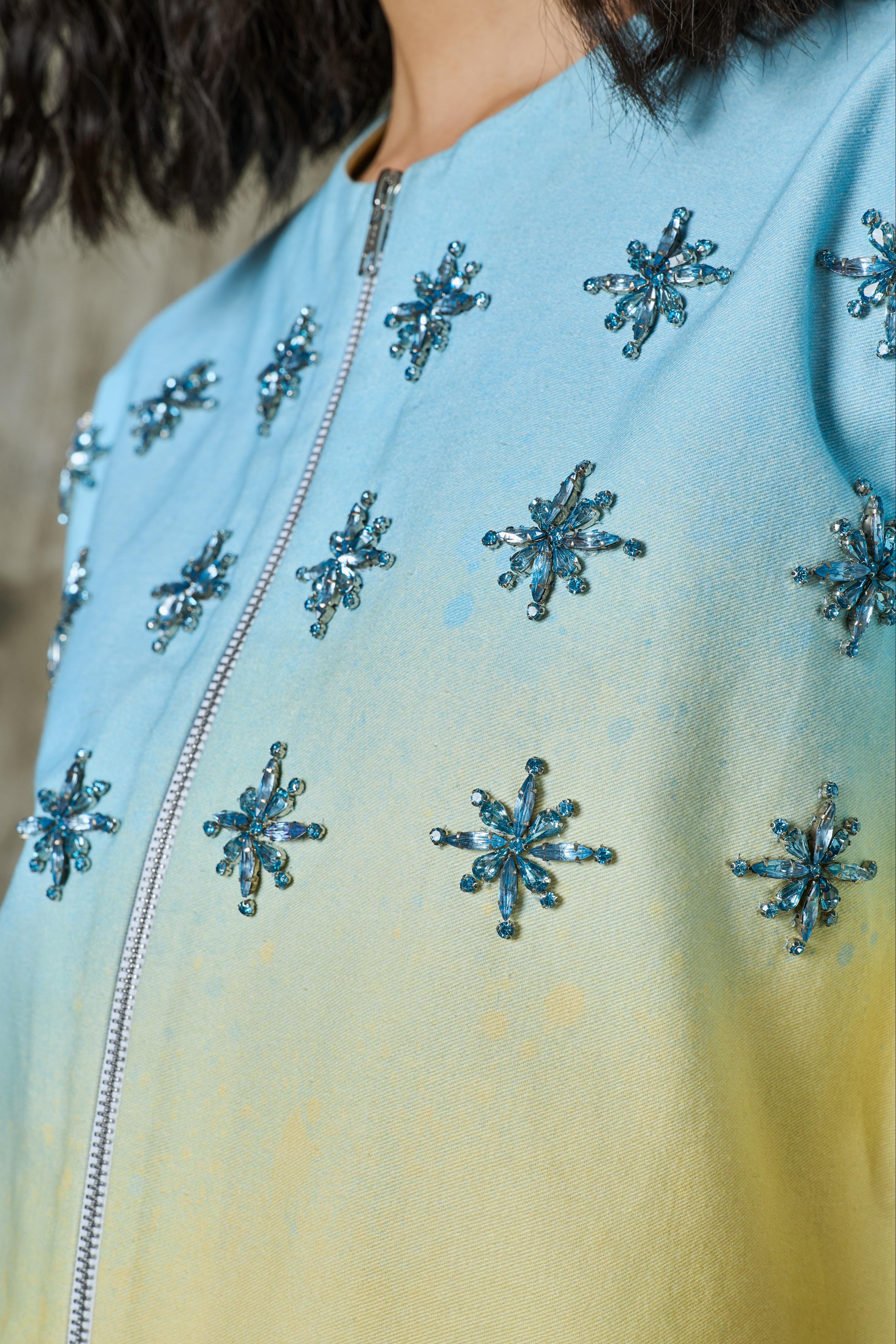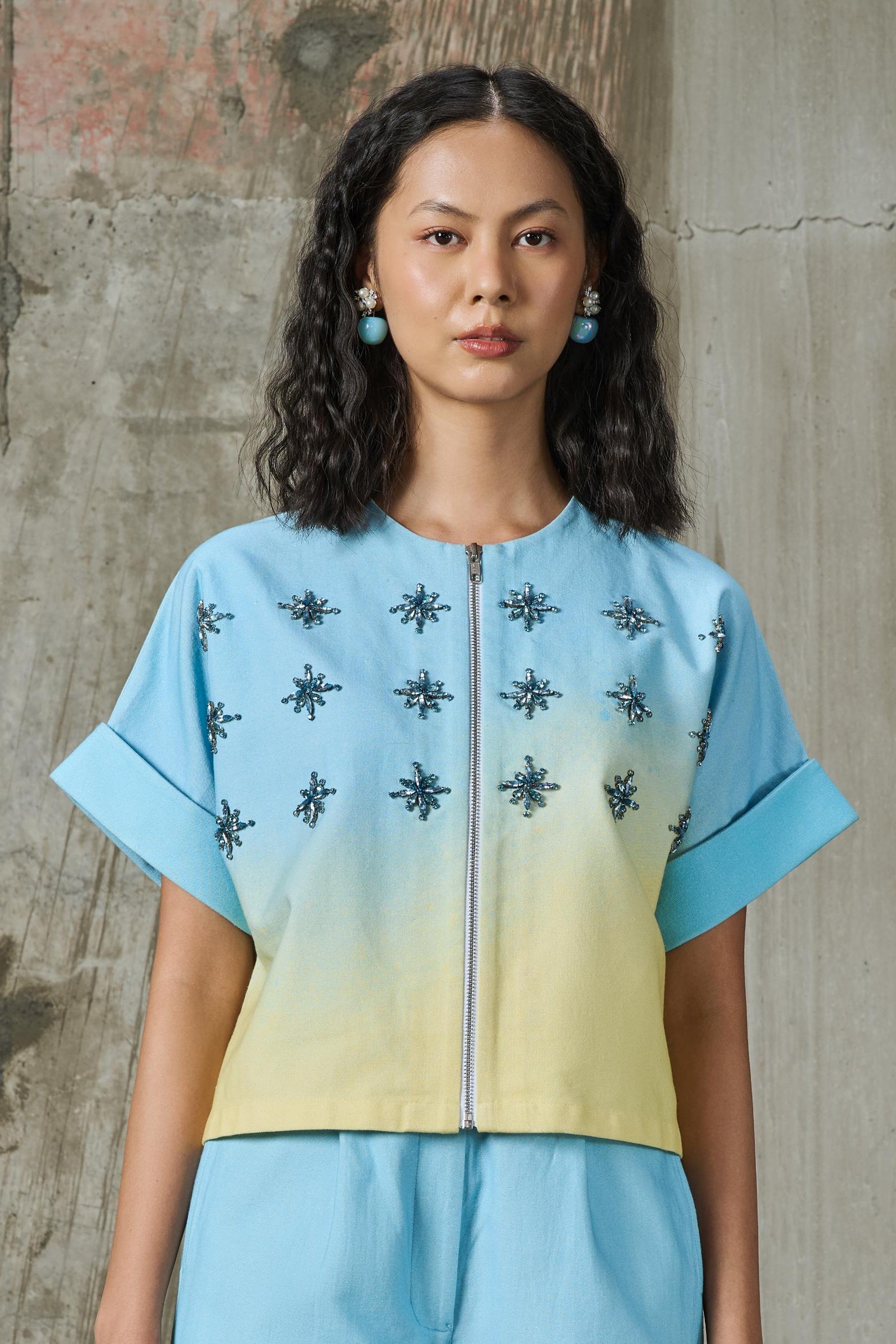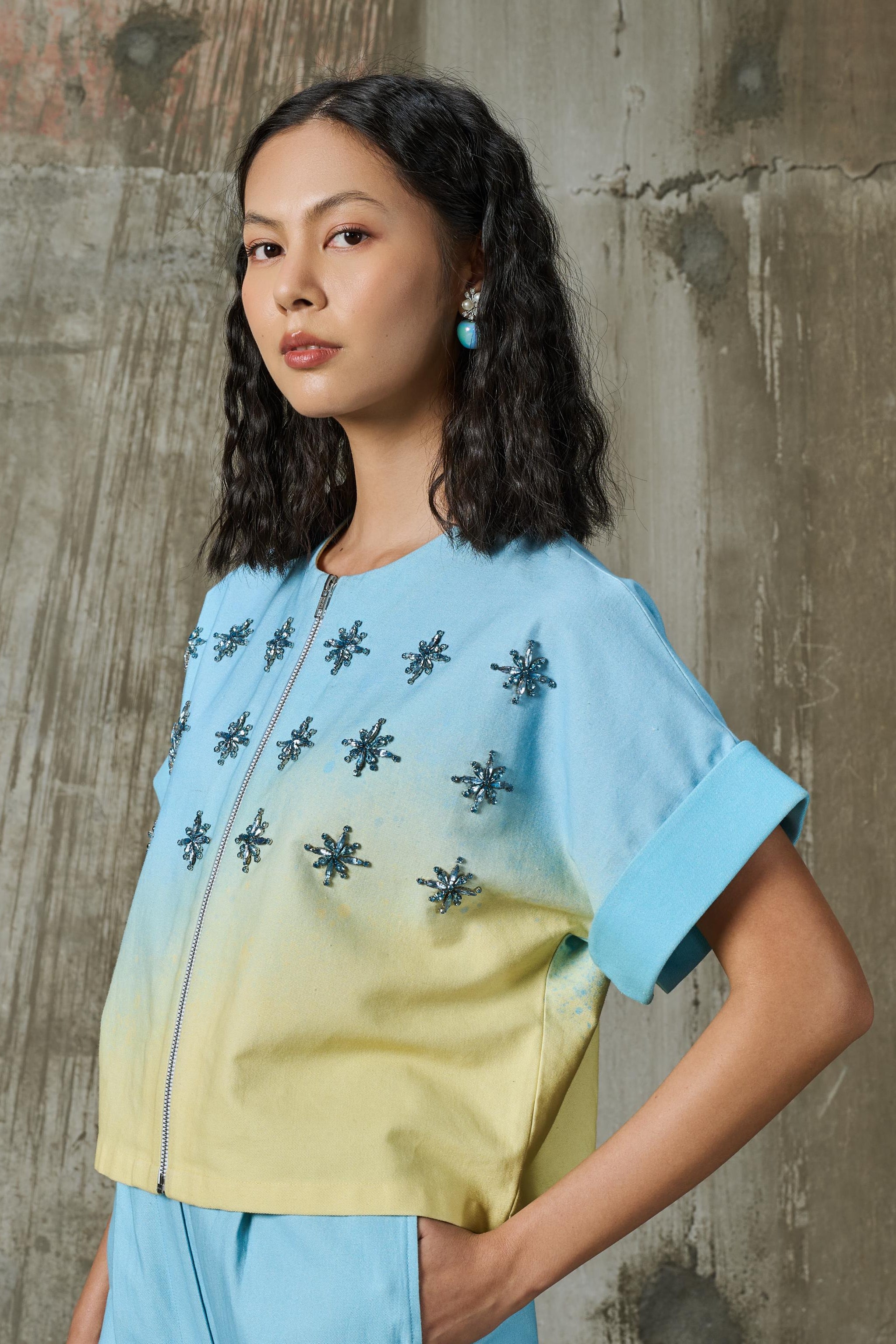 This boxy crop top featuring a hand-drawn vibrant ombre print, with zipper closure, short sleeves with a cuffed hem, and stone embellishments for a playful yet edgy finish. Perfect to elevate casual outfits or style with matching trousers for a co-ord statement.