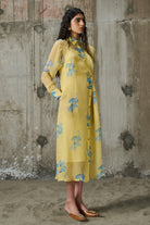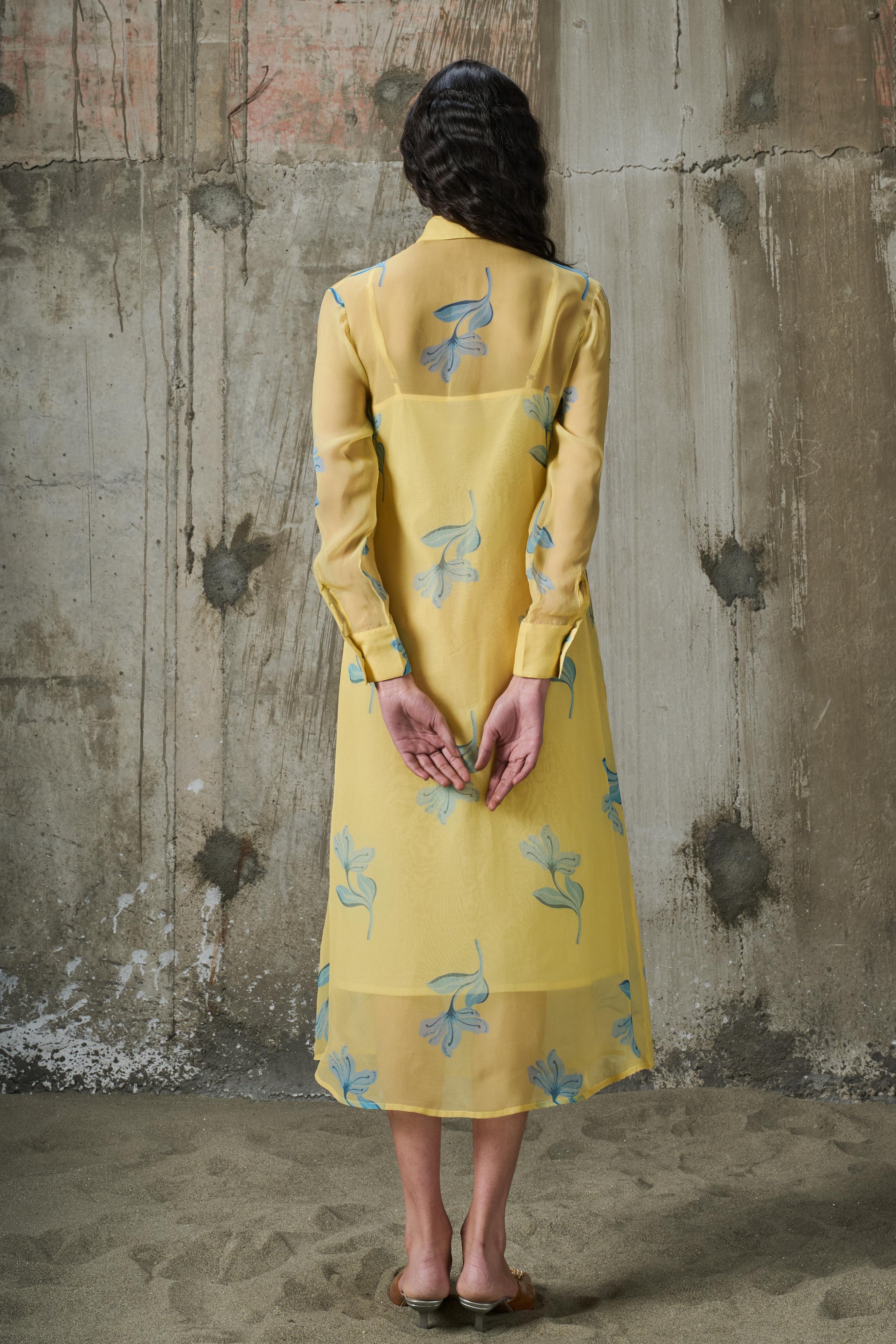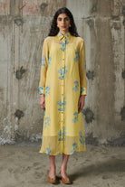 A button down dress featuring a hand-drawn vibrant floral print with cool blue blooms set against a warm yellow background. Designed with a pointed collar, button-down front, and rolled sleeves. The side button detail allows mutli-functional styling.