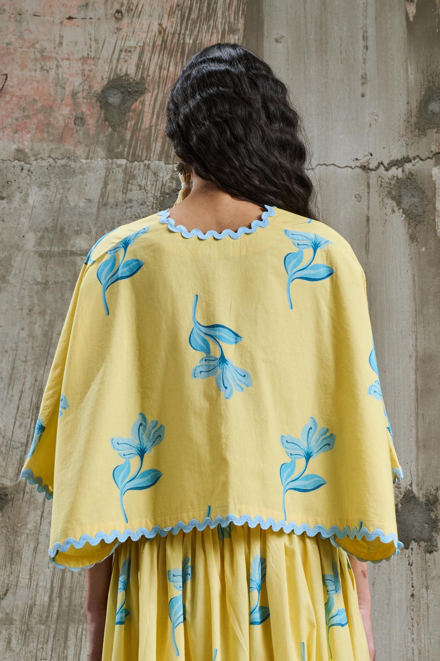 A button down shirt featuring a hand-drawn vibrant floral print with cool blue blooms set against a warm yellow background, designed with batwing sleeves and enhanced with cool blue lace. The relaxed silhouette flows effortlessly, offering ease and fluid movement, making it the perfect piece for effortless styling.