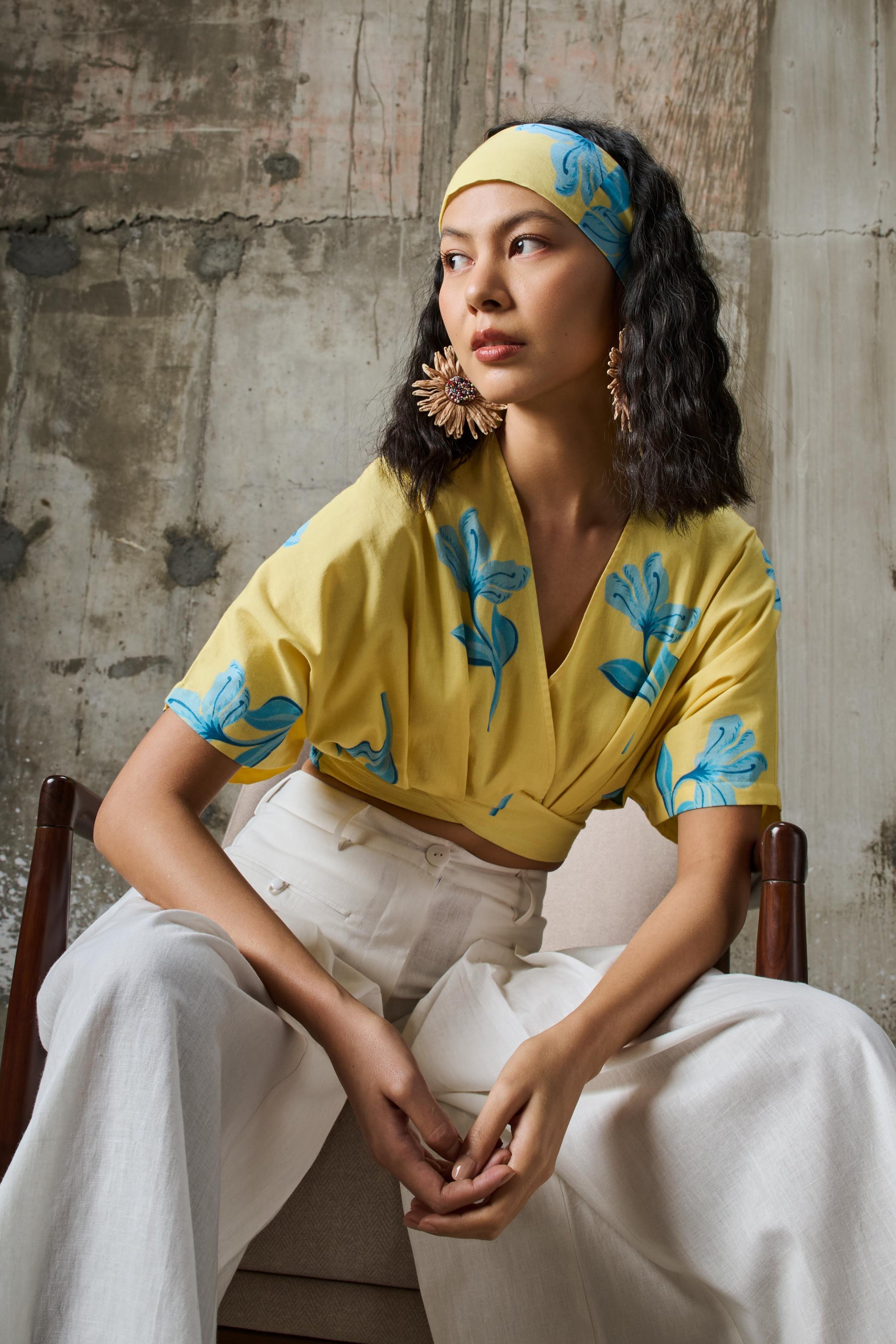 A copped top featuring a hand-drawn vibrant floral print with cool blue blooms set against a warm yellow background, designed with V-neckline, regular sleeves and elasticated waist. The relaxed silhouette flows effortlessly, offering ease and fluid movement, making it the perfect piece for effortless styling.