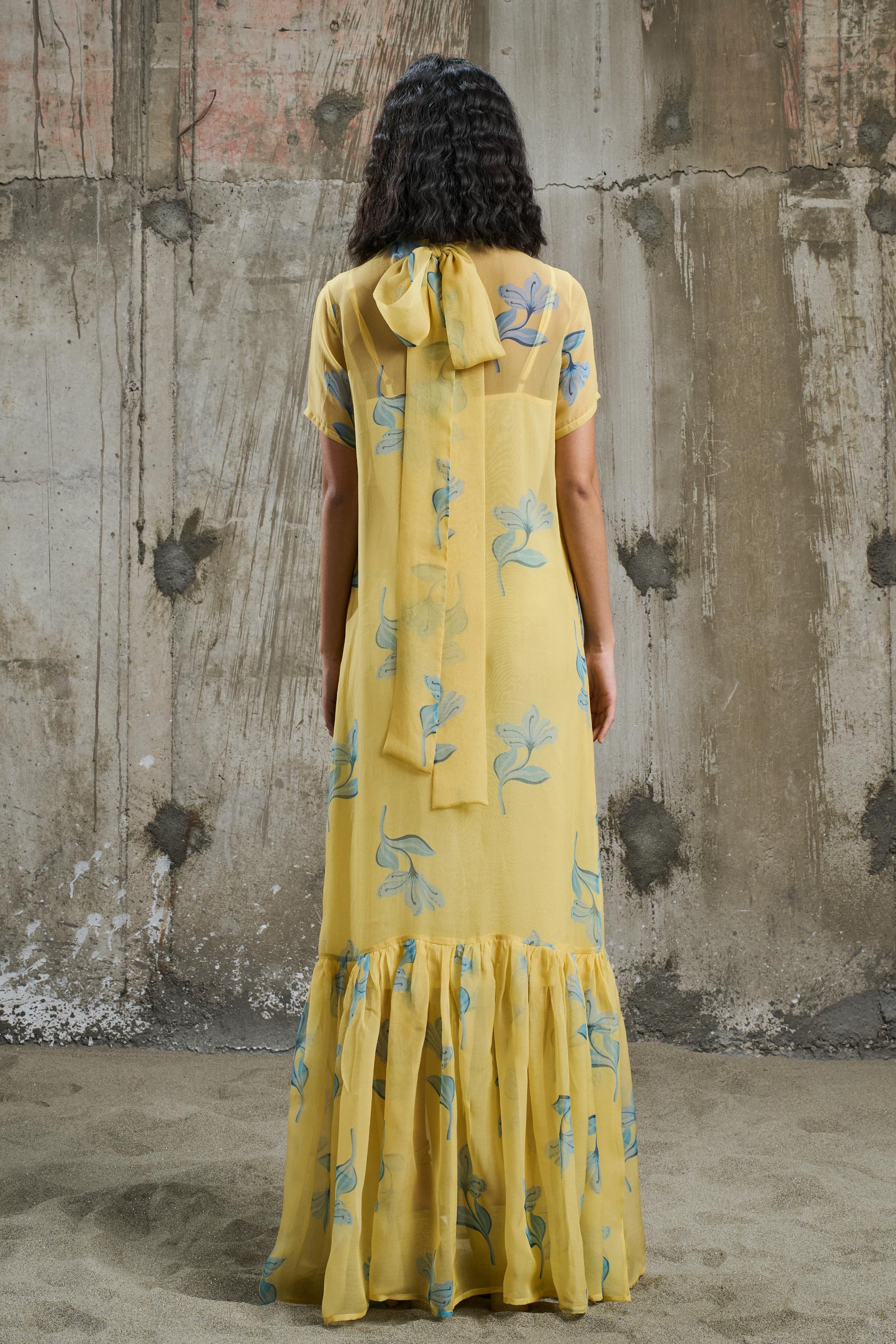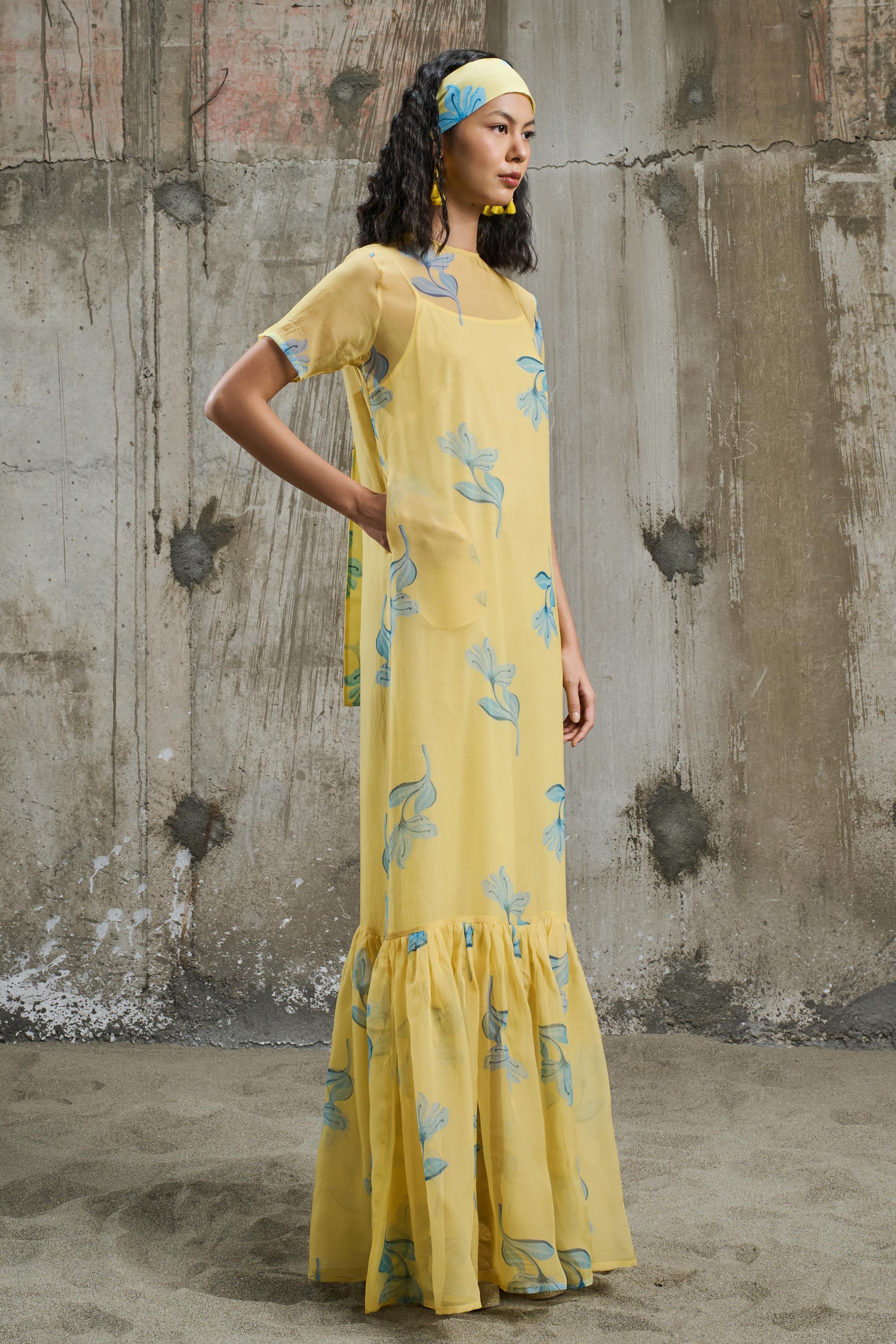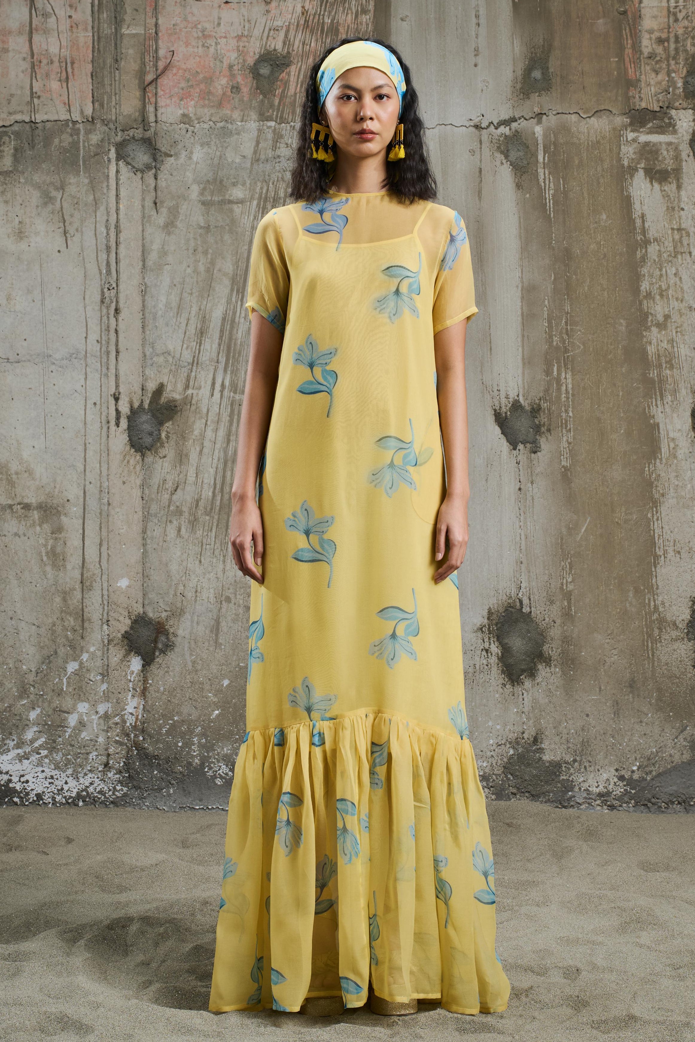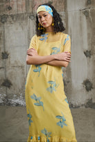 A maxi dress featuring a hand-drawn vibrant floral print with cool blue blooms set against a warm yellow background. Designed with a round neckline, short sleeves, and frills at the bottom. The regular silhouette flows effortlessly, offering ease and fluid movement, making it the perfect piece for effortless styling.
