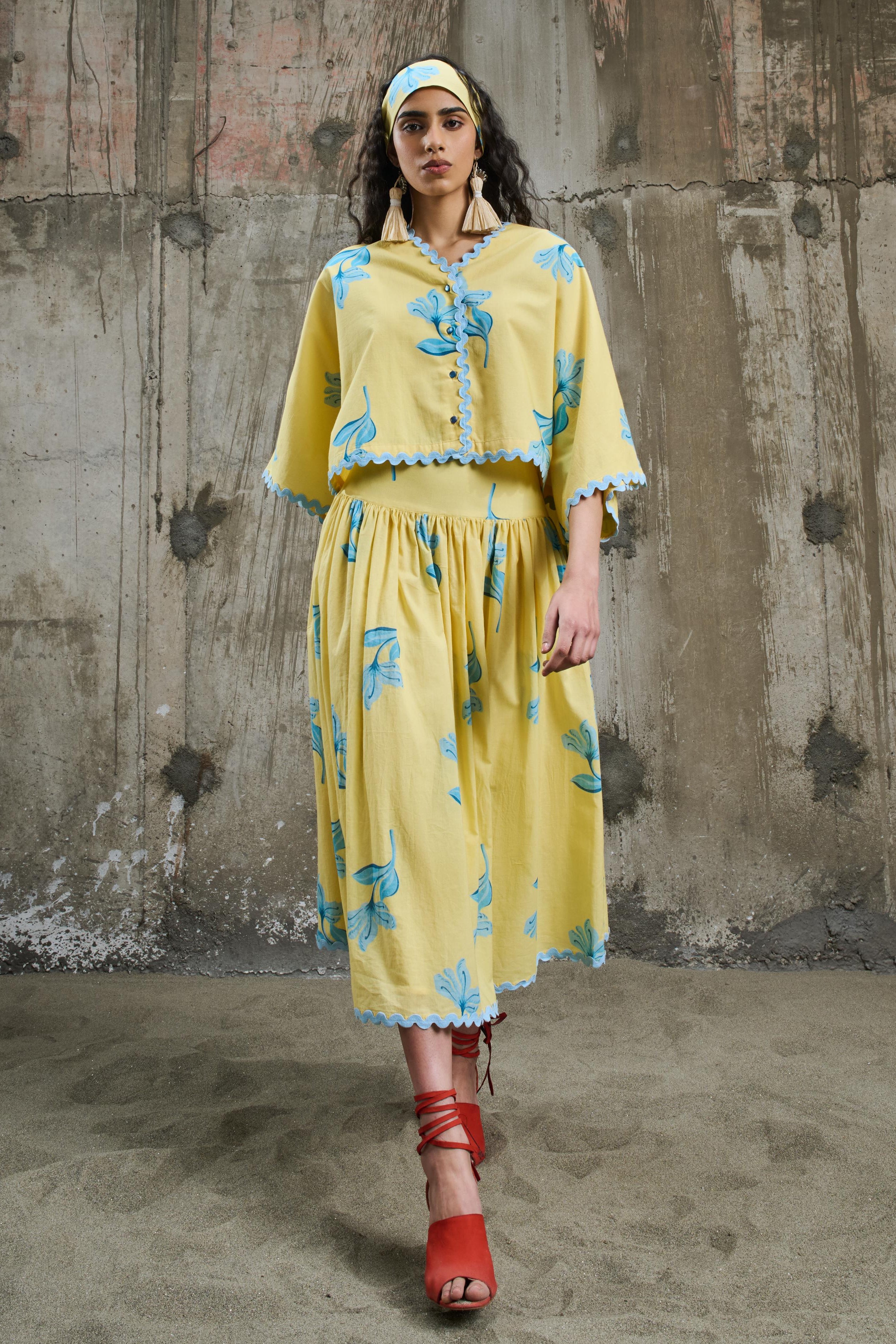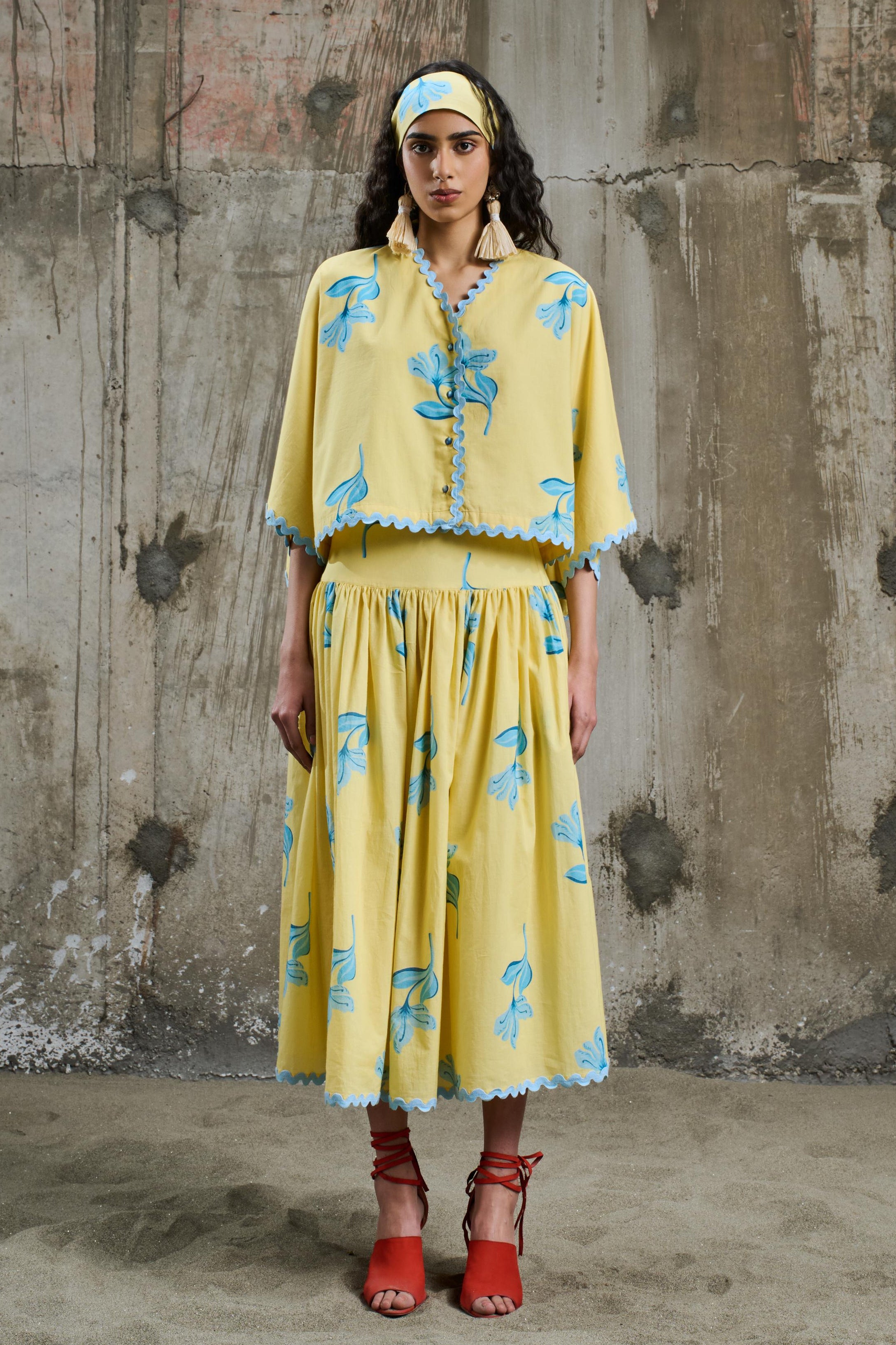 A button down shirt featuring a hand-drawn vibrant floral print with cool blue blooms set against a warm yellow background, designed with batwing sleeves and enhanced with cool blue lace. The relaxed silhouette flows effortlessly, offering ease and fluid movement, making it the perfect piece for effortless styling with a midi skirt, cut from breathable cambric, fitted from the hip offering a flattering silhouette, and enhanced with cool blue lace at the hem.