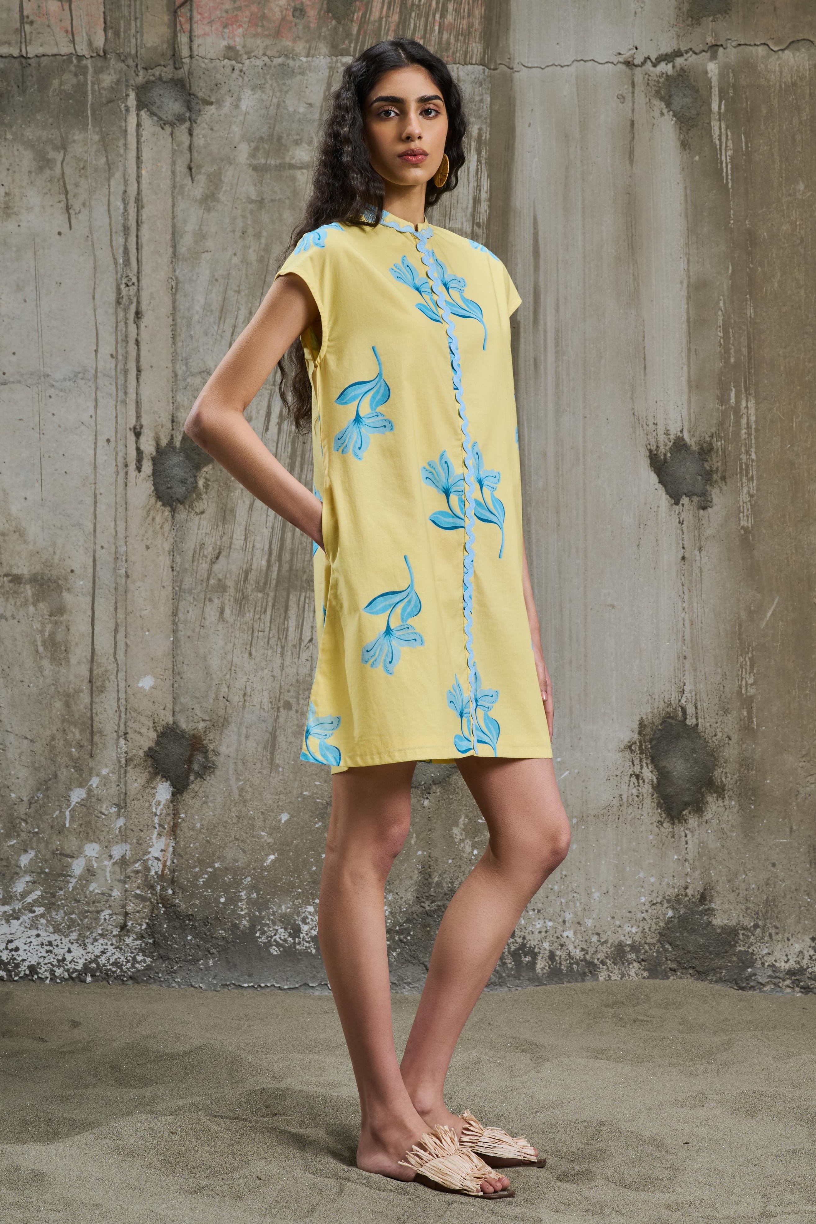 A mini dress featuring a hand-drawn vibrant floral print with cool blue blooms set against a warm yellow background, designed with round neckline, cap sleeves and front zipper closure enhanced with cool blue lace. The loose fit silhouette flows effortlessly, offering ease and fluid movement, making it the perfect piece for effortless styling.
