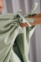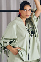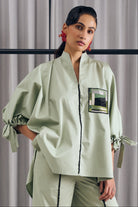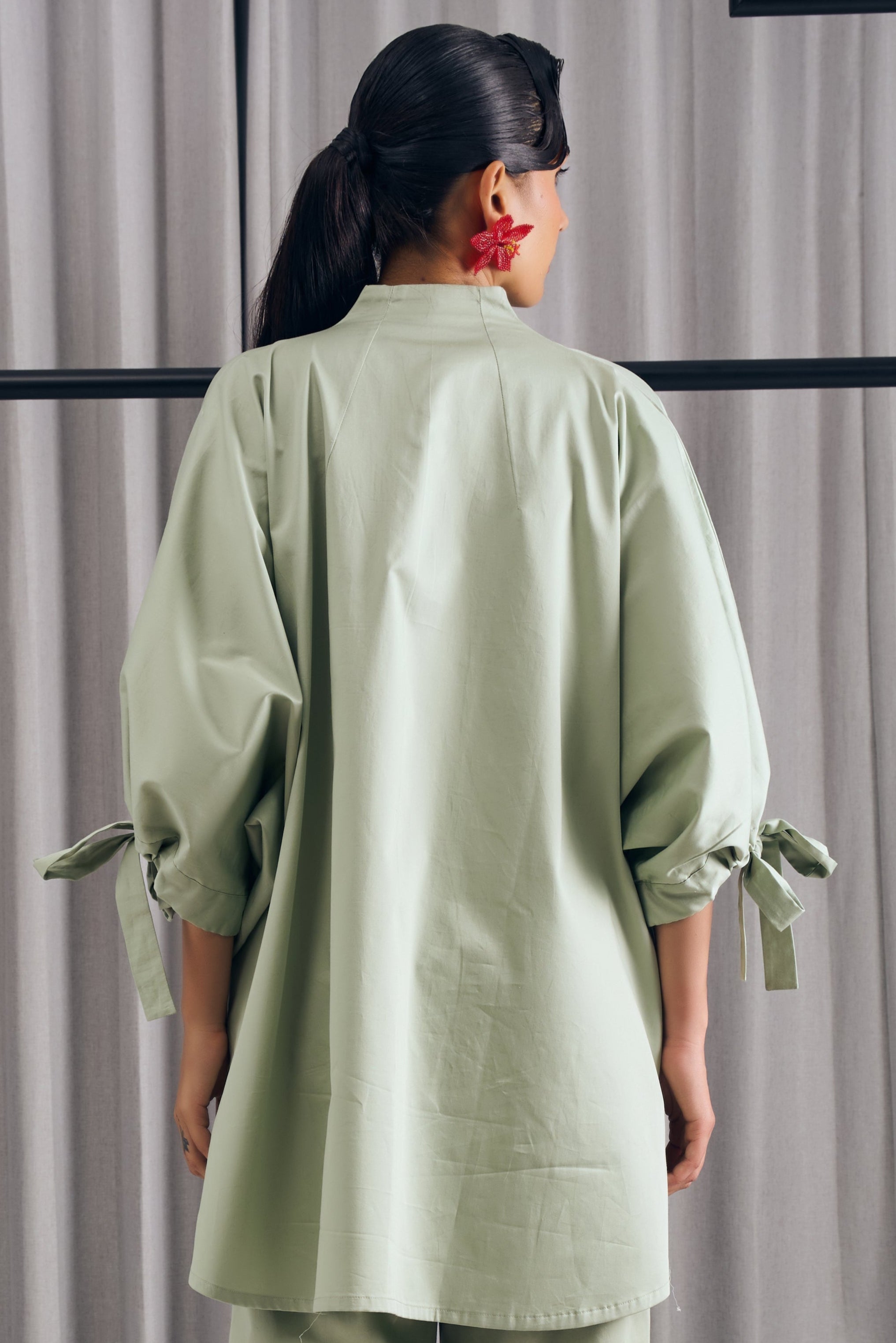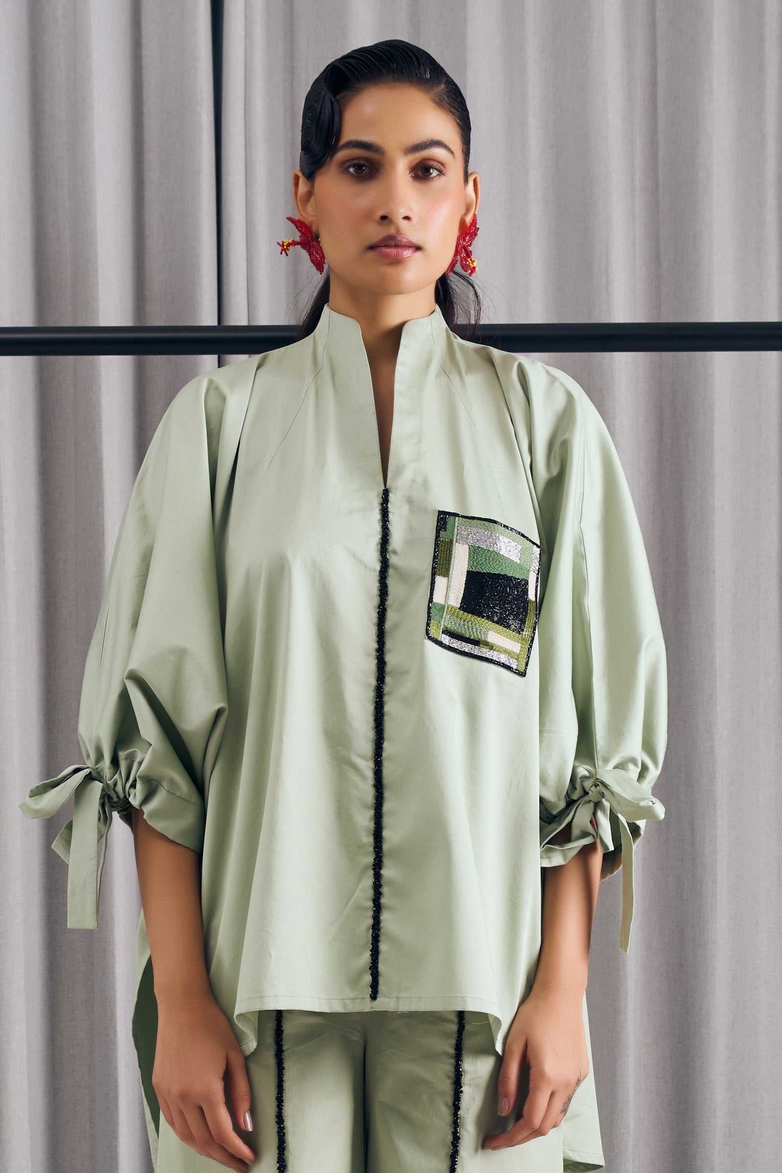 Solid green batwing shirt, extended 3/4 sleeves with adjustable straps, embroidered front patch pocket and high low hem with black katdana detailing in the front.