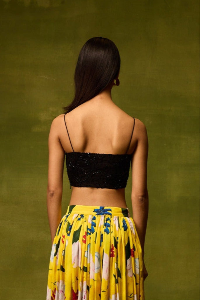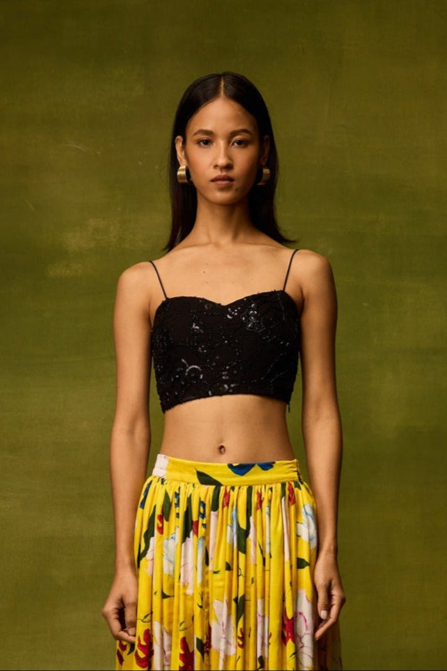 A chic black top crafted with shimmering sequin embellishments for a modern glam touch. Featuring a sweetheart neckline, noodle straps, and a flattering cropped length, it’s the perfect piece to pair with high-waist skirts, pants, or layer under jackets for evening looks.