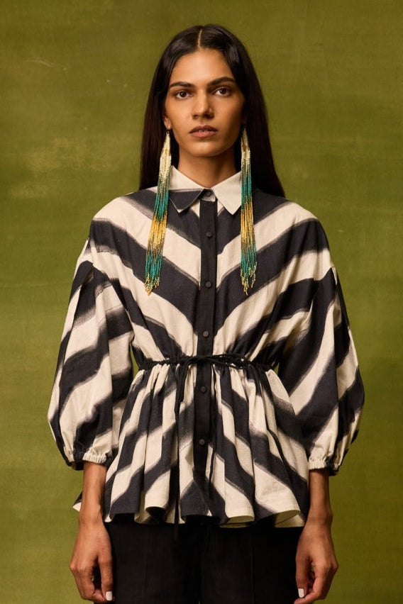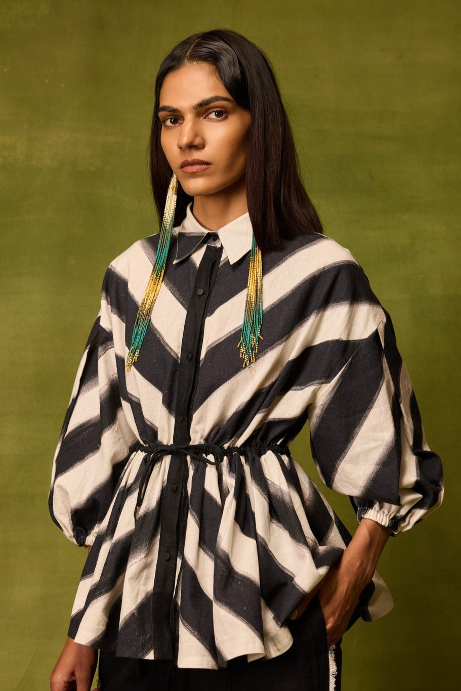 A contemporary take on a classic shirt, featuring a bold hand-drawn diagonal print. Designed with a pointed collar, button-down front, and voluminous sleeves with elasticated cuffs. The adjustable drawstring waist cinches the silhouette, allowing you to style it fitted or relaxed for versatile wear.