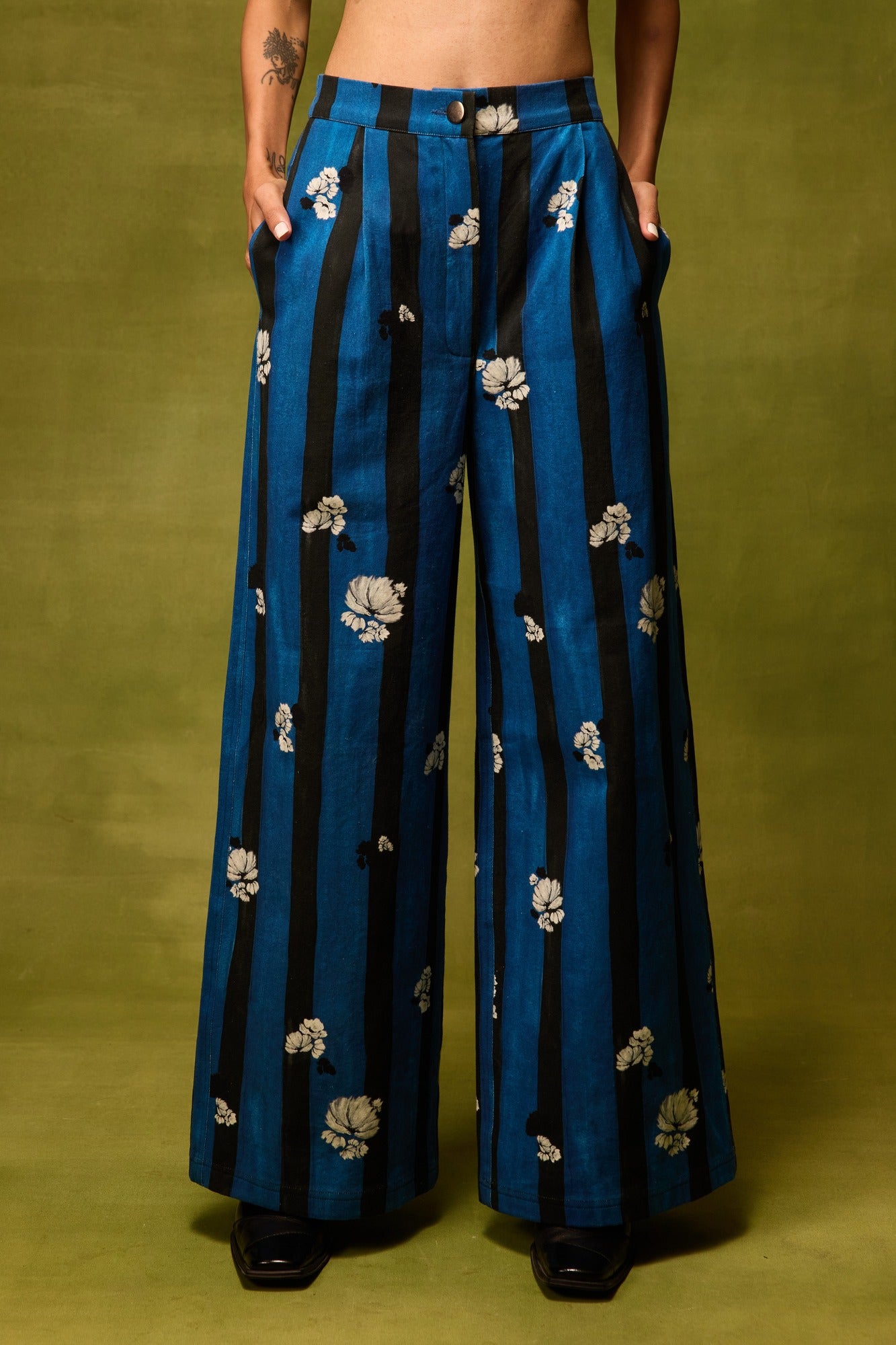 Designed in hand-drawn blue and black striped print with delicate floral motifs, these straight trousers bring together comfort and elegance. The structured pleats and high-rise fit make them a standout piece for contemporary dressing.