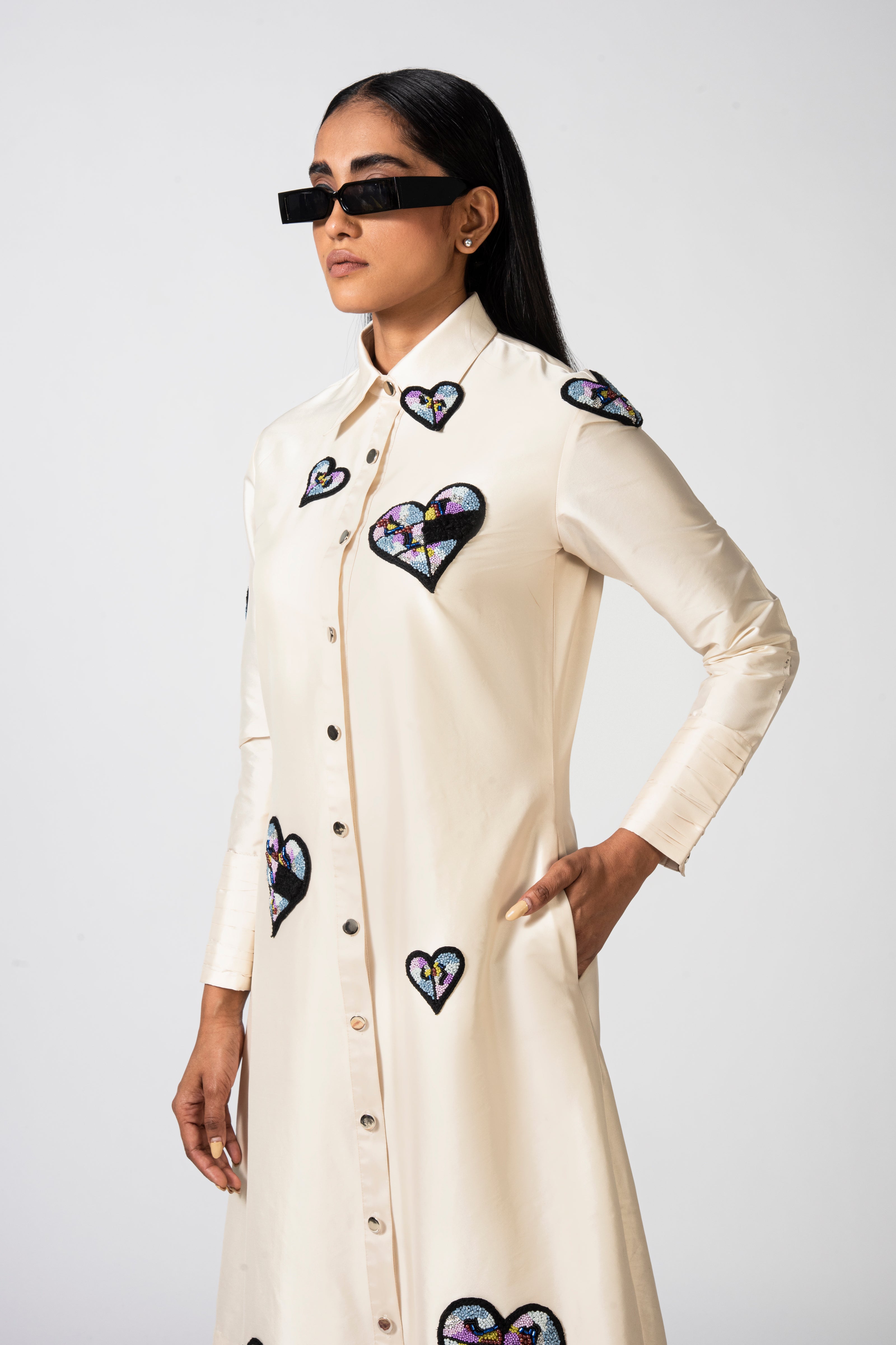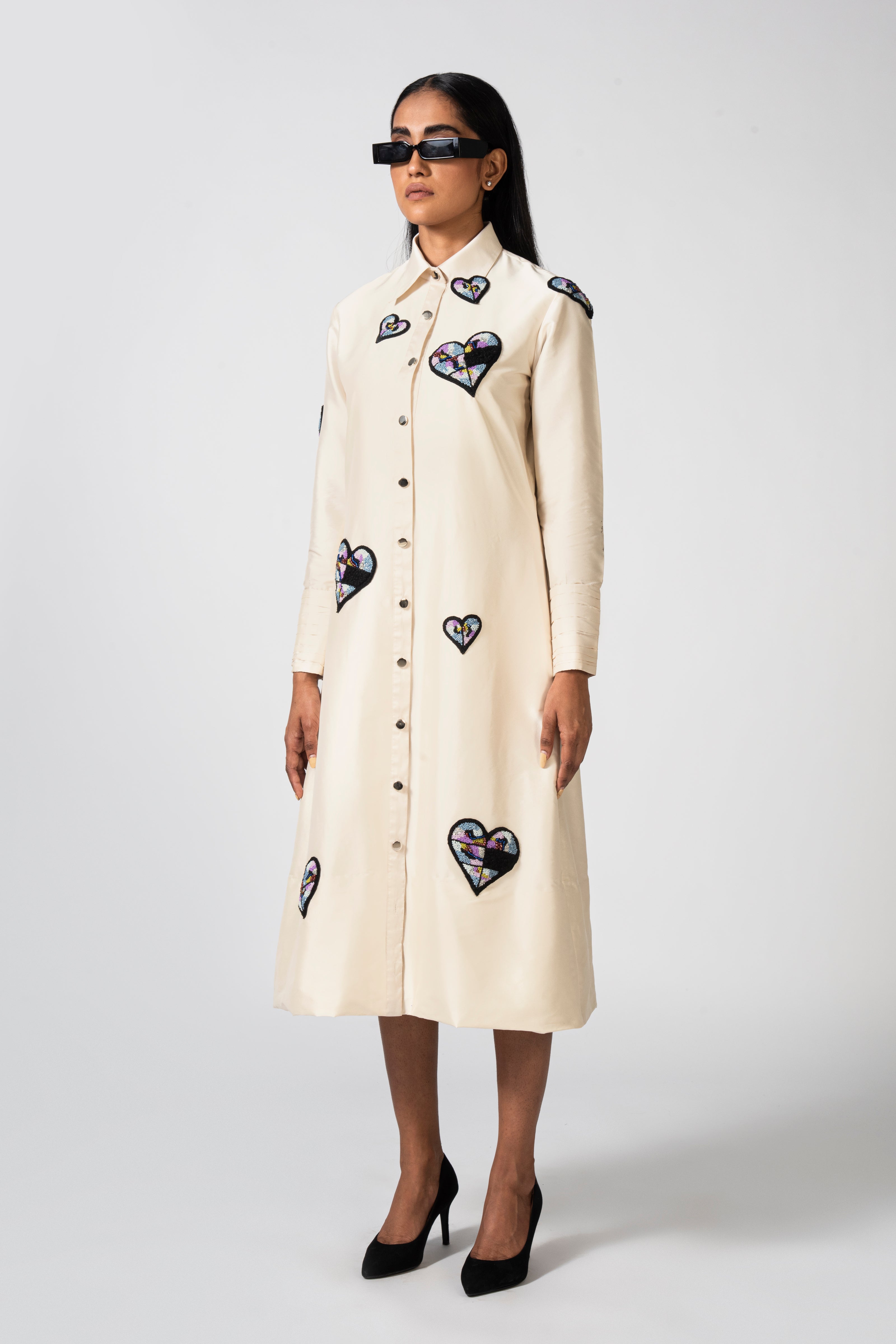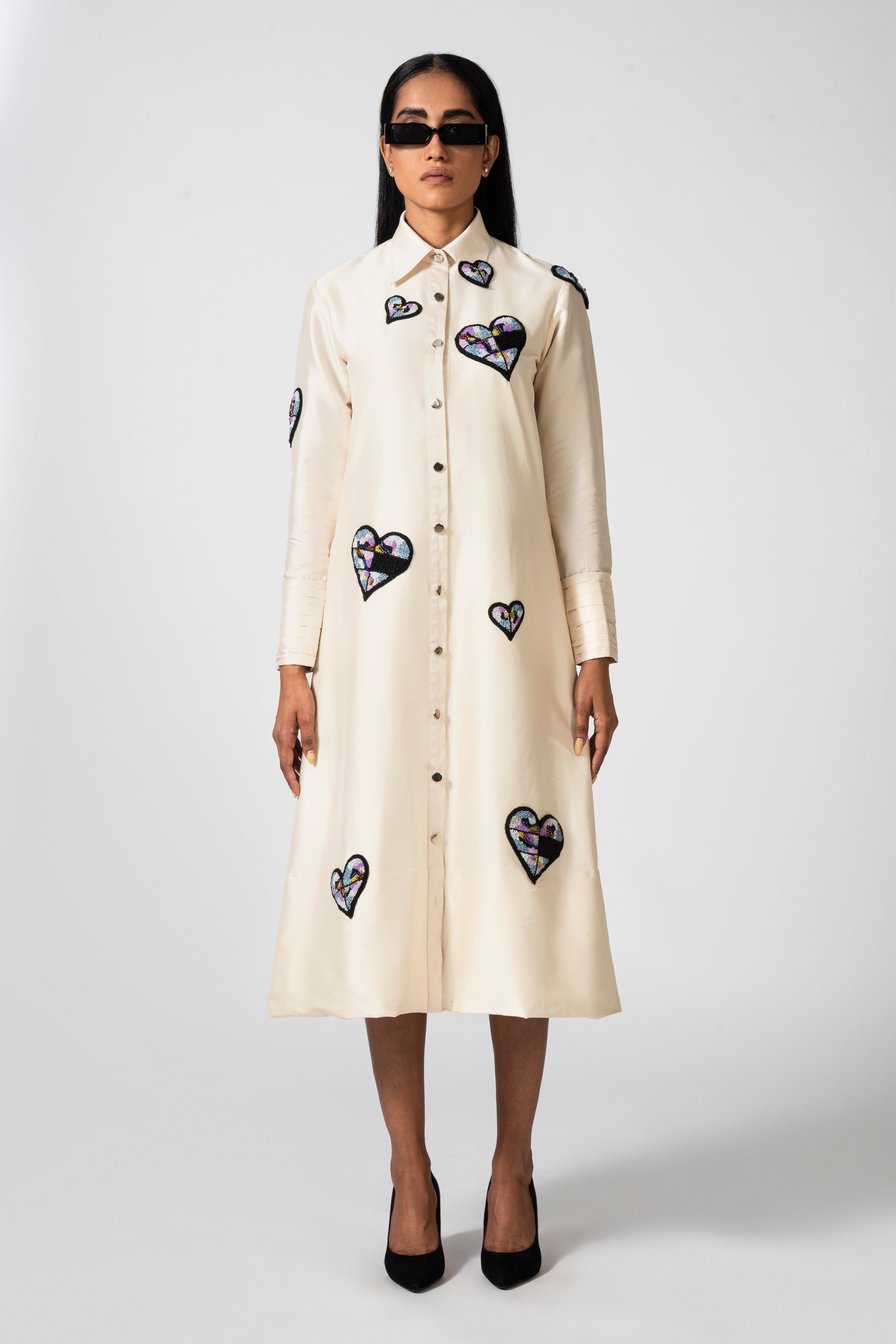 Indulge in opulence with our off-white midi shirt dress, intricately adorned with rising hearts embroidery. Embrace the epitome of sophistication and romantic allure in this enchanting ensemble.