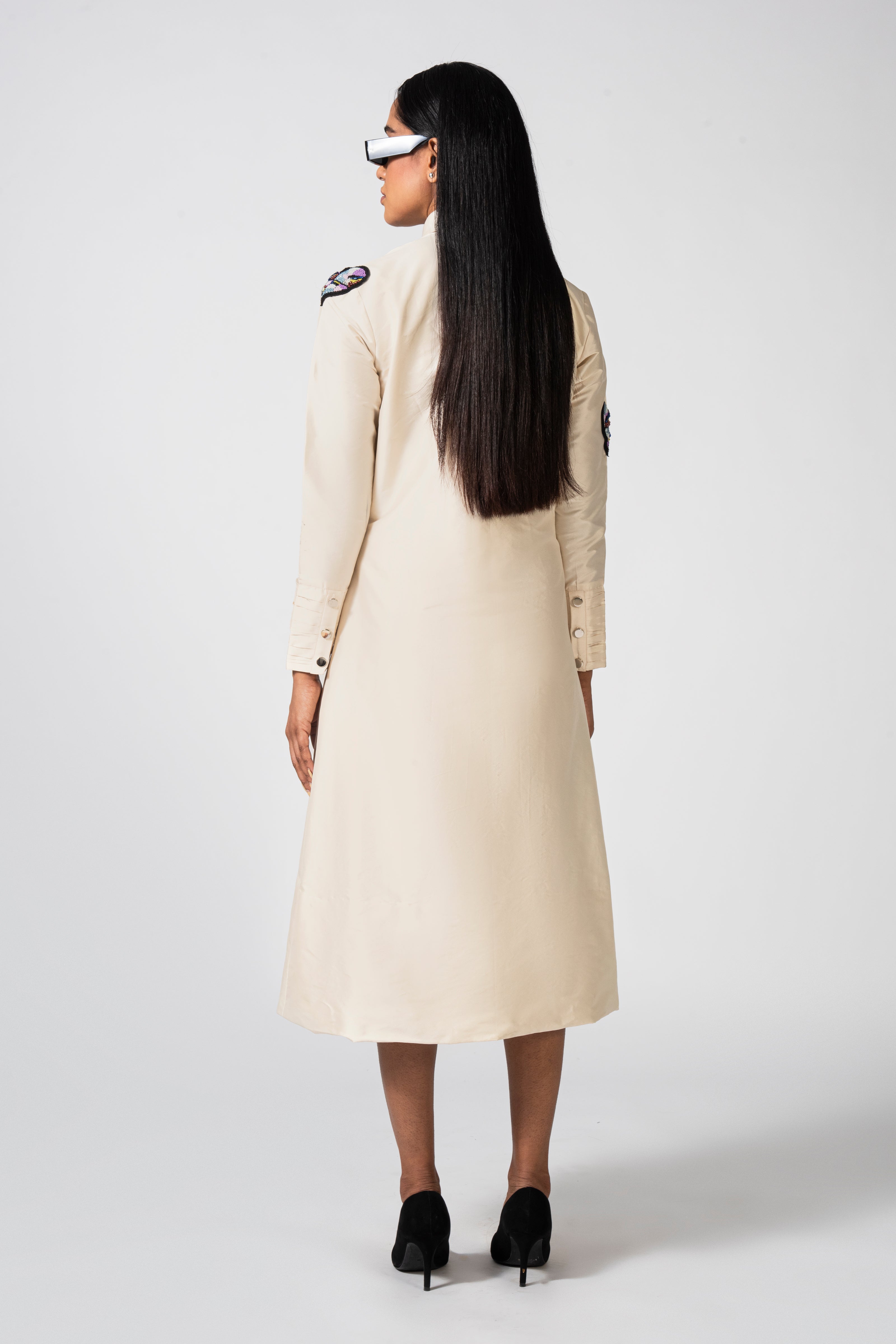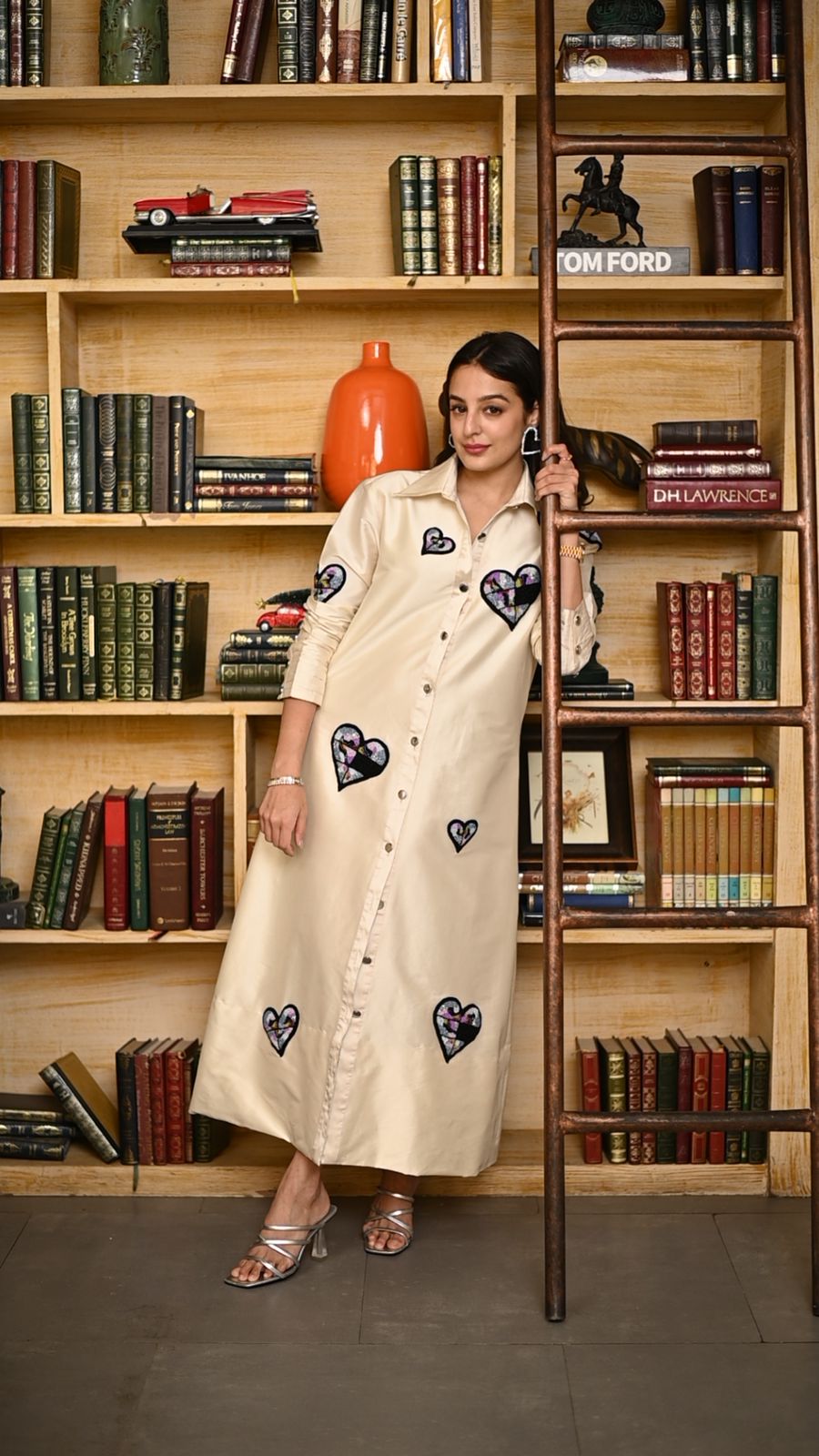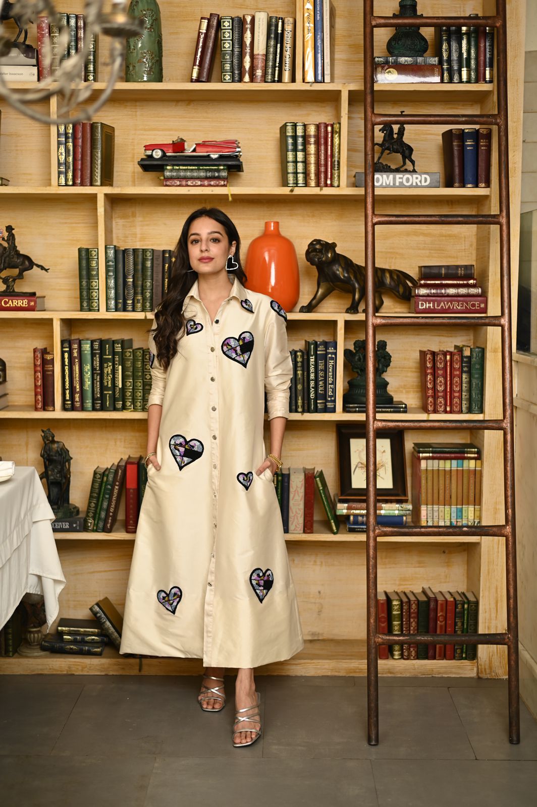 Indulge in opulence with our off-white midi shirt dress, intricately adorned with rising hearts embroidery. Embrace the epitome of sophistication and romantic allure in this enchanting ensemble.